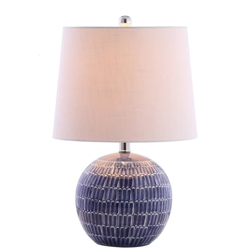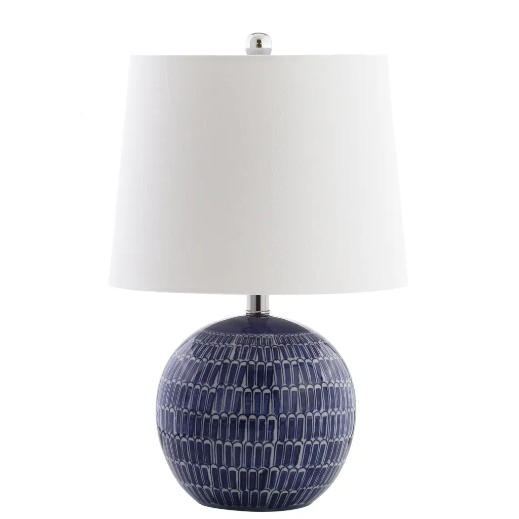 Featuring a slightly tapered drum shade, we love using a matching set of these round accent lamps to anchor each side of the bed. Simultaneously modern and traditional, the classic sphere shape gets a fun update in the hand-painted scallop pattern executed in a versatile indigo. Finished with a chrome finial and silk-wrapped cord, this versatile lamp is an instant classic.Features:Dimensions:About us:You see a lamp.We see a decorative work of art.A perfectly curved shade casts a dramatic shadow on a floor. A silk cord you never want to hide. LED lightbulbs: as easy on the environment as they are on the eyes. The JONATHAN Y Lighting collection considers every detail from impeccably sourced materials to designer styling. And our prices are so attractive, we've transformed a functional necessity into a fashion accessory.JONATHAN Y Lighting - a fashion revolution in home decor.
