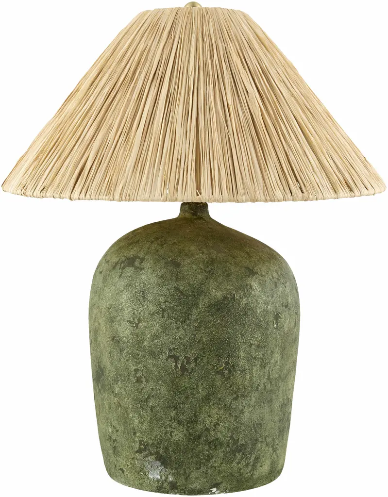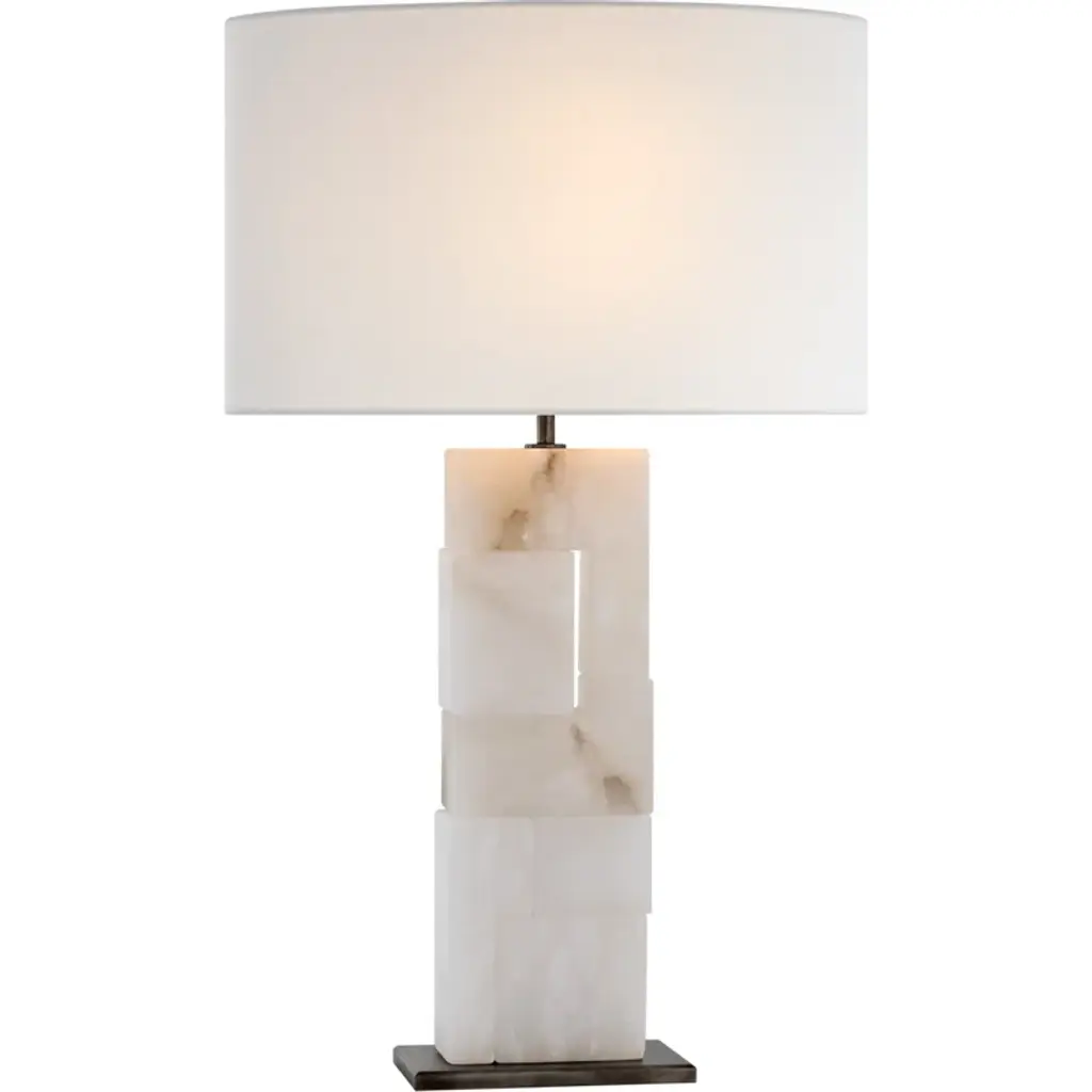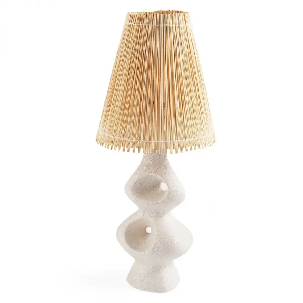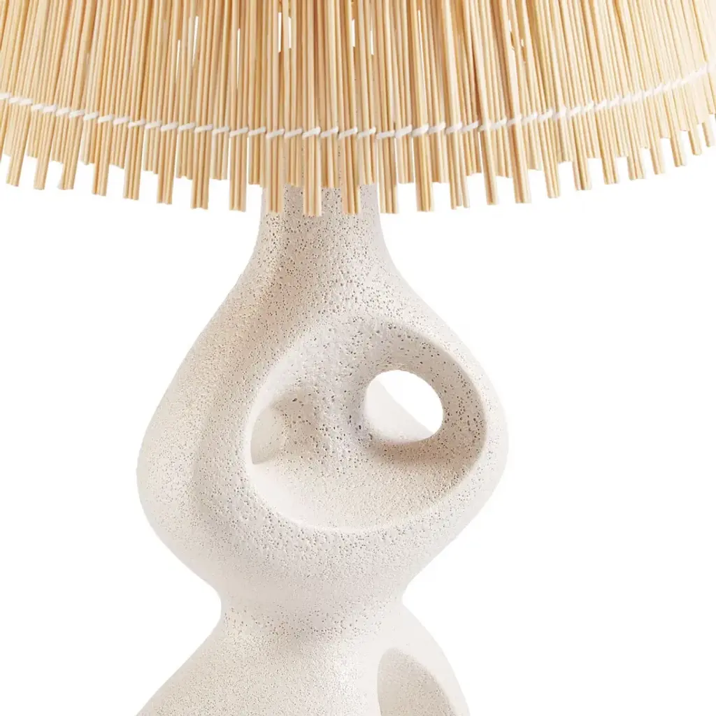 Softly Sculptural.We reimagined our Ronchamp Charles vase—inspired by the soaring organic modernist architecture of Le Corbusier's Ronchamp chapel—as a warm and natural table lamp. Featuring soft curves accentuated with a deep and bubbly, white lava glaze and topped with a staggered rattan shade accented with thick ivory thread. Intriguing and timeless at once.