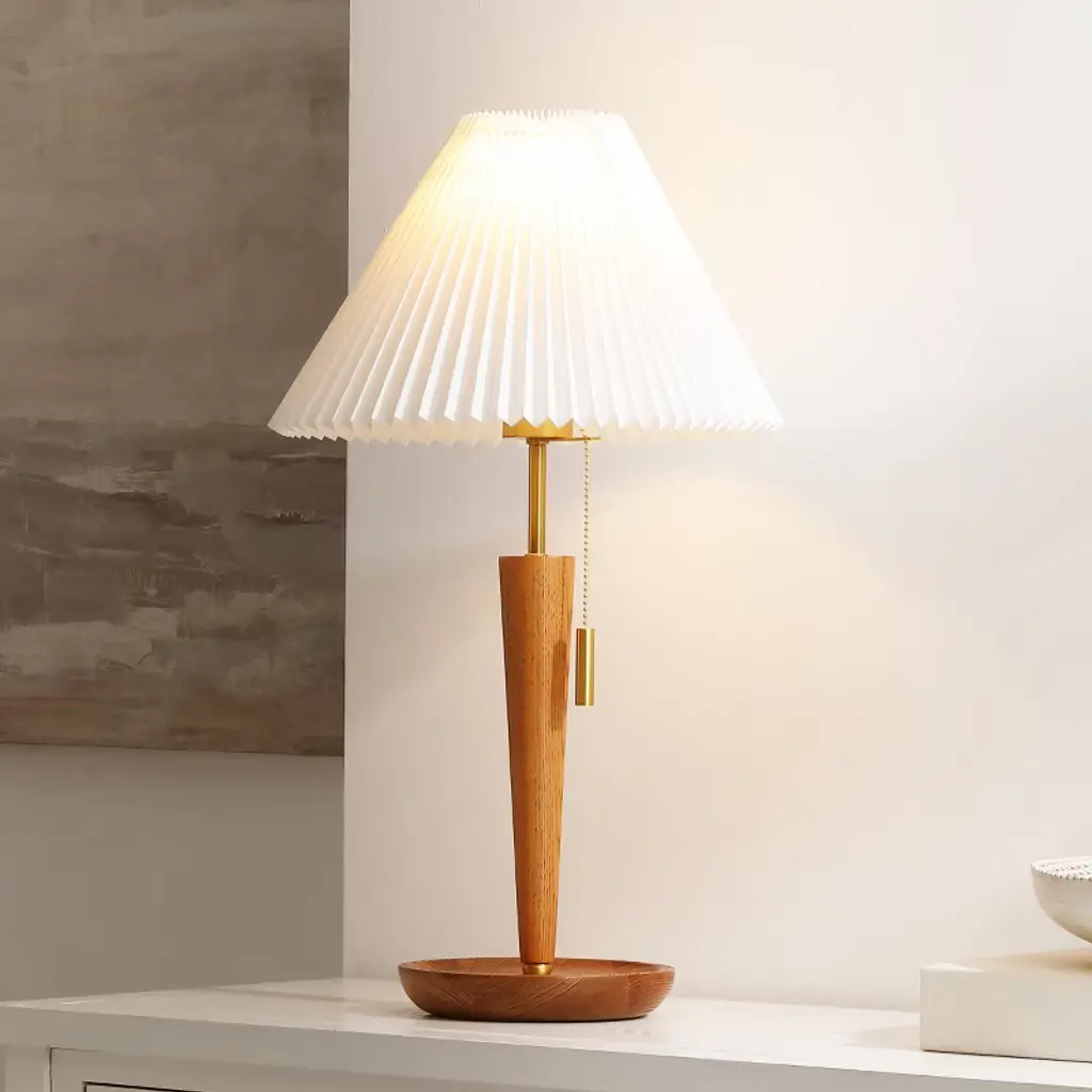 Introducing the Ronny Table Lamp, a harmonious blend of walnut and brass that brings a warm, inviting ambiance to any space. Crafted with a sturdy metal and wood body, this elegant table lamp is complemented by a soft, fabric shade that diffuses light beautifully, creating a cozy atmosphere. The lamp's dimensions ensure it is a perfect fit for a variety of settings. With an overall height of 23.5 inches, a shade diameter of 4.25 inches at the top, widening to 9.5 inches, and a base diameter of 7 inches, the Ronny fits seamlessly on end tables, nightstands, or office desks. Embrace the Ronny's timeless design that pairs the natural texture of wood with the subtle gleam of brass accents. Its user-friendly pull chain adds a classic touch for easy operation, confirming that style and convenience can coexist effortlessly. Whether illuminating a quiet reading nook or adding a touch of sophistication to your living room, the Ronny Table Lamp stands out as a tasteful addition to your home or office decor.