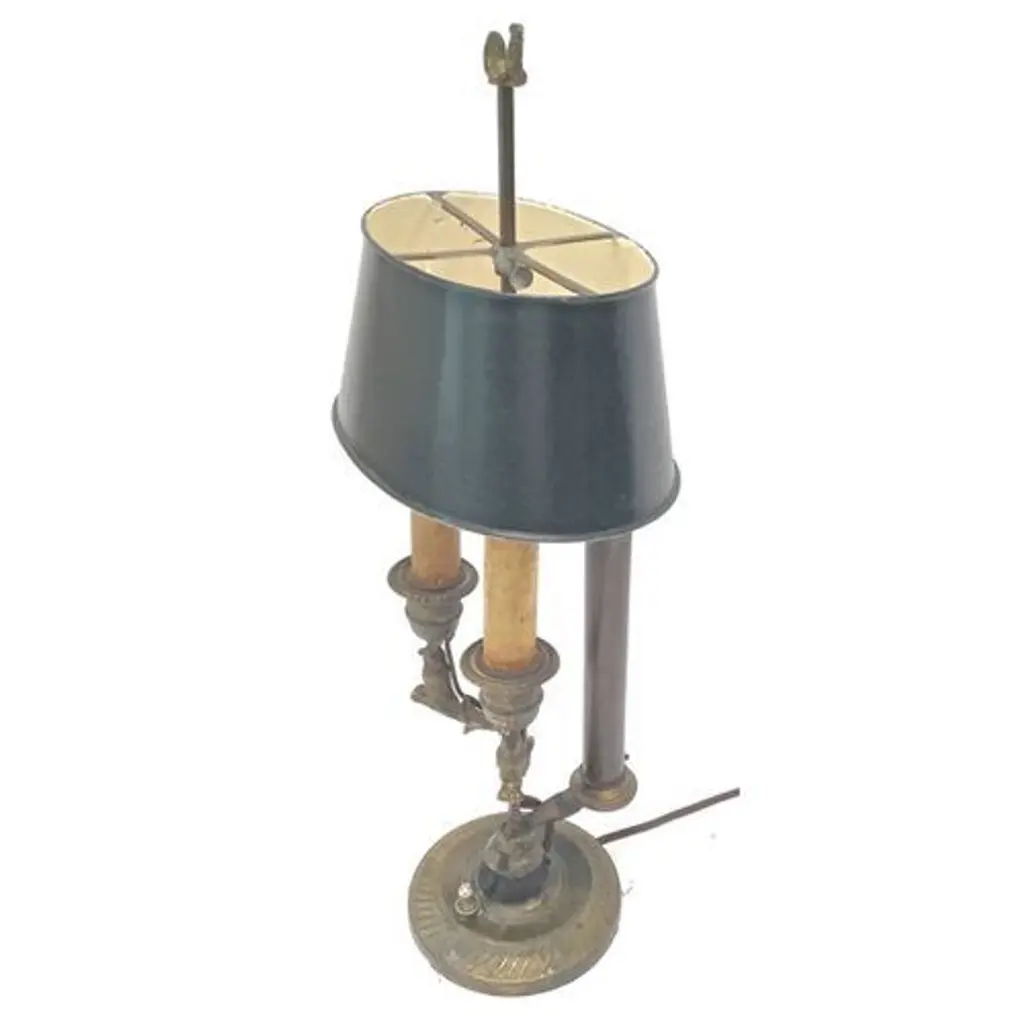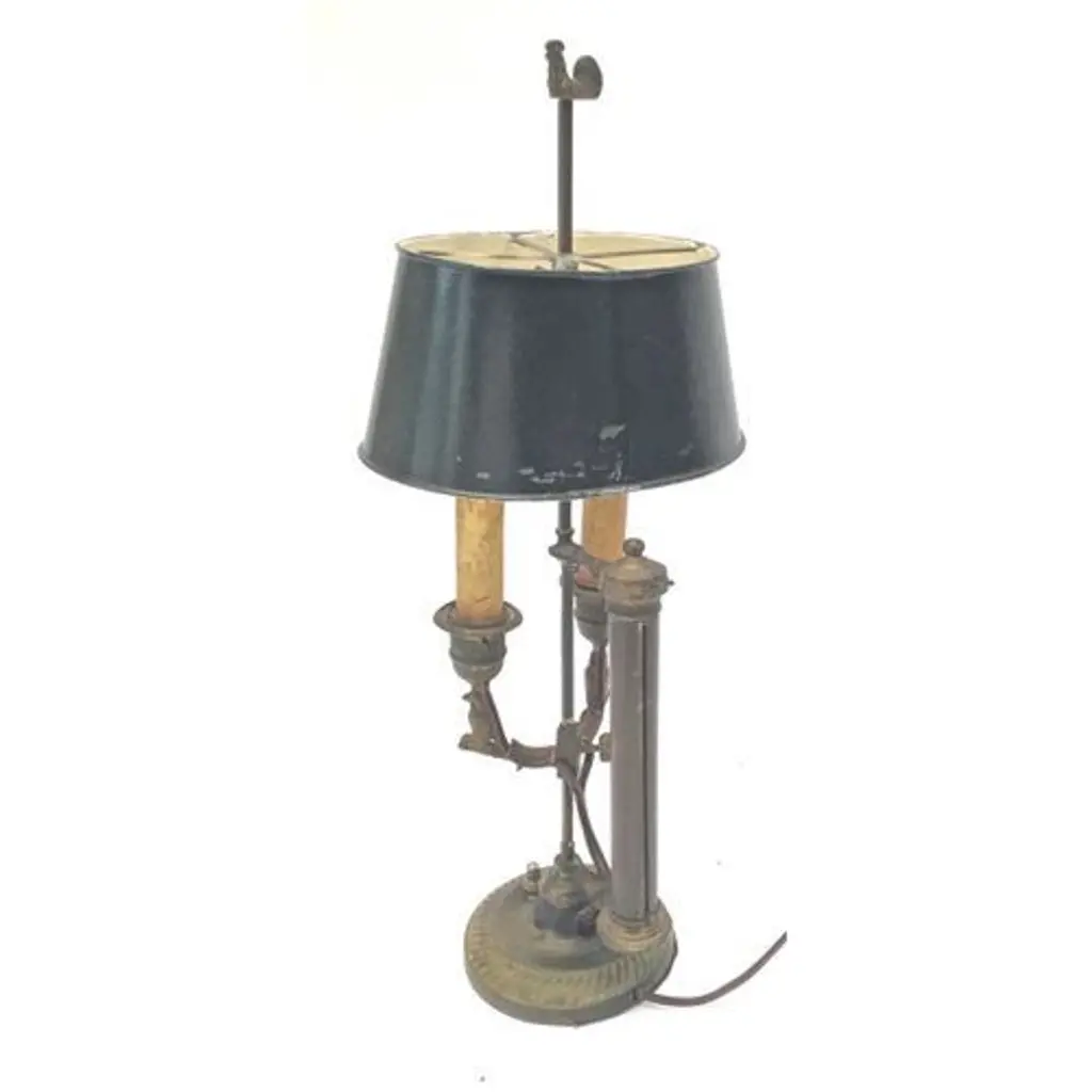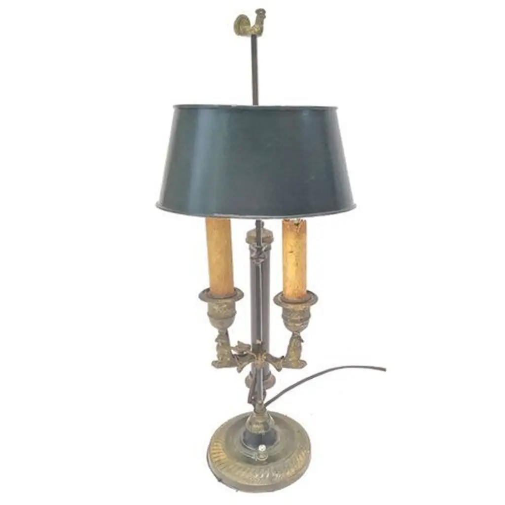 Early-19th-century Provençal double-arm brass bouillotte lamp with tole shade and rooster finial. Each arm has a small detailed chicken supporting the cross-hatched candle cup. Antiqued faux-candles and adjustable oval tole shade. In the back of the fixture is a lidded tube originally used to house a spare candle. Electrified and in working order; takes two 40W bulbs. No maker's mark. Some rust, tarnish, age wear. Shade measures: 7.5"L x 5"W x 3.5"H.