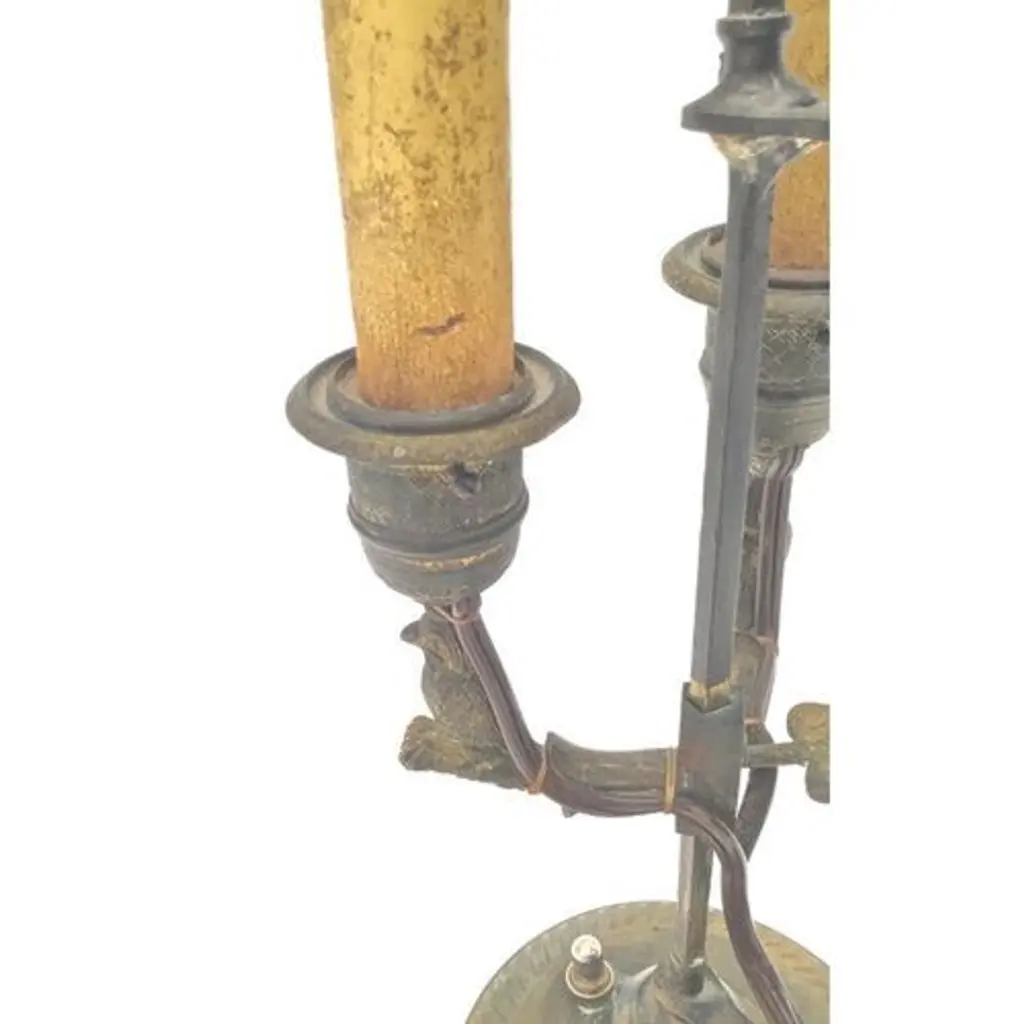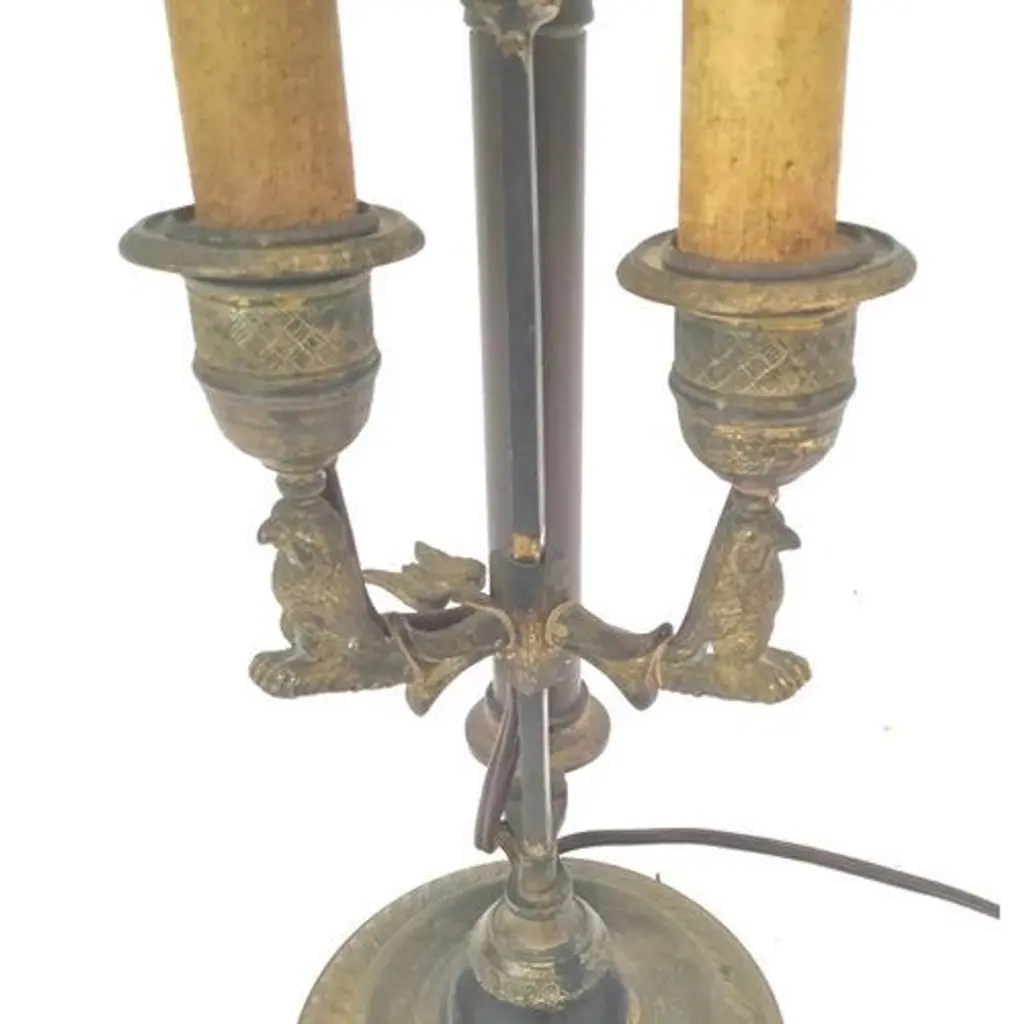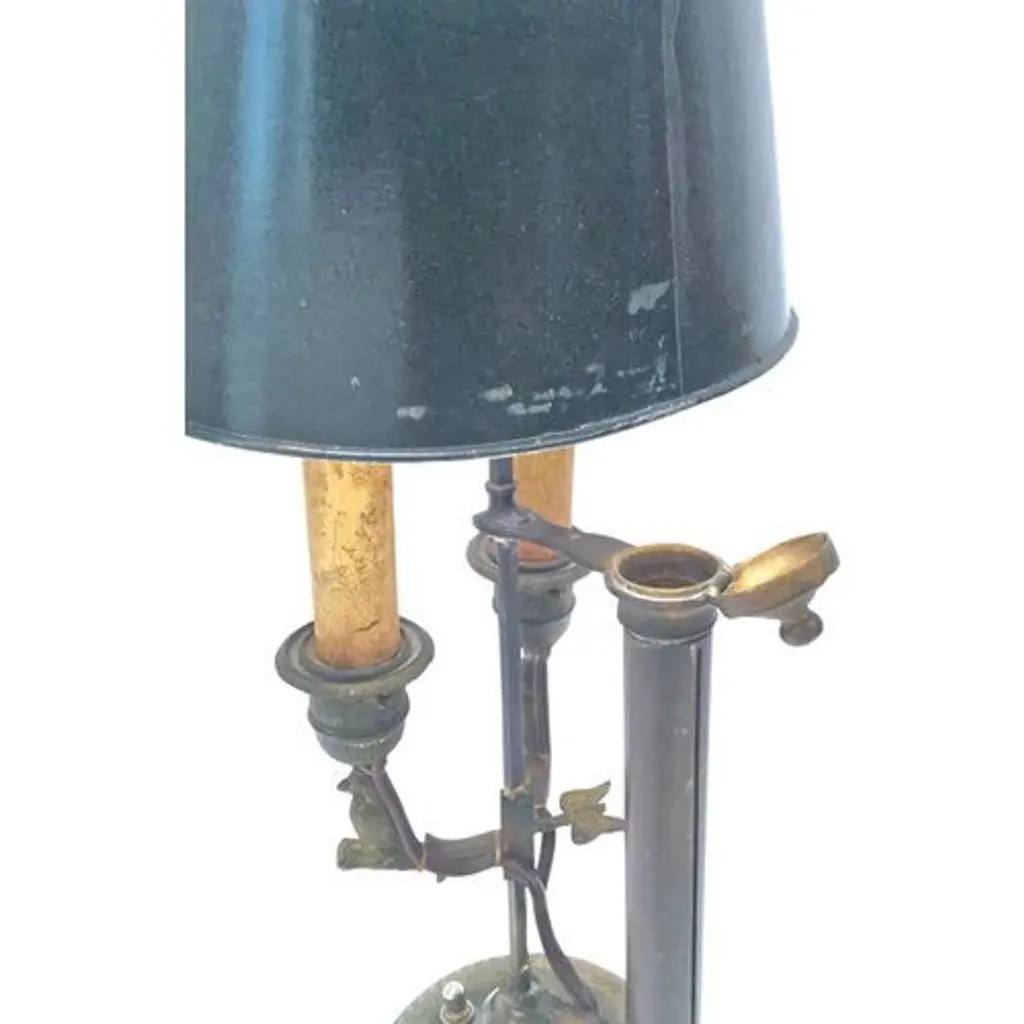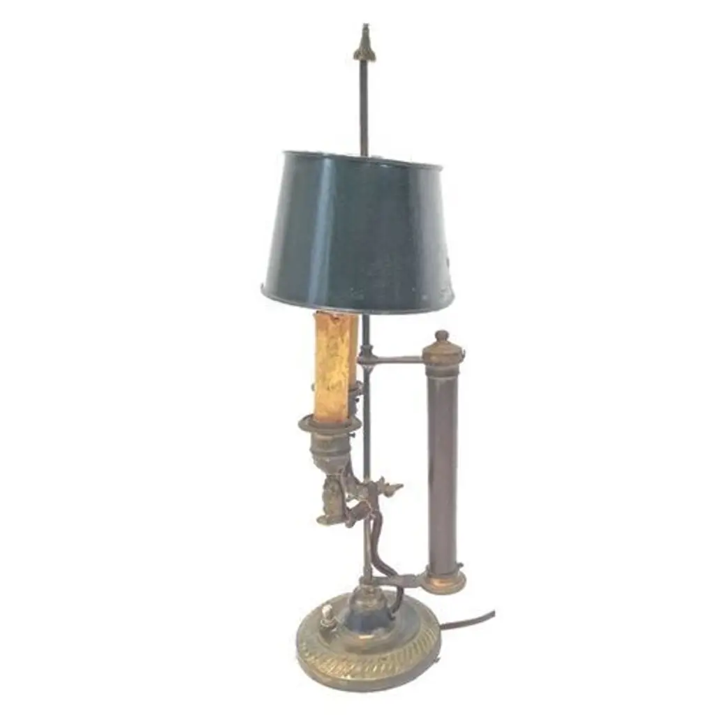Early-19th-century Provençal double-arm brass bouillotte lamp with tole shade and rooster finial. Each arm has a small detailed chicken supporting the cross-hatched candle cup. Antiqued faux-candles and adjustable oval tole shade. In the back of the fixture is a lidded tube originally used to house a spare candle. Electrified and in working order; takes two 40W bulbs. No maker's mark. Some rust, tarnish, age wear. Shade measures: 7.5"L x 5"W x 3.5"H.