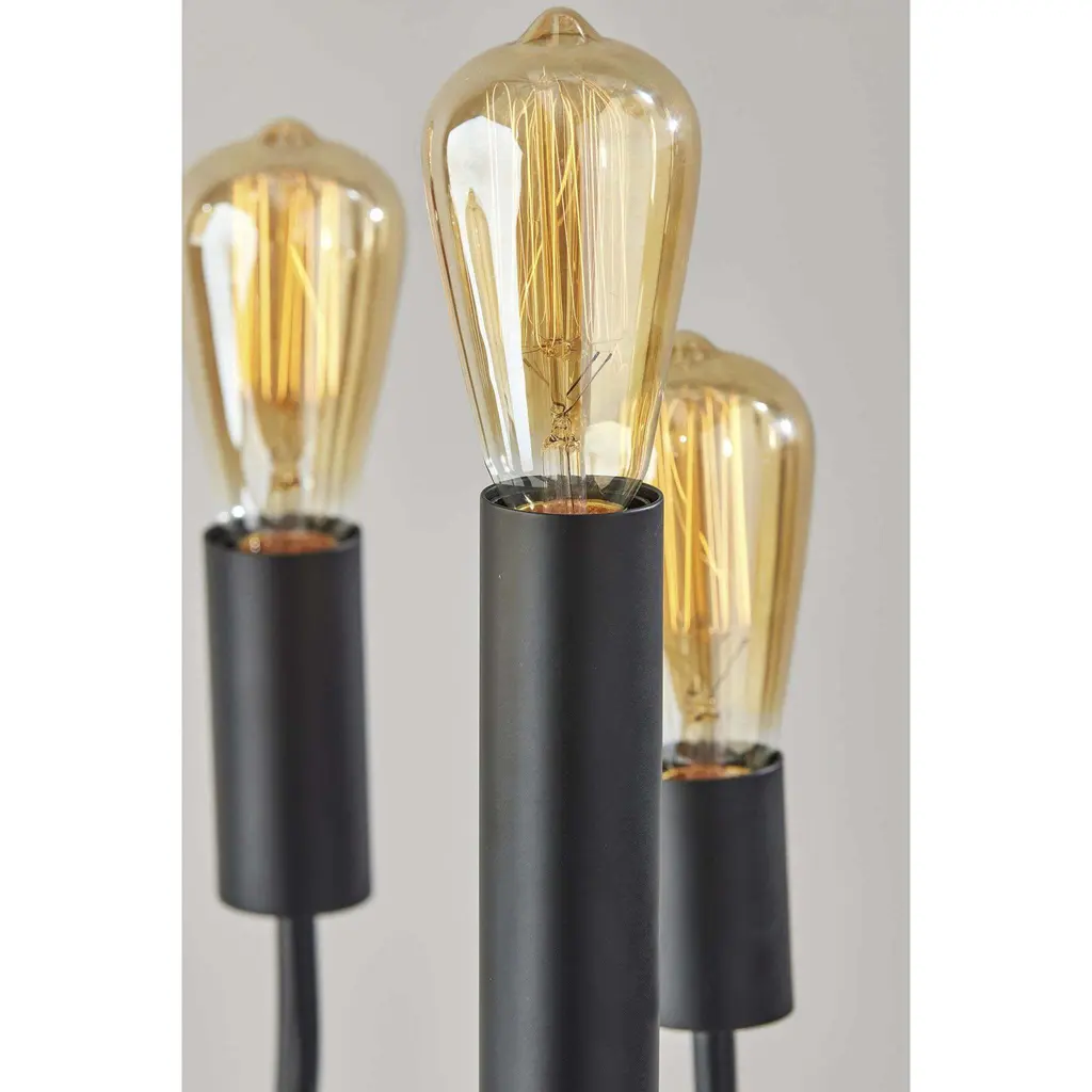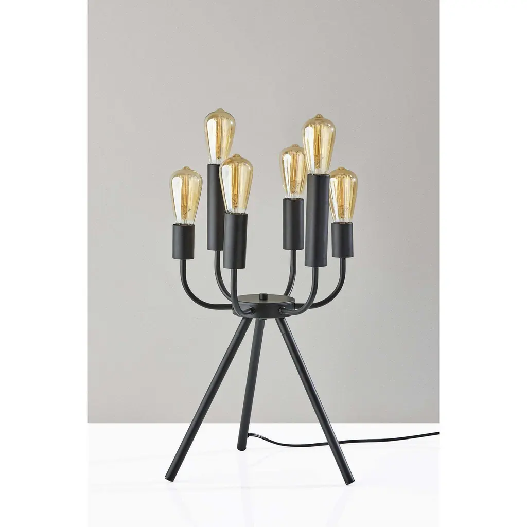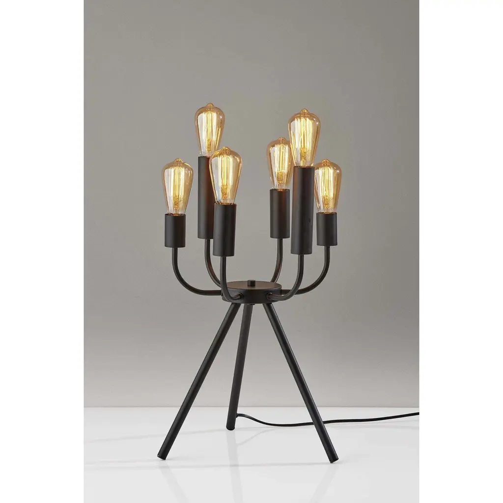 A modern reimagining of the classic candelabra, the 23.5" tall Rory table lamp transforms dining rooms, bedrooms, and living areas. Crafted of black metal, the style-driven design of the lamp complements mid-century modern, vintage, and industrial décor. Three slender poles form a sturdy triangle base topped by six slender, upwardly-curving arms of varying lengths. Each arm culminates in an exposed 40W bulb. Vintage Edison bulbs (not included) are a striking addition to the lamp's sculptural silhouette. The lamp is easily turned on and off with a discreet toggle switch and is powered by a 5' black cord. Complete your décor with the coordinating Rory floor lamp and pendant light.