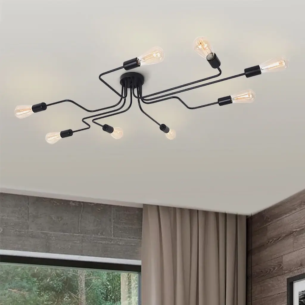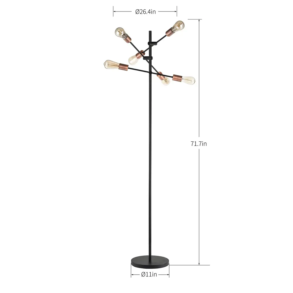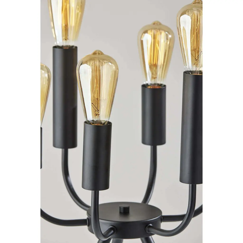 A modern reimagining of the classic candelabra, the 23.5" tall Rory table lamp transforms dining rooms, bedrooms, and living areas. Crafted of black metal, the style-driven design of the lamp complements mid-century modern, vintage, and industrial décor. Three slender poles form a sturdy triangle base topped by six slender, upwardly-curving arms of varying lengths. Each arm culminates in an exposed 40W bulb. Vintage Edison bulbs (not included) are a striking addition to the lamp's sculptural silhouette. The lamp is easily turned on and off with a discreet toggle switch and is powered by a 5' black cord. Complete your décor with the coordinating Rory floor lamp and pendant light.