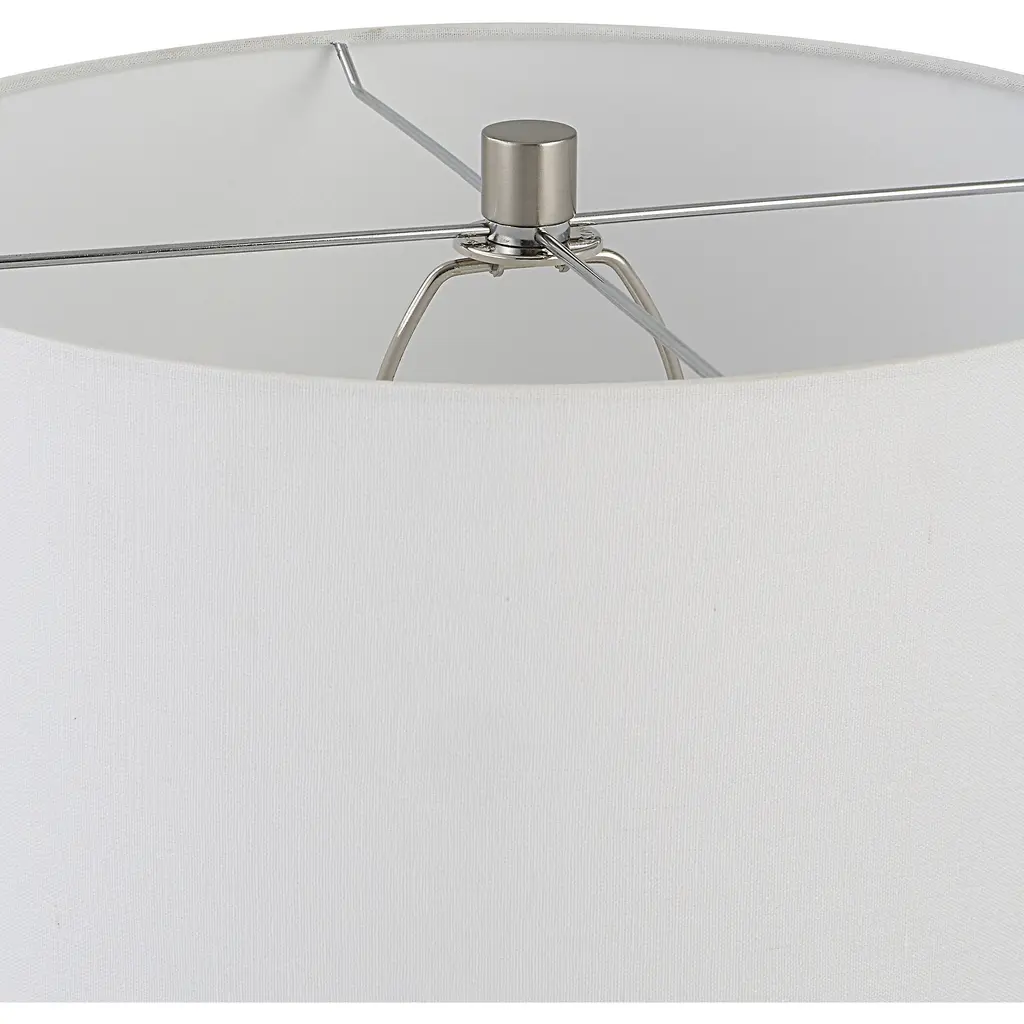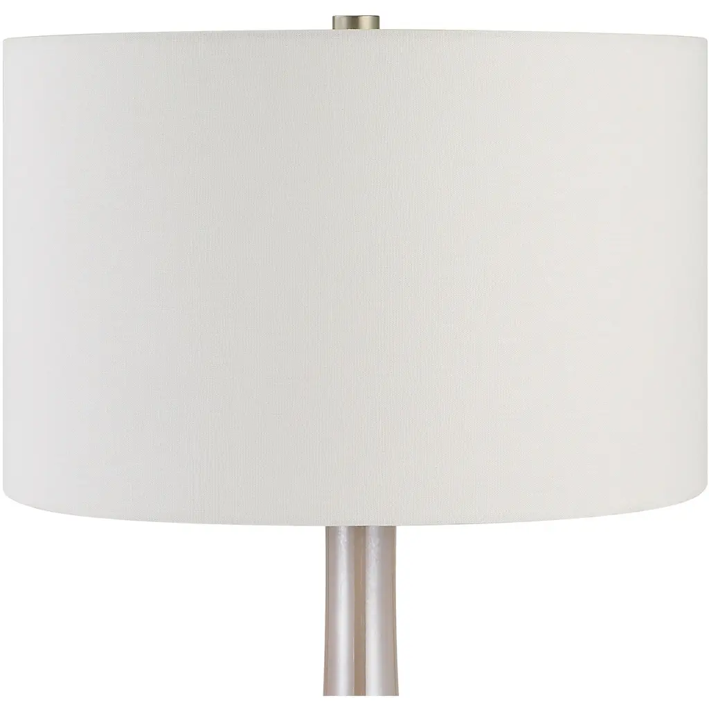 Elegant And Sophisticated, The Rosa Table Lamp Showcases A Light Blush Pink Glass Base With Brushed Nickel And Crystal Details. The Hardback Drum Shade Is Covered In A White Cotton Fabric.