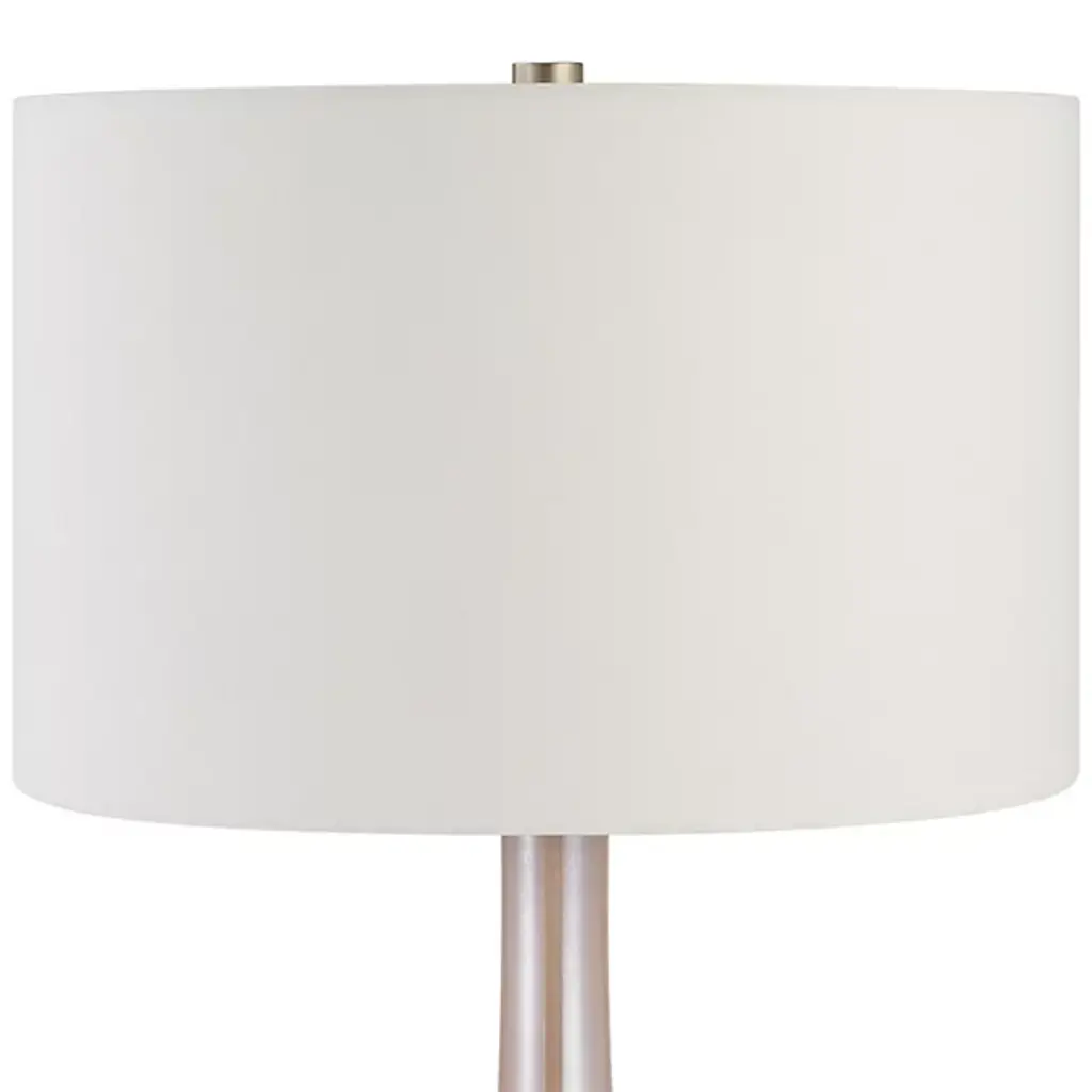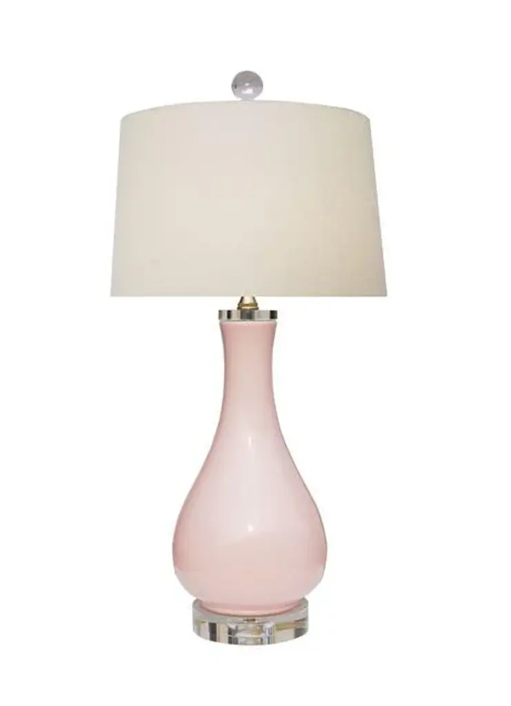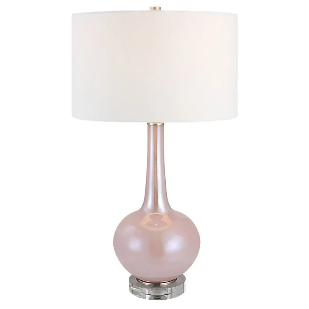 Graceful and warm-toned like a beautiful rose. The Rosa Table Lamp from Uttermost captures one’s imagination with a round artisanal body covered in crisp highlights. The glass body stands tall as a bulbous form, pointing the eyes directly at the elegant shade above. The hardback shade keeps it classic as a drum form. Light filters gently out the shade and streams through its openings to warmly glaze the body below.