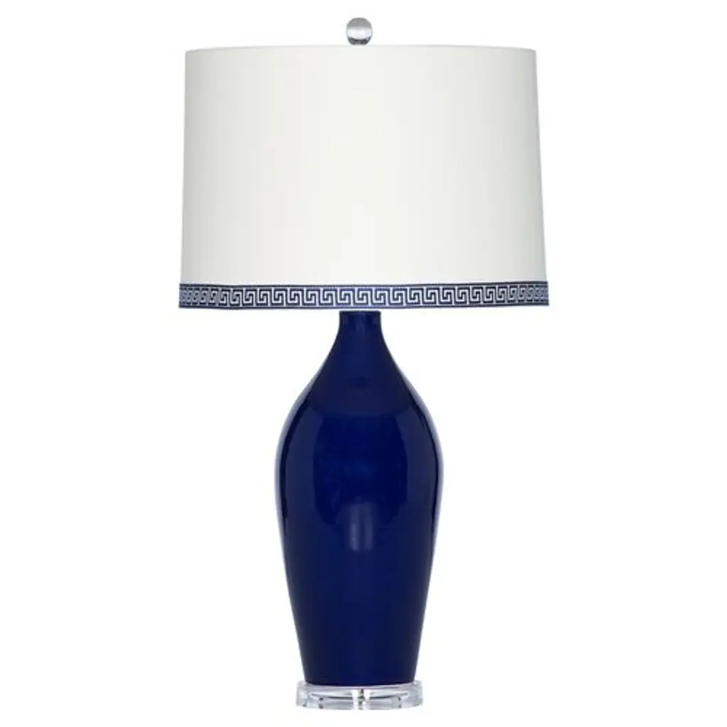 This handcrafted Tuscan lamp is crafted of porcelain and finished in a deep navy glaze. A hardback drum shade in cream linen with a navy Greek key trim adds a hint of worldly appeal.