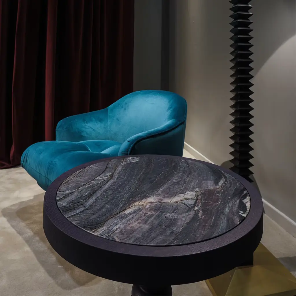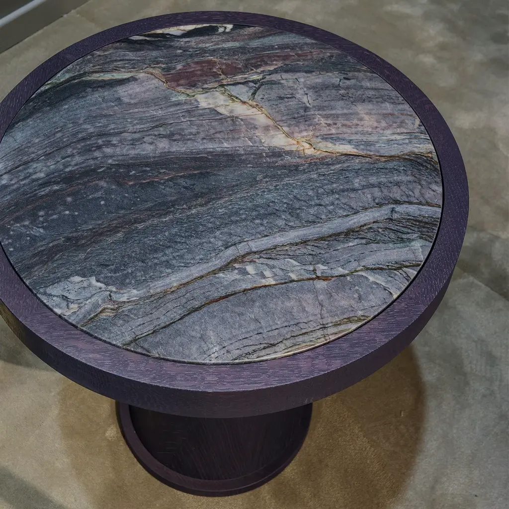 Ideal as a base for a table lamp to set by a sofa or an armchair, this side table combines classic elements with a contemporary aesthetic, for a timeless look that will equally complement a modern and a traditional setting. The structure is entirely crafted of wood with turned column made of conical and spherical elements supporting the mounting of the top, which is in Explosion Blue marble with a grey lava finish.