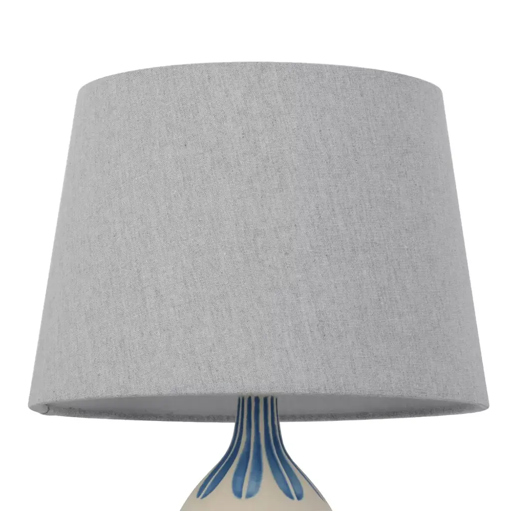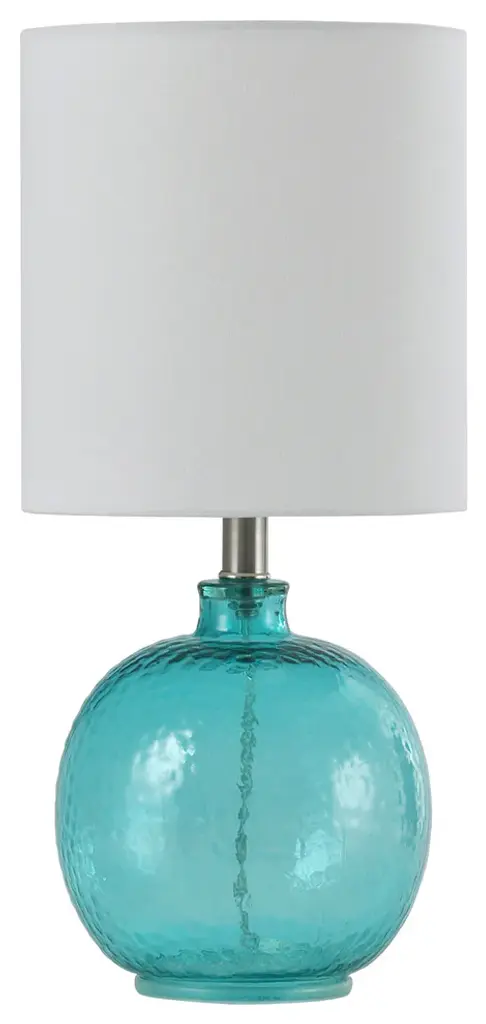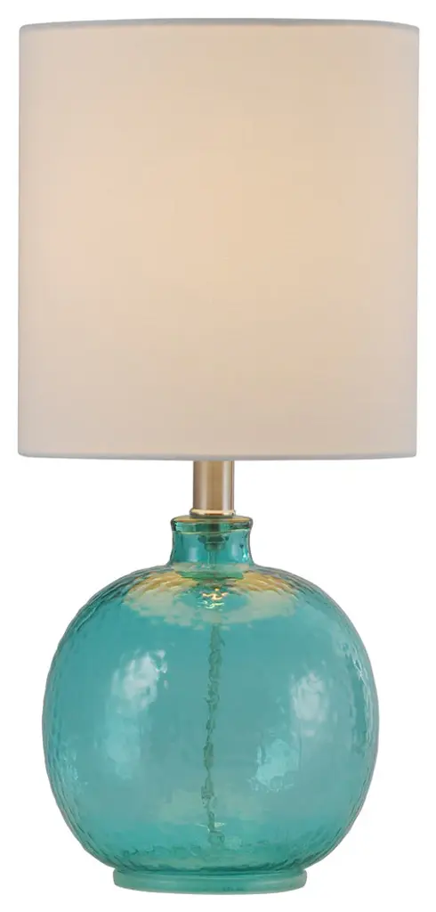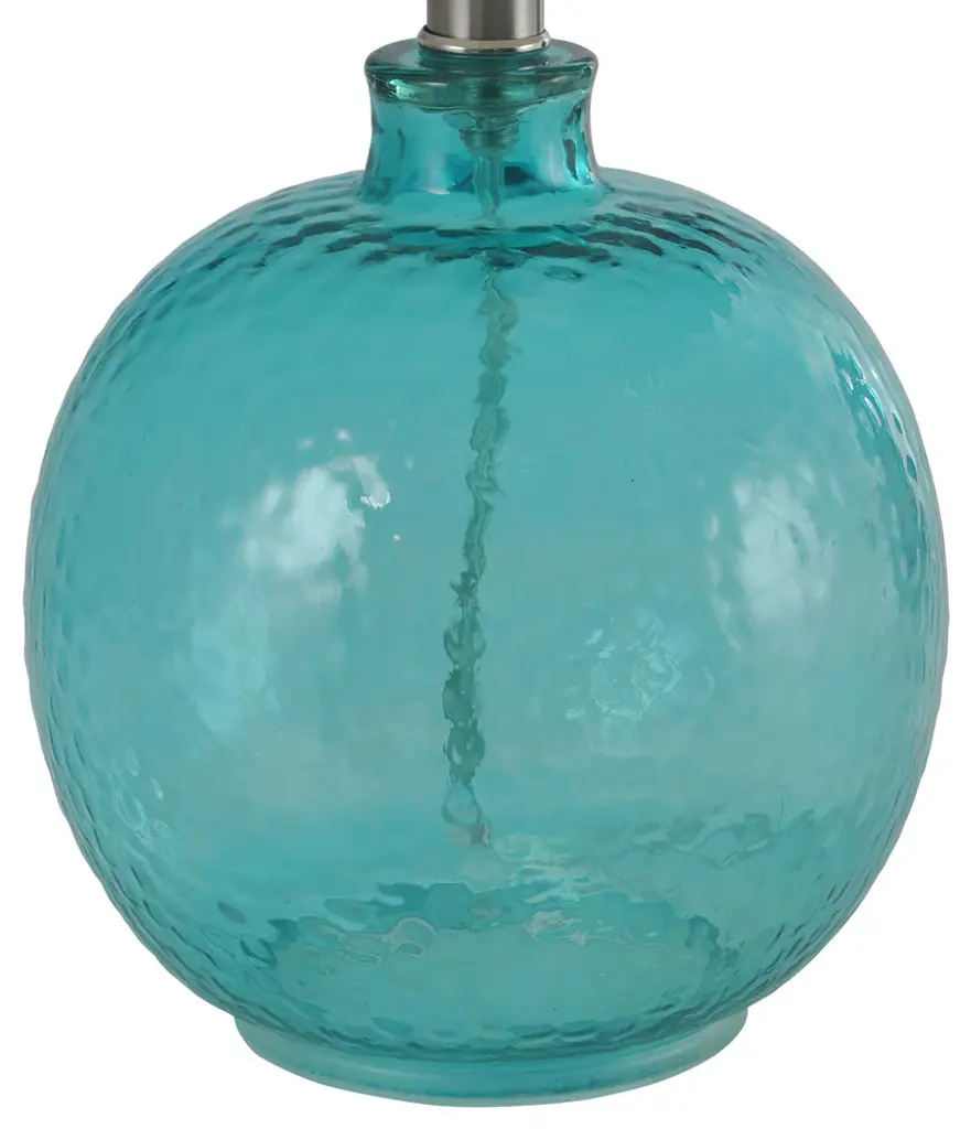 This glass table lamp brings a touch of antique beauty to any master suite. The translucent finish brings a fun, exciting quality to the fixture. The shade is constructed from white fabric and complements the glass body.Features: A handpainted finish means each piece is unique, with possible slight variations. No two lamps are exactly alike.Finish: CeruleanShade Finish: WhiteMaterial: GlassShade Material: Hardback FabricShade Fitter Type: UnoLength: 9.5 inchesWidth: 9.5 inchesHeight: 20 inchesVoltage: 120VWattage: 60Lamp Base Dimensions: Body: 9"H x 7.5" Dia.; Base: 0.25"H x 4.5" Dia.Safety Rating: Dry Location - This item is rated for dry locations, meaning it can be used in an indoor area that is not normally subject to dampness. May include a location subject to temporary dampness provided ventilation is adequate to prevent any accumulation of moisture such as the bathroomBulb(s) Included: NoBulb Type: IncandescentNumber of Bulbs: 1Disclaimer: This item contains no harp or finial.Due to lighting and monitor differences, actual colors and finishes may vary slightly from what appears online.