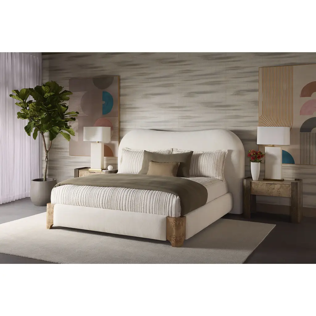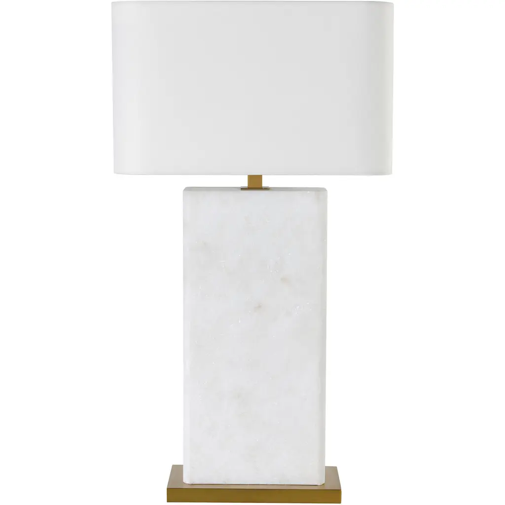 The Rovira Table Lamp is an artful examination of the beauty of natural stone. A thick, hand carved panel of alabaster imported from Spain is displayed on top of a brushed gold iron base for a dazzling design. An off-white linen shade complements the look. The translucent nature of alabaster allows light to flow through, emitting a soft ambient glow. When lit, this design truly comes to life. As alabaster is a natural material, unique veining and colour variations are all characteristics that add to the uniqueness and beauty of each piece.