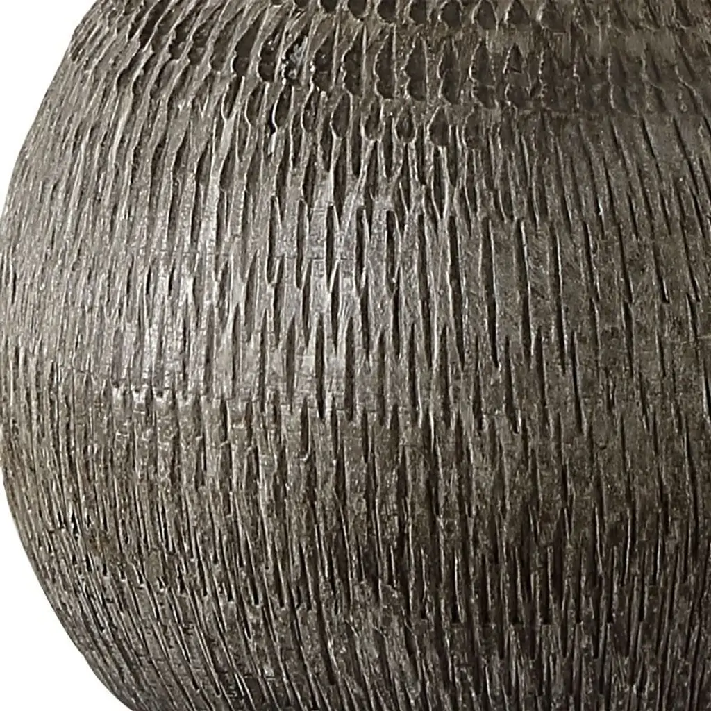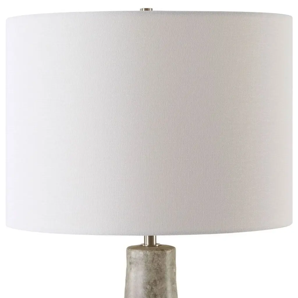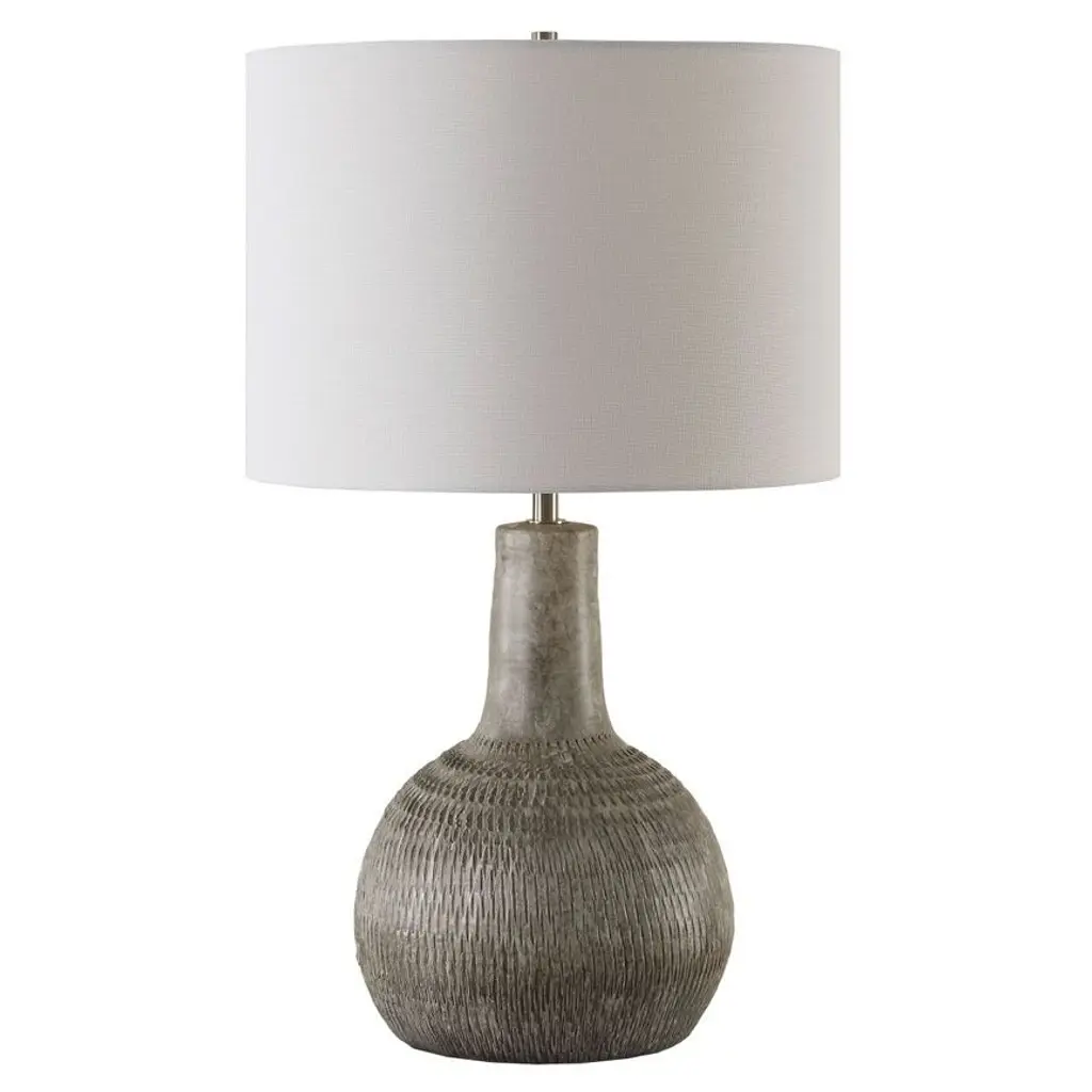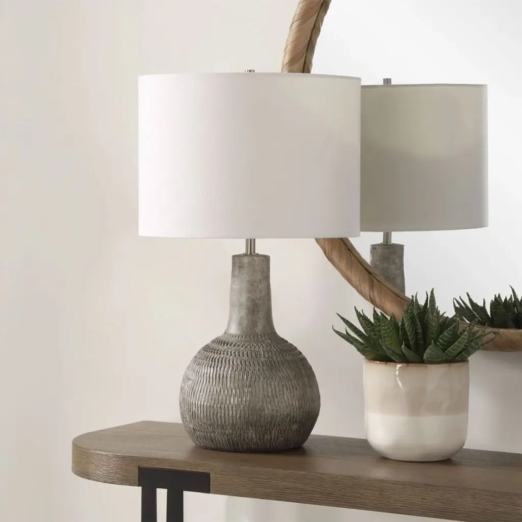 Rowan Table Lamp. This heavily textured, gourd-shaped ceramic table lamp is finished in ivory with aged black undertones. The unique shape and finish are complemented by brushed nickel accents and a round, hardback, off-white linen shade. Matching pieces sold separately. Fully assembled. Manufacturer: Kalalou.
