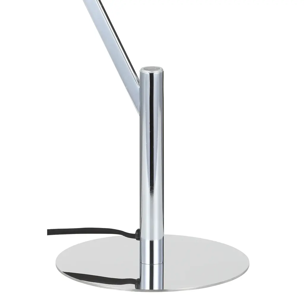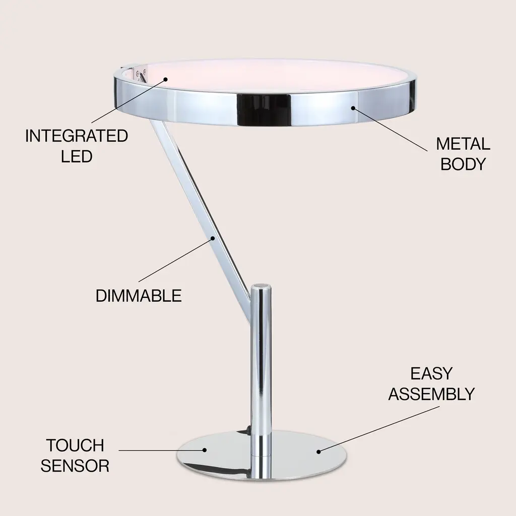 This chrome, contemporary piece is a sleek source of focused light. Its integrated LED light and touch sensor make it energy-efficient and easy to use. At 18" high, its small scale makes it easy to add to any room or workspace.Features:Dimensions:About us:You see a lamp.We see a decorative work of art.A perfectly curved shade casts a dramatic shadow on a floor. A silk cord you never want to hide. Compatible with LED lightbulbs: as easy on the environment as they are on the eyes. The JONATHAN Y Lighting collection considers every detail from impeccably sourced materials to designer styling. And our prices are so attractive, we've transformed a functional necessity into a fashion accessory.JONATHAN Y Lighting - a fashion revolution in home decor.