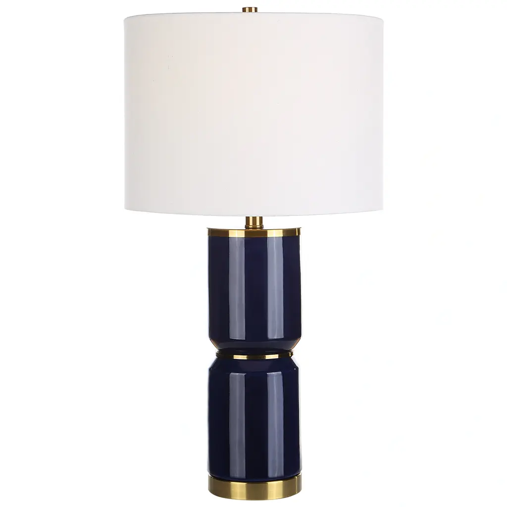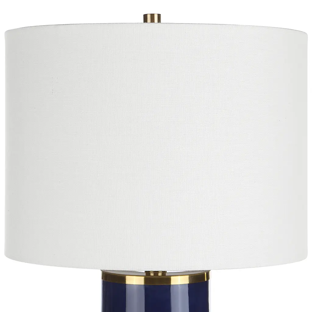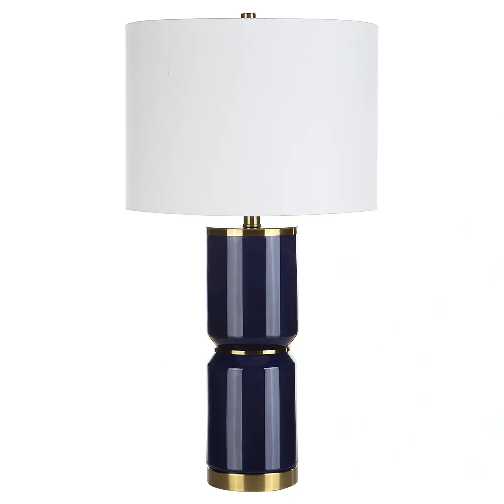 This beautiful royal blue ceramic table lamp, accented in antique gold, sits atop a metal base. A thin metal band softens the wide cylinder body. A round hardback white linen shade completes the look and makes this a perfect lamp for a nightstand or on an end table in a family room. Features: Set includes: One (1) table lamp Material(s): Ceramic, Metal, Fabric Royal blue glaze with antique gold accents Drum hardback shade Dimensions: Overall dimensions: 15 inches wide x 26.25 inches high x 15 inches deep Item weight: 6.6 lbs This product will ship to you in one (1) box.WARNING: This product can expose you to chemicals including nickel which is known to the State of California to cause cancer. For more information, go to www.P65Warnings.ca.gov/furniture.