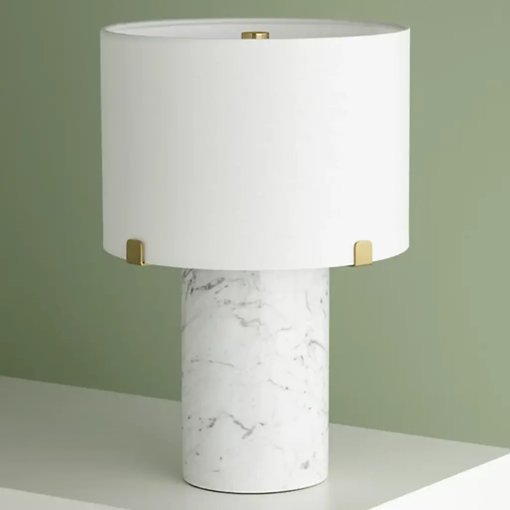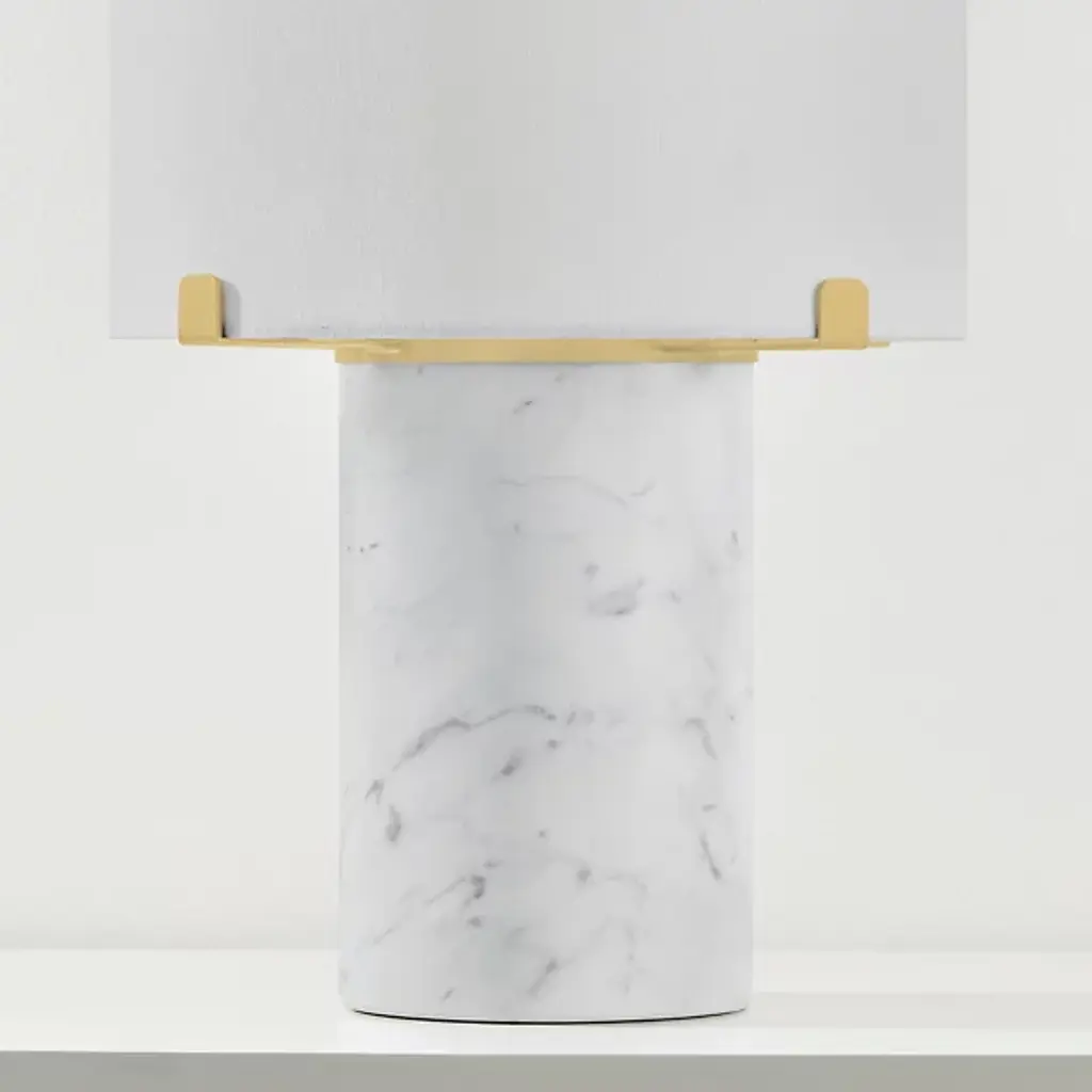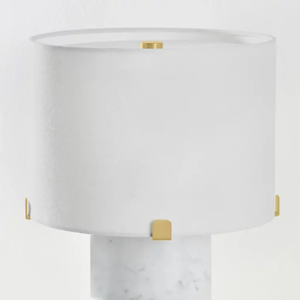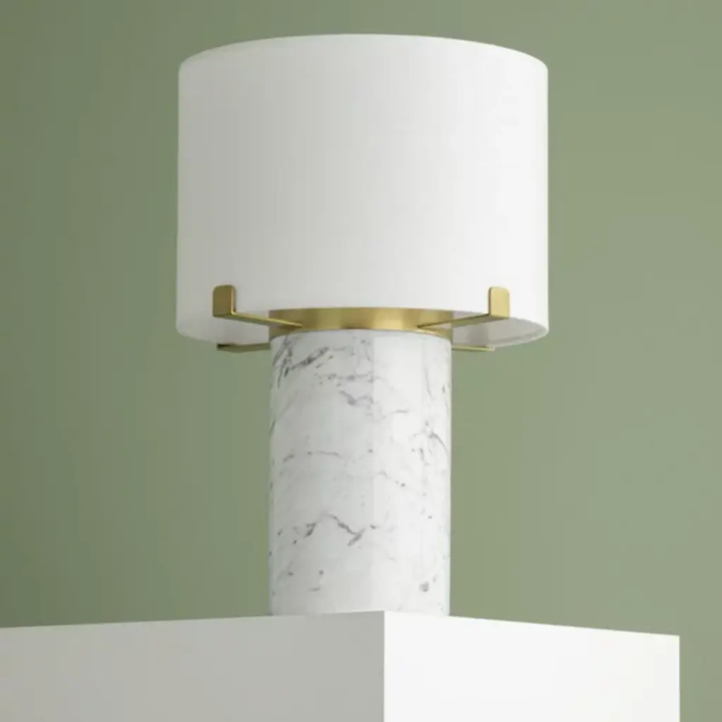 The Rumi Table Lamp from Mitzi showcases high design in a compact, transitional style. Made from natural Carrara marble, its bold, modern base draws attention with delicate natural veining, leaving no two fixtures alike. The hazy linen drum shade softens the sophisticated stone, supported by slender clasps, adding a welcome refinement touch. Perfect for making an elevated statement on an office desk or bedside table, this petite lamp combines timeless elegance with rich, modern charm.
