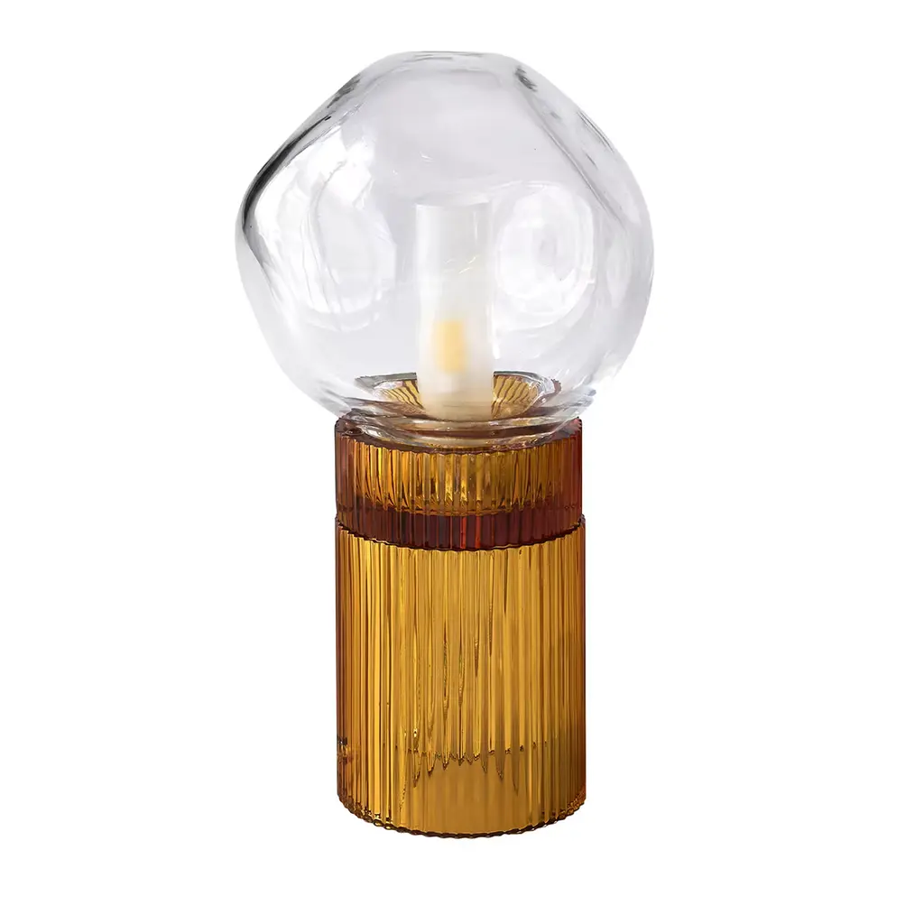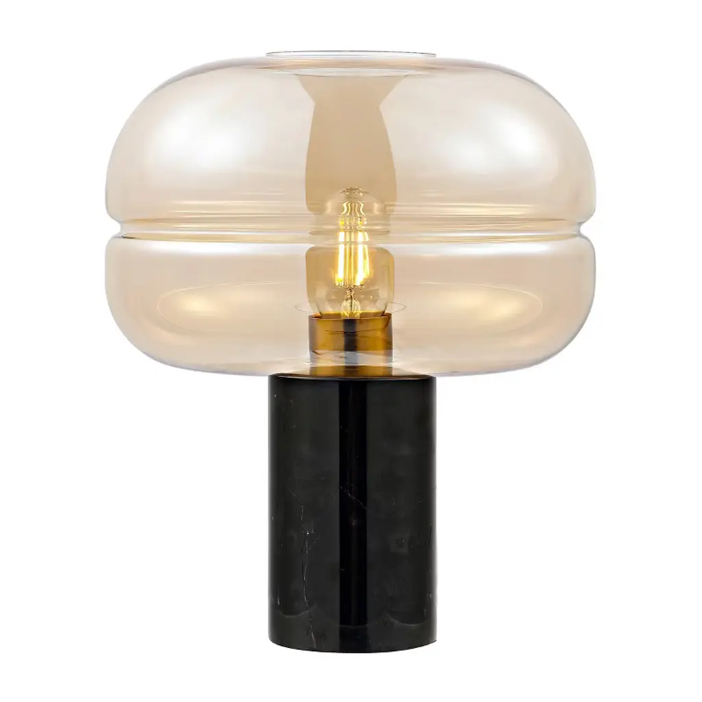 Strike a visual impact with our radiant and stylish Runa table lamp. Showcasing a striking glass shade and mix-material elegance, our table lamp offers stylish impact in any corner. The glass shade features swelLED, eye-catching proportions and hand-blown appearance to make a striking statement. It is elevated upon a clean-lined black marble base to add a glamorous and polished touch to any corner. Our style-forward lamp features an amber glass shade to lend a warm and radiant light anywhere in your bedroom, lounge, or home office. Care Instructions: Before cleaning any lamp shade or fixture, disconnect the power source. Wipe with�a soft, dry cloth. Avoid the use of chemicals and household cleaners as they may damage the finish.