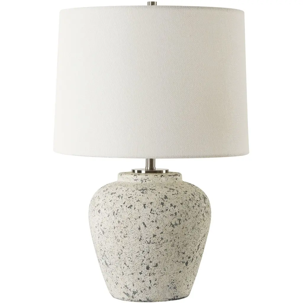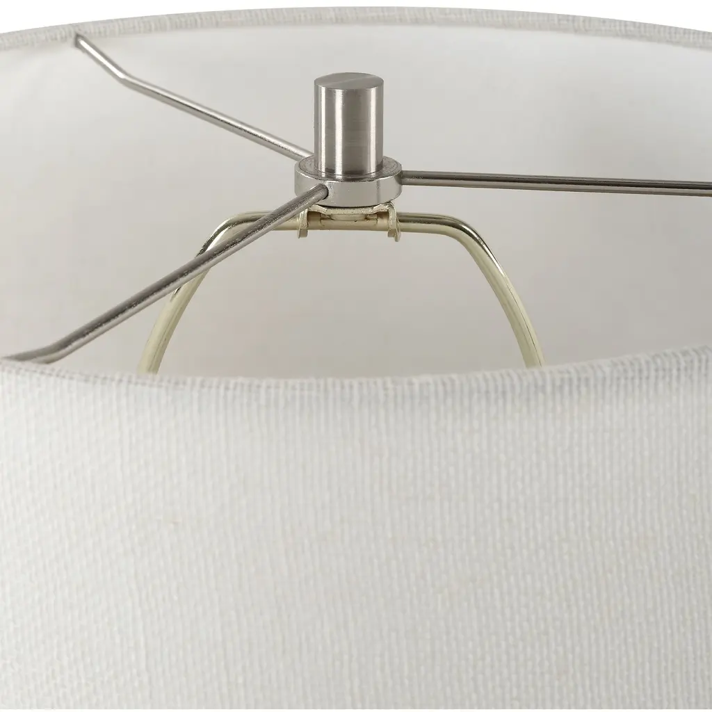 The Rupture Table Lamp Features A Heavily Distressed Aged Ivory Finish With Stone Gray Undertones And Subtle Texture, Accented With Brushed Nickel Plated Details. The Slightly Tapered Round Hardback Shade Is A Crisp White Linen Fabric.