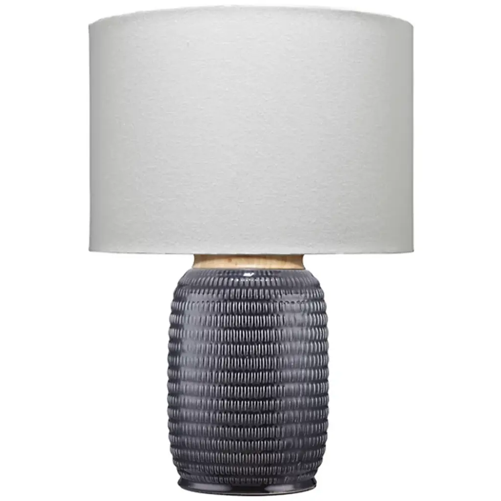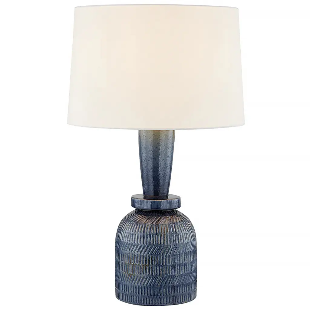 In both form and finish, Russo provides a playful take on a ceramic table lamp. Its geometric silhouette is brought to life with a cobalt glaze that has been hand-etched with a textural marking pattern. A large white linen drum shade balances the artisanal base with unexpected proportions. Part of our Mandy Cheng collection.