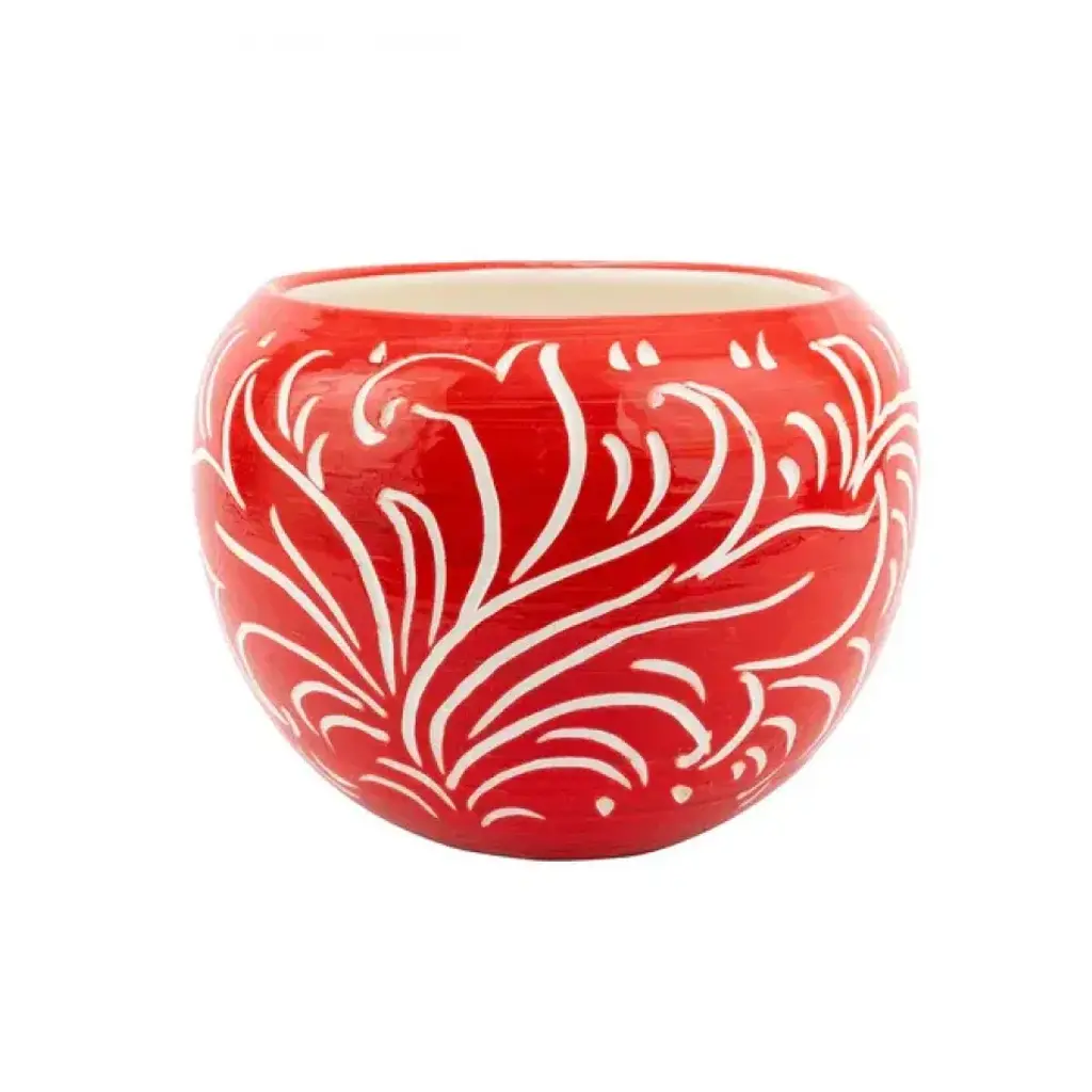 Handcrafted in Tuscany from terra bianca, the Rustic Garden Blue Scroll Small Round Cachepot was inspired by the intricate scroll designs found on religious vestments and tapestries throughout Italy. The planter features a vibrant shade of blue with hand drawn scrolls, and is a perfect vessel for showcasing your favorite plants. Since 1983, Vietri has specialized exclusively in Italian handcrafted ceramics, stainless and pewter flatware, mouth blown glassware, lamps, urns and planters. Families of artisans with 3 or 4 generations of history create these special pieces using centuries-old techniques. The subtle color from a paintbrush and the curving stroke of the artist's hand are never repeated in quite the same way, making each piece truly unique.