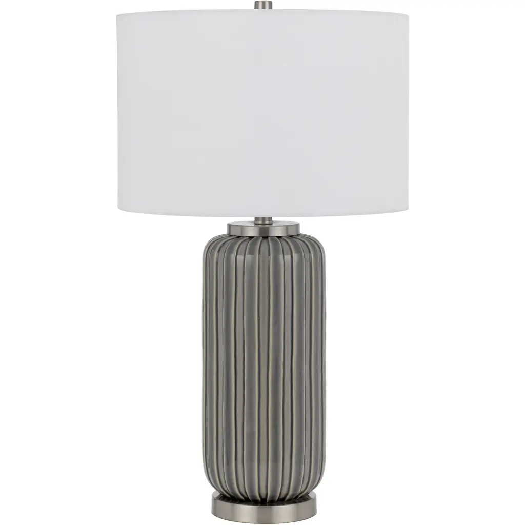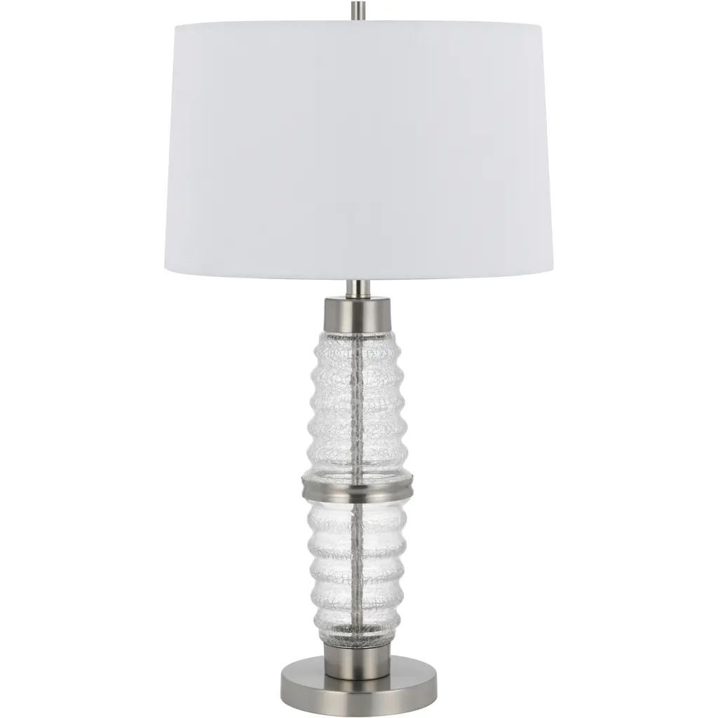 This elegant and timeless table lamp from Cal Lighting is great piece of decor above a nightstand or side table. It features a crystal column design with brushed steel accents. The look is completed with a texturized white linen shade and clear ball finiaBulb Wattage: 150W - 3 wayNumber of Bulbs: 1Type of Bulb: incandescentBulbs Included: no