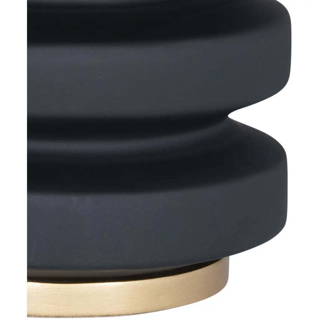 A softly sculptural ceramic table lamp wears a rich, Black Matte finish for a versatile modern statement. The contrasting slim gold base acts as a bright pedestal for the body, while an Off-White cotton tapered drum shade tops the look. Place this dark-hued table lamp in a living room for a moody statement. Also available in Off-White, Matte Grey, Matte Navy and Matte Burgundy.