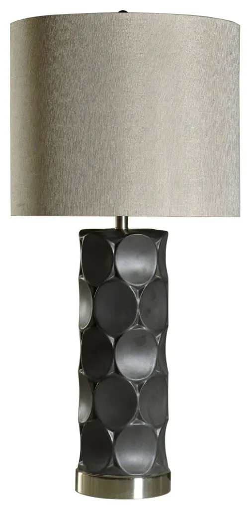 The HARP & FINIAL collection was curated with a fashionable, modern customer in mind. Our mantra - DESIGN IS IN THE DETAILS - truly is the foundation for everything we create. Our focus on craftsmanship and quality is equally as important as our commitment to offering trendsetting style. Thoughtful, unexpected details are incorporated into every piece. Although our collection features the latest trends, our items are modern classics, which will stand the test of time.This table lamp is made of Charcoal Ceramic and Metal with a Gray Hardback Fabric shadeFeatures & Specifications:Suitable for any indoor location (Dry Rated)This piece measures as 18"Dia. x 36.5"HShade measures as 18"Dia. x 15"HRequires 1 x 150-watt E26 Medium base Incandescent bulb (not included) - 120VDue to the production process, each piece is unique and no two are exactly alike.Shade Spider Finish: SilverHarp Height and Finish: 12", SilverMaterial: Ceramic, Metal, LinenShade Material: Hardback LinenShade Shape: RoundSwitch Type: 3-WaySwitch Location: On SocketPortable Base: 7" DiaCord (in.): 60Socket Type: E26Wipe Clean with a Dry ClothDue to lighting and monitor differences, actual colors and finishes may vary slightly from what appears online.