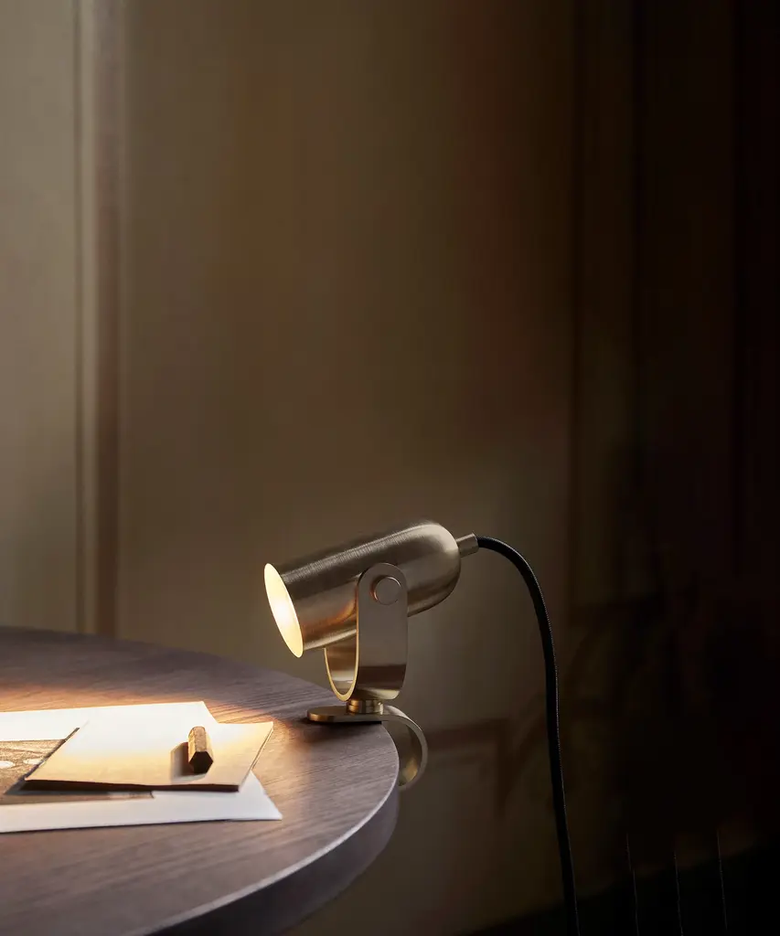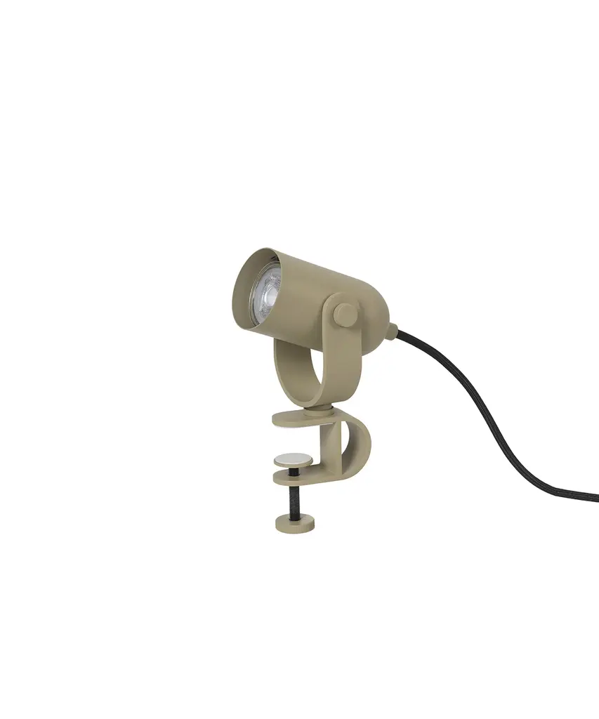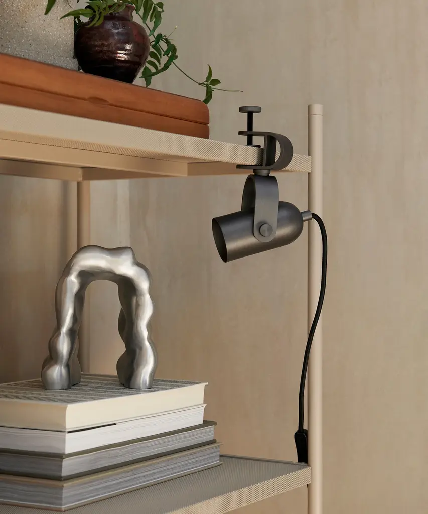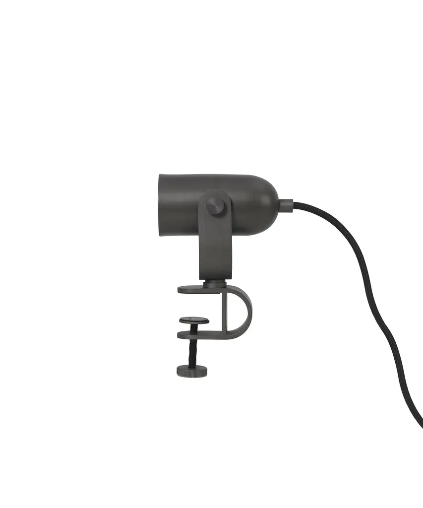 Inspired by industrial architecture and engineering, the practical and durable Ruuvi Lamp has a clean yet soft expression. Featuring practical thumb grip screws that have also inspired its name, the shade of the Ruuvi Lamp can be adjusted to provide light in any direction, while the clamp system allows the lamp itself to be attached to any surface in the home. Use the functional lamp to light up your beloved shelving system, for illuminating the pages of your favorite book while reading in bed, as a bright light when preparing delicious meals in the kitchen, or in any other space where you need a practical light source that can easily be moved and adjusted. Designed and produced by the Copenhagen-based studio Ferm Living.