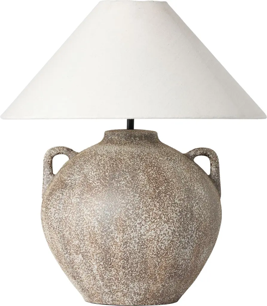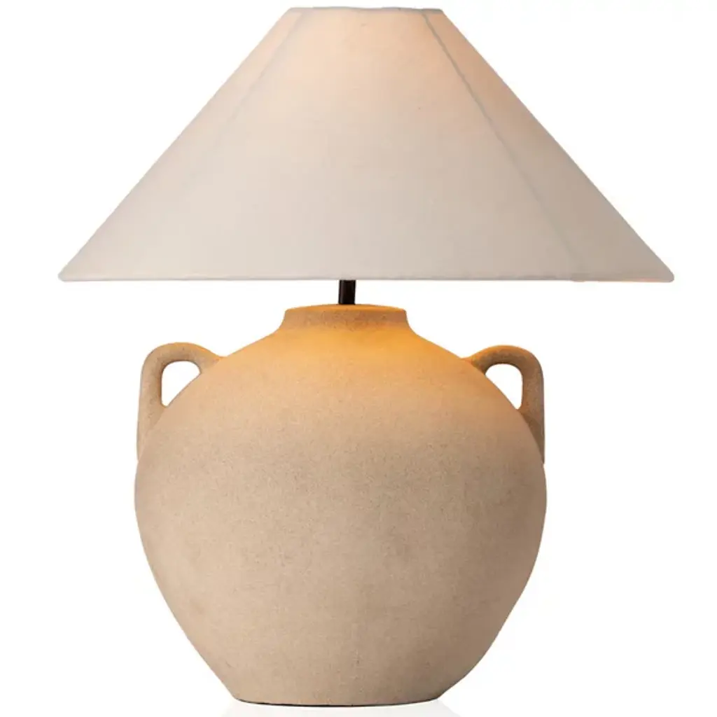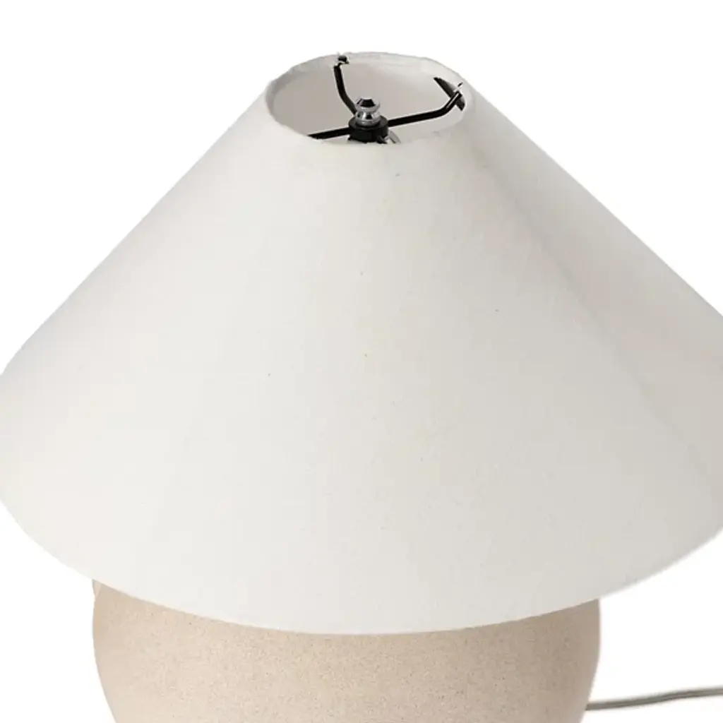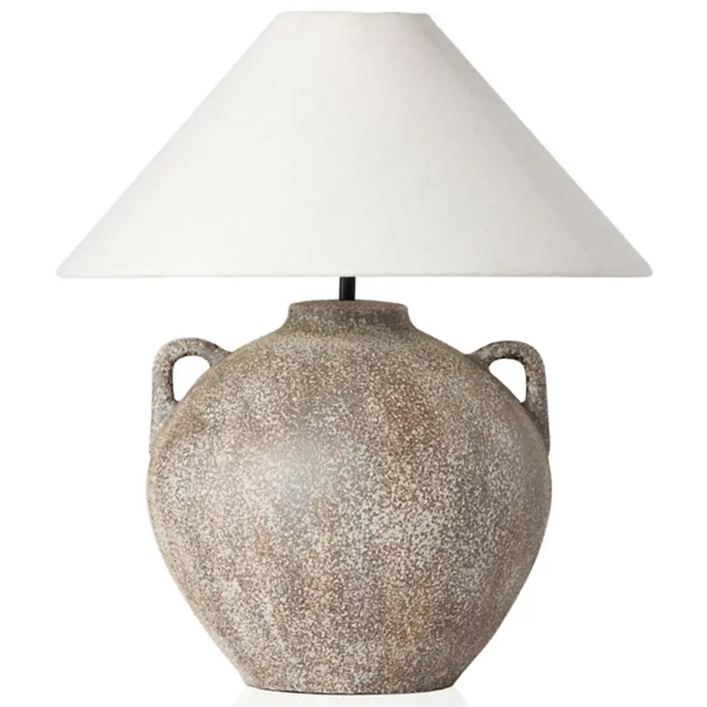 Add a clever, classical presence to inside tables and sideboards with the Ryker Cone Table Lamp from Four Hands. A subtle rustic creation inspired by vintage clay jars, a light sand-colored fixture matches a round body with small handle detailing, elevating strong lamping inside a tapered linen shade that mutes excess glare, transforming it into an effervescent ambiance.