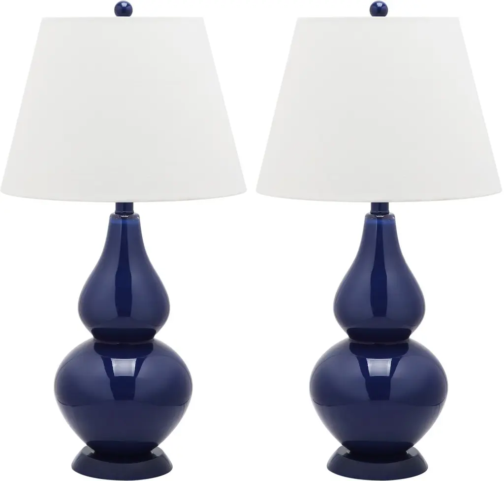 Designed in a classic two-gourd shape, these table lamps will add timeless style to any space. Crafted of glass and topped with cotton shades, they offer a sophisticated touch to any room.