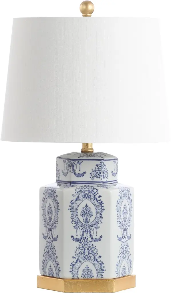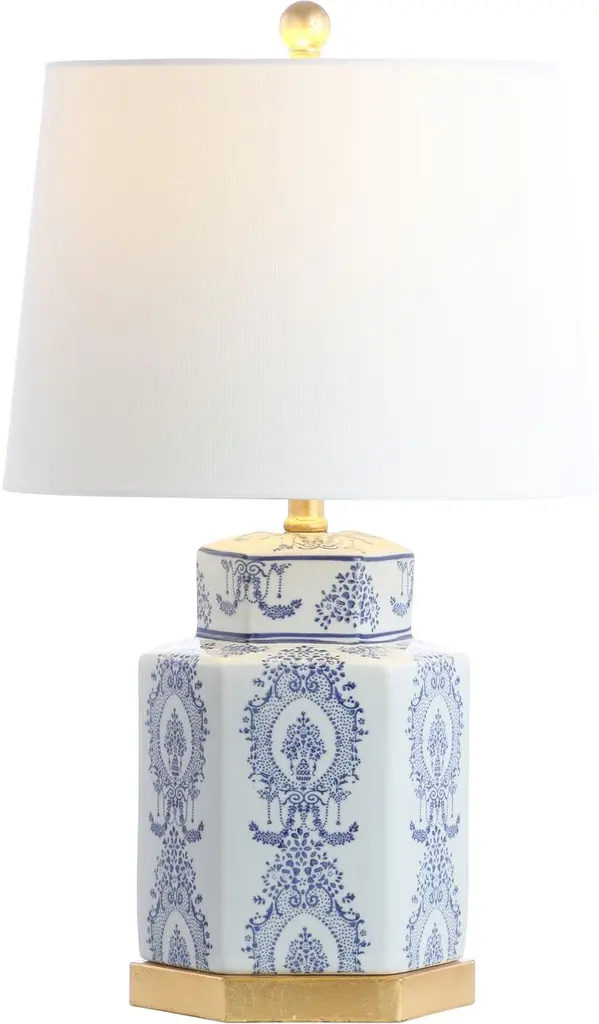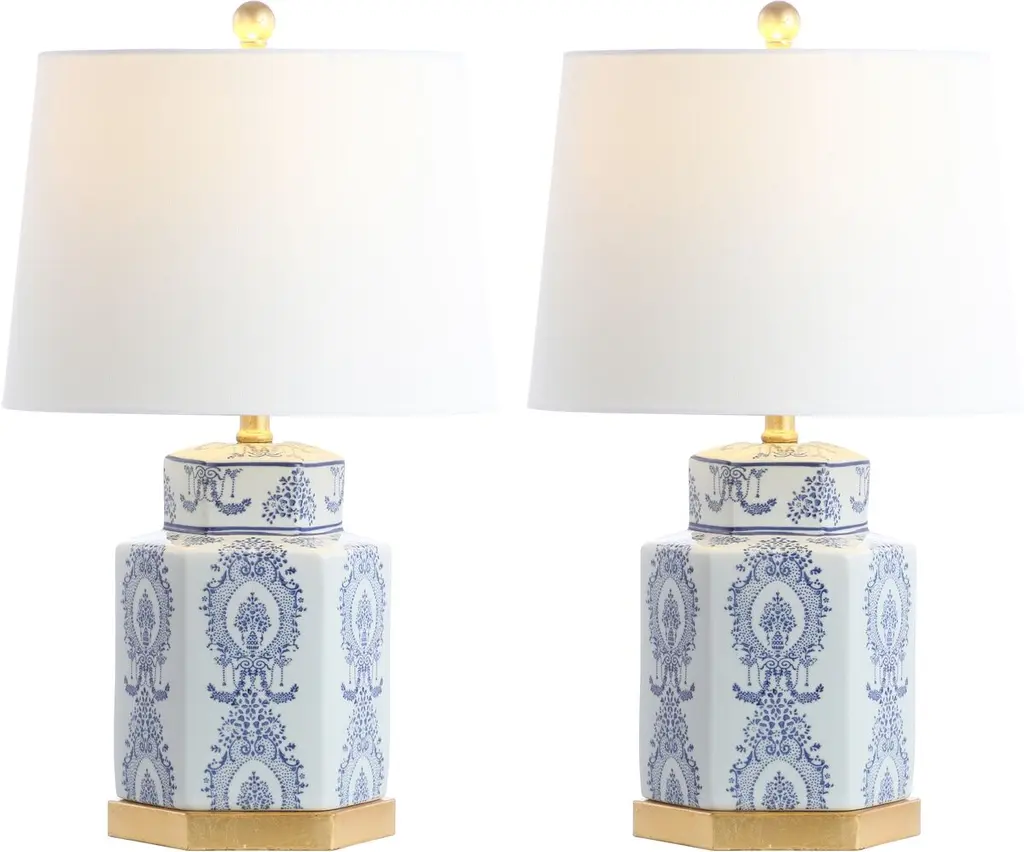Inspired by Chinese tea jars, the two table lamps in this set have hexagonal ceramic bodies adorned with elaborate blue-on-white motifs. Golden bases and finials accentuate the elegance, as do the cotton shades.