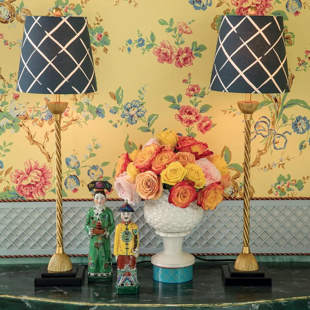Designed by Madcap Cottage for Port 68, these handsome buffet lamps take their inspiration from decorative trims and tassels. Each lamp is crafted of steel with a twisted candlestick support and hand-applied gold leaf finish, set on a tiered pedestal, and topped with an off-white linen hardback shade.