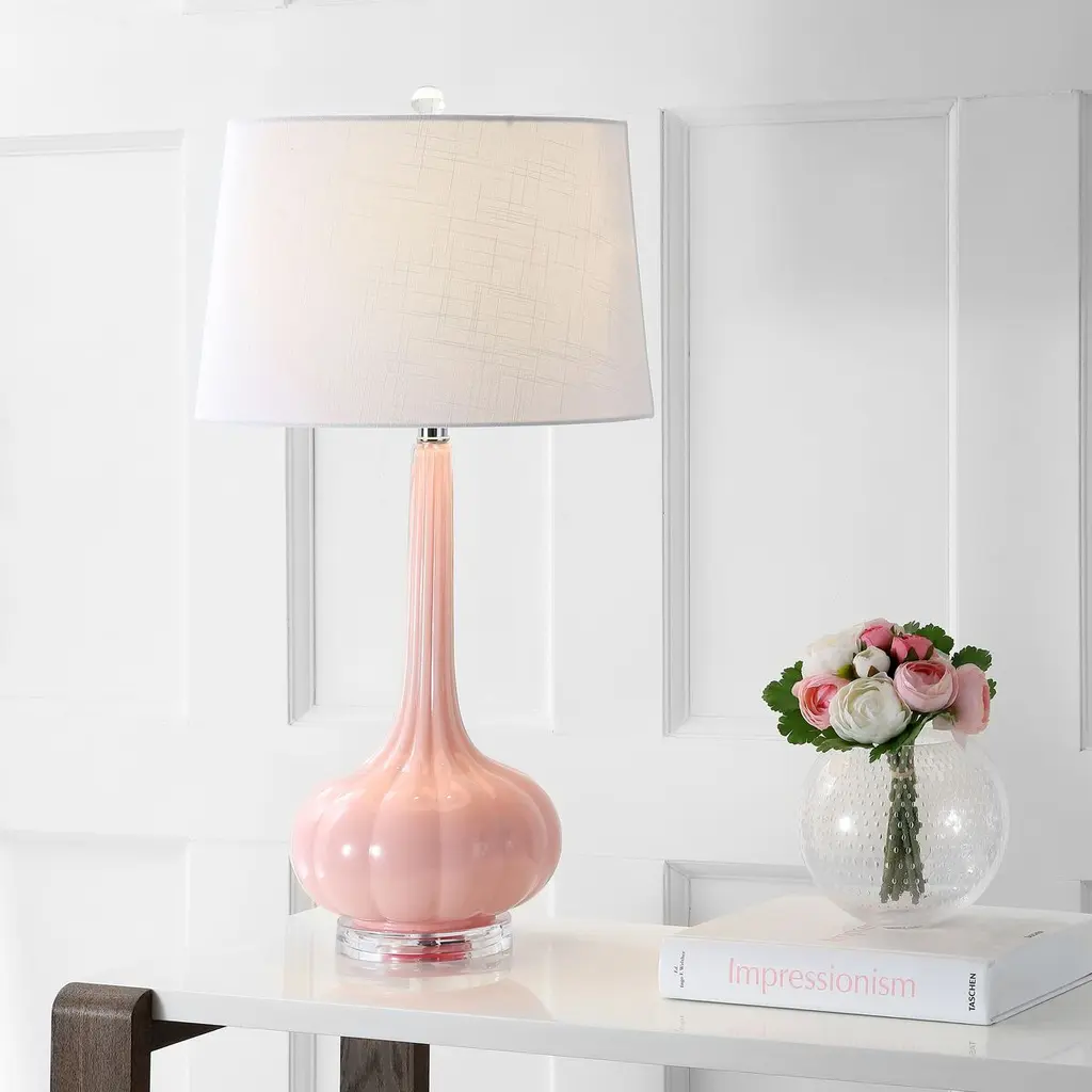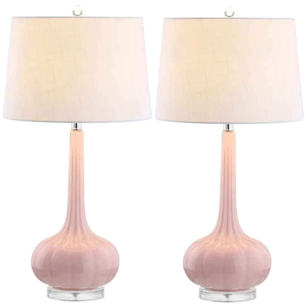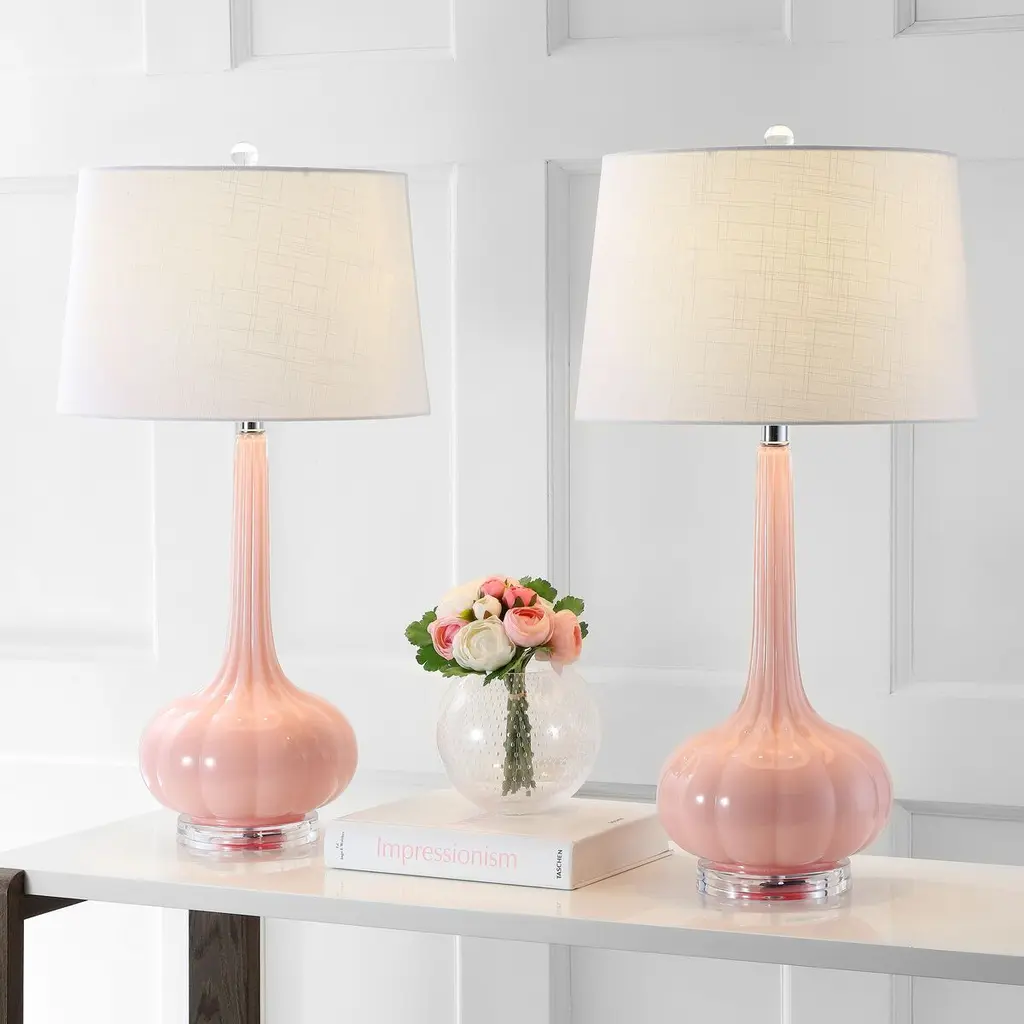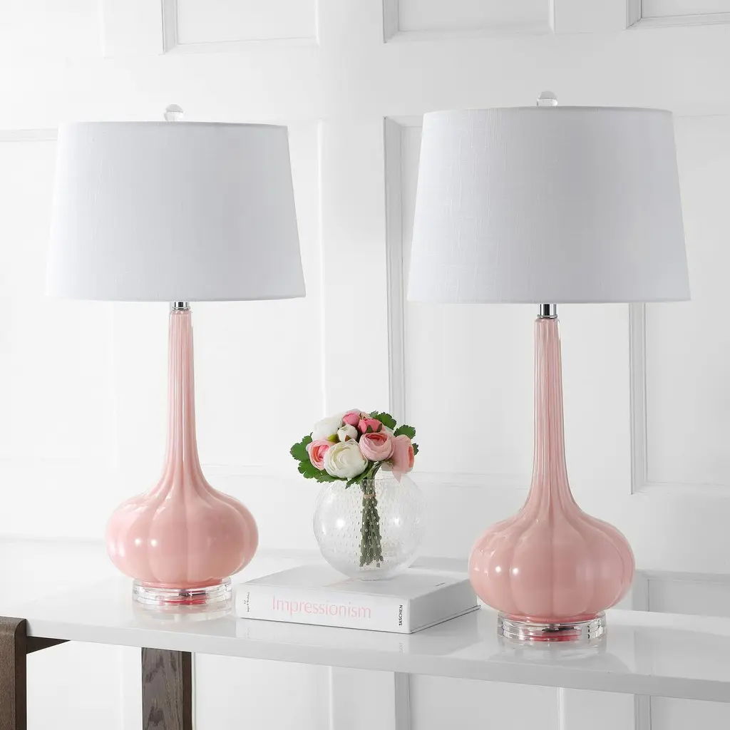 The traditional long-neck table lamp is given a contemporary glow-up, with graceful fluting and a clear acrylic base and finial. The linen drum shade is an ideal finishing touch. Because they come as a pair, the lamps are ideal for flanking a bed or a sofa.