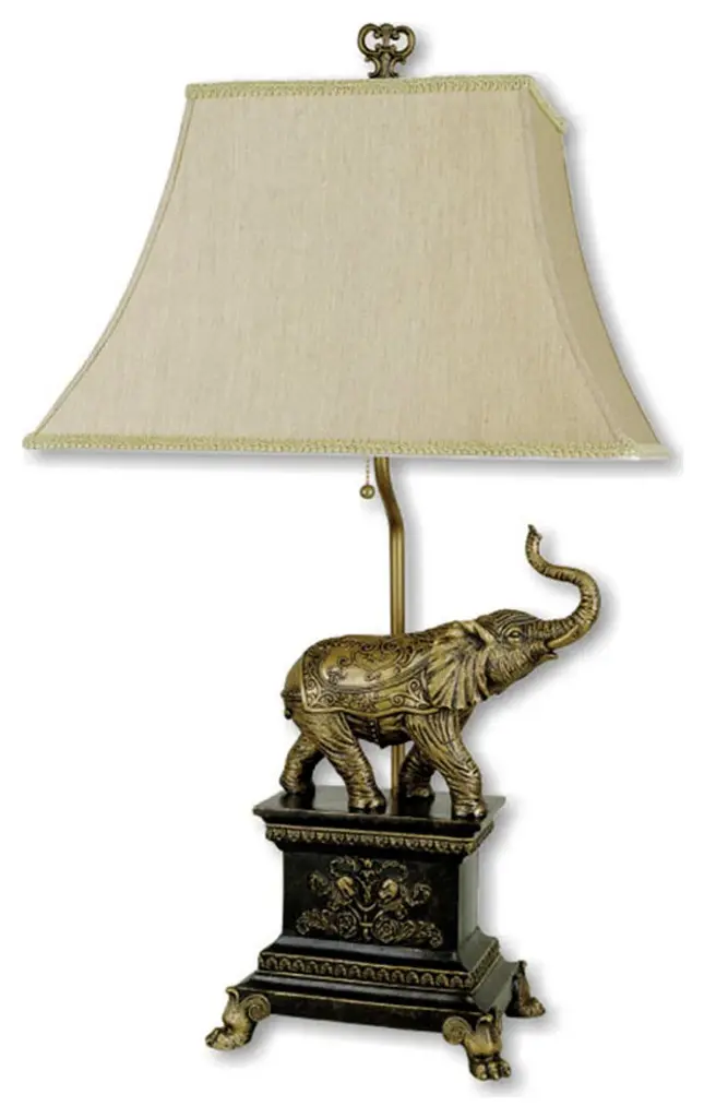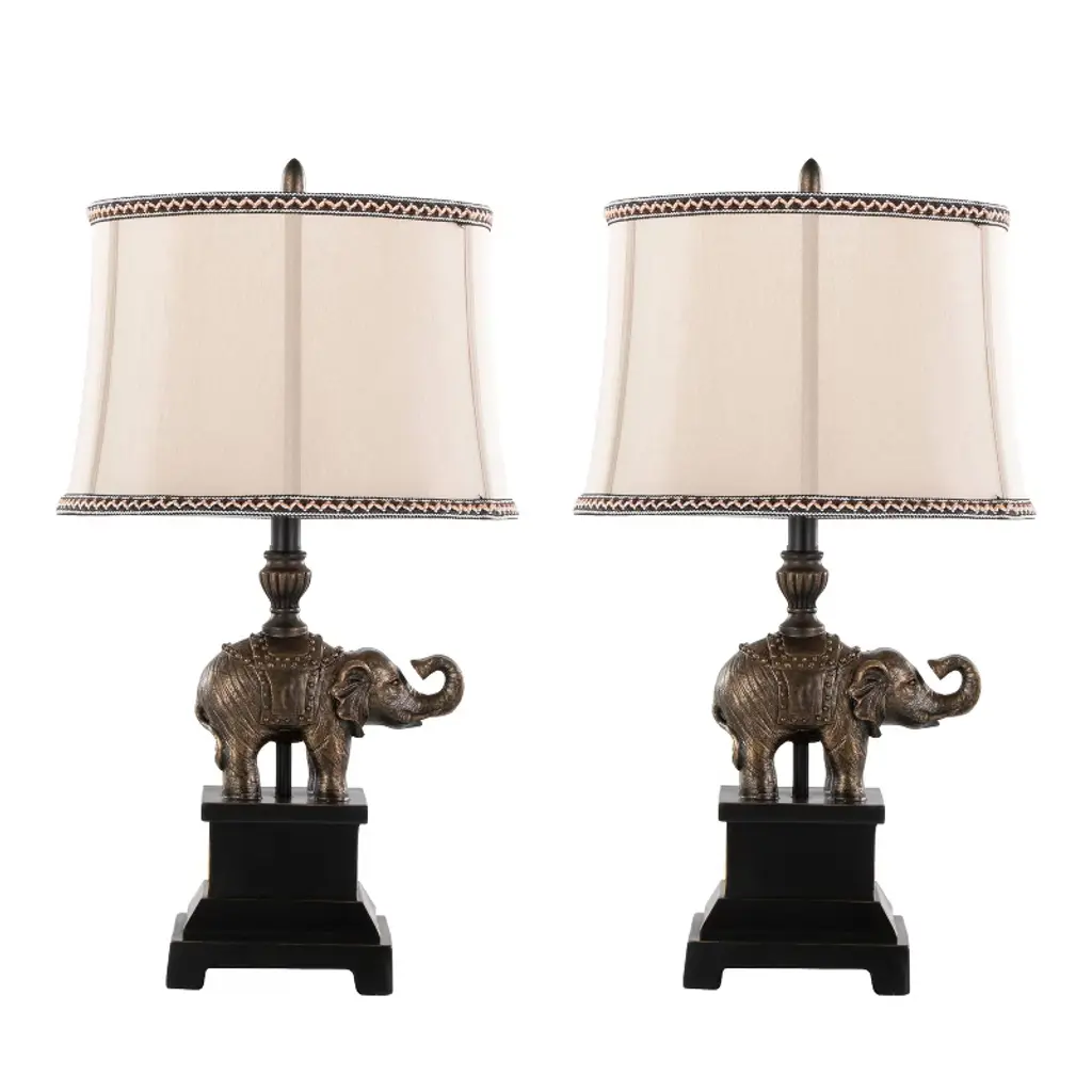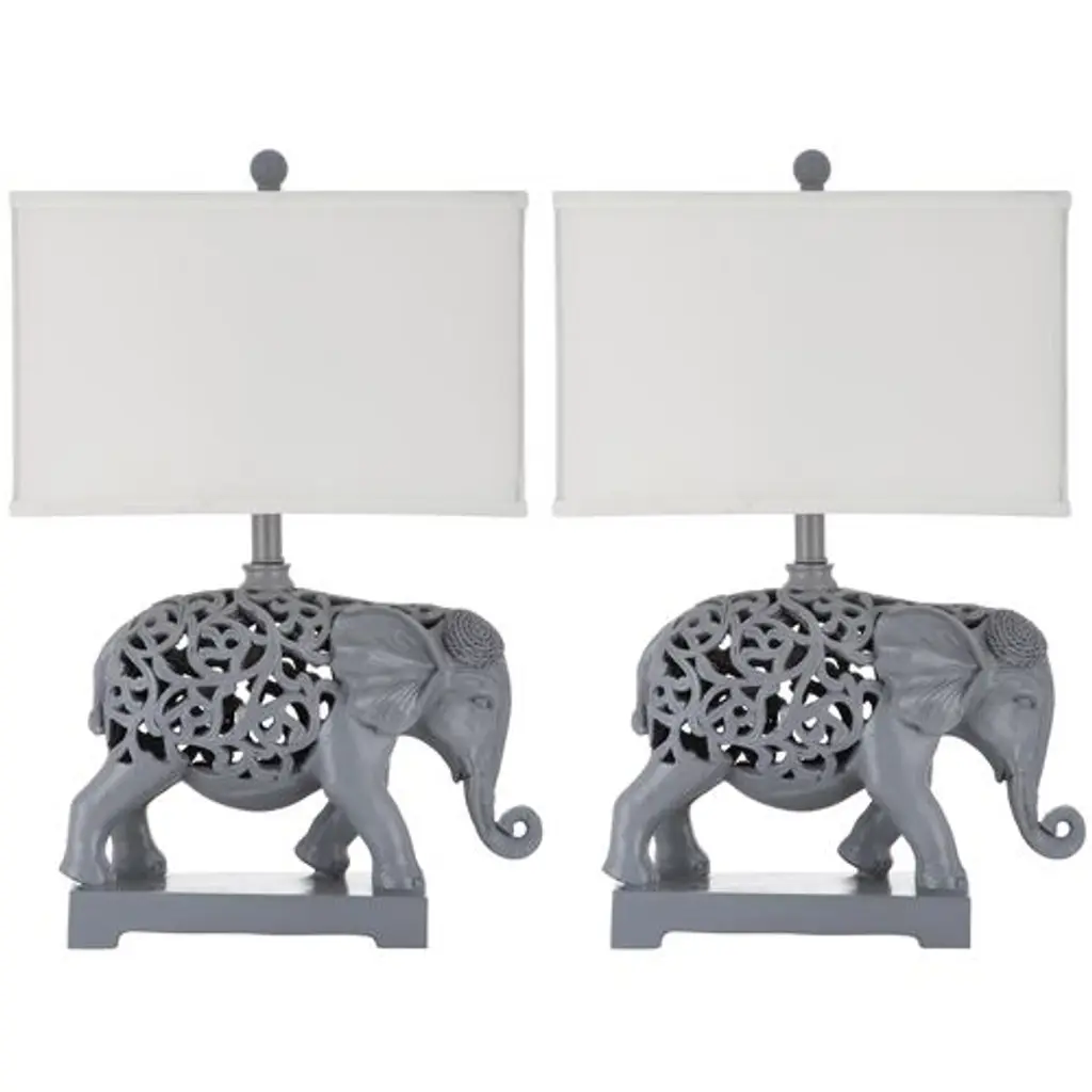 These beautifully detailed elephant table lamps add distinct style to any bedroom, living area, or study. Each is crafted of resin with a neutral gray finish and complemented by off-white rectangular cotton shades.