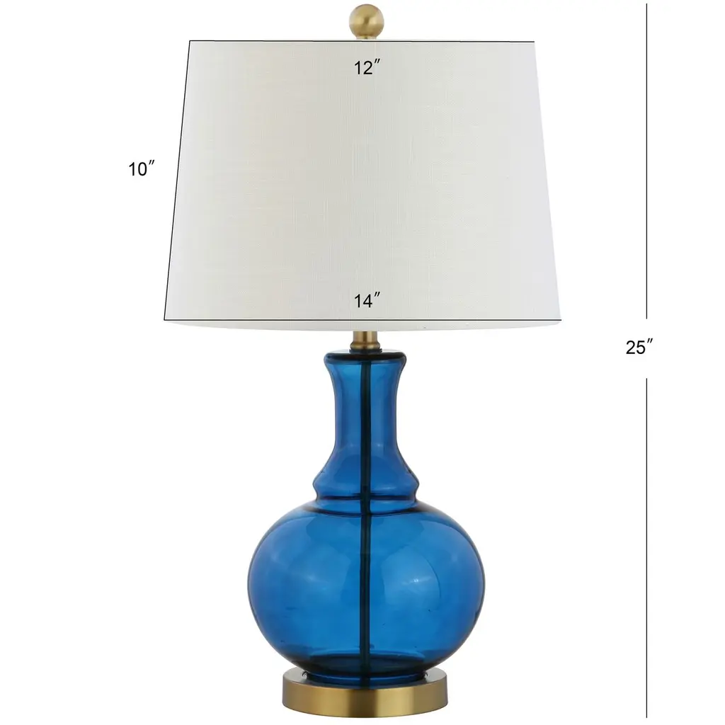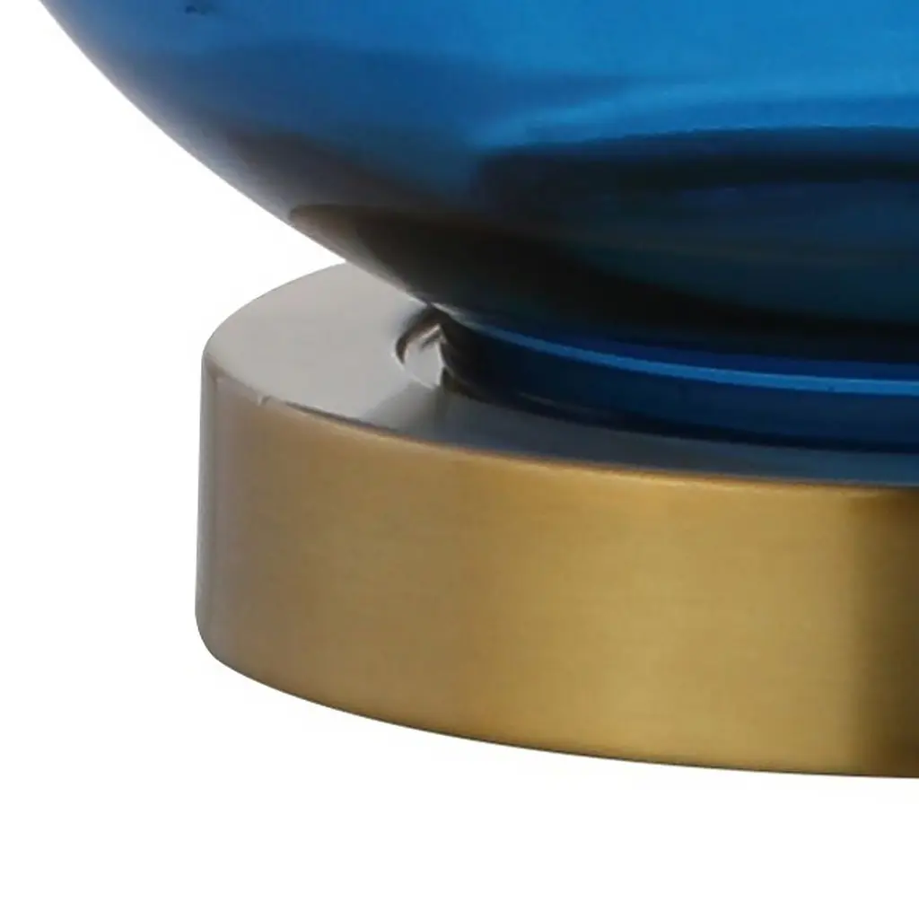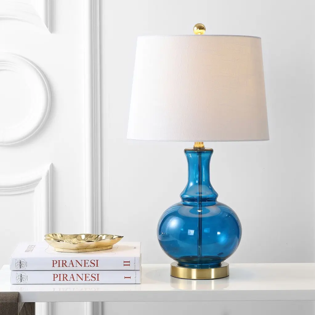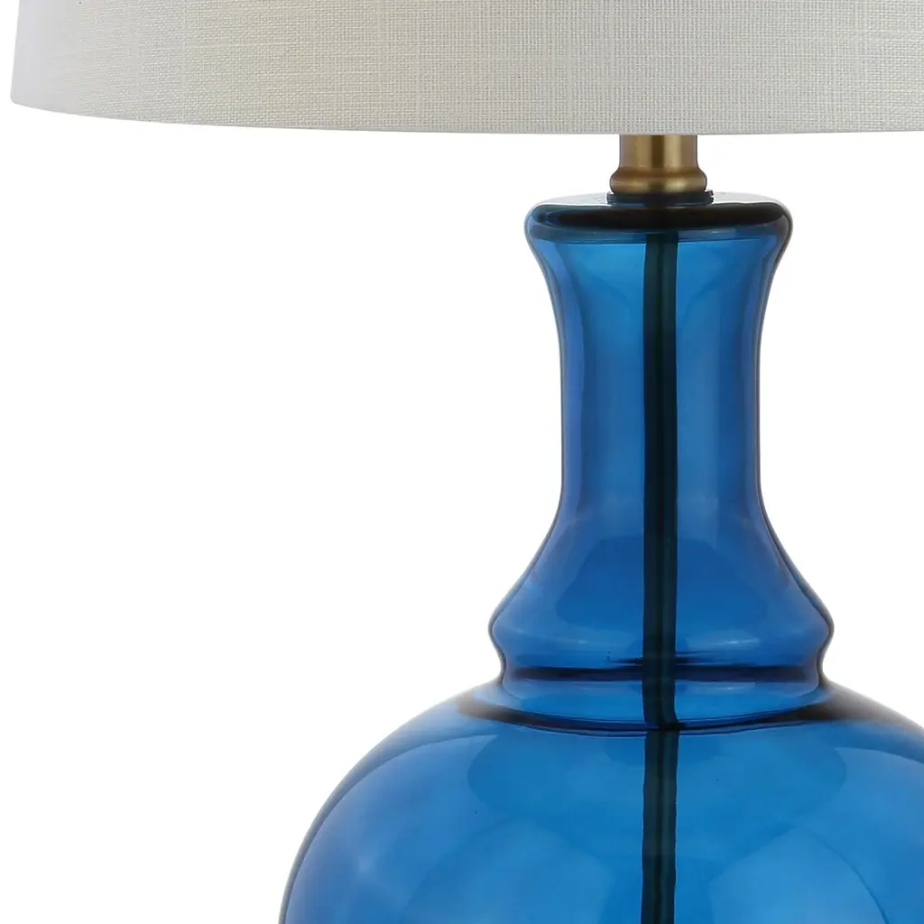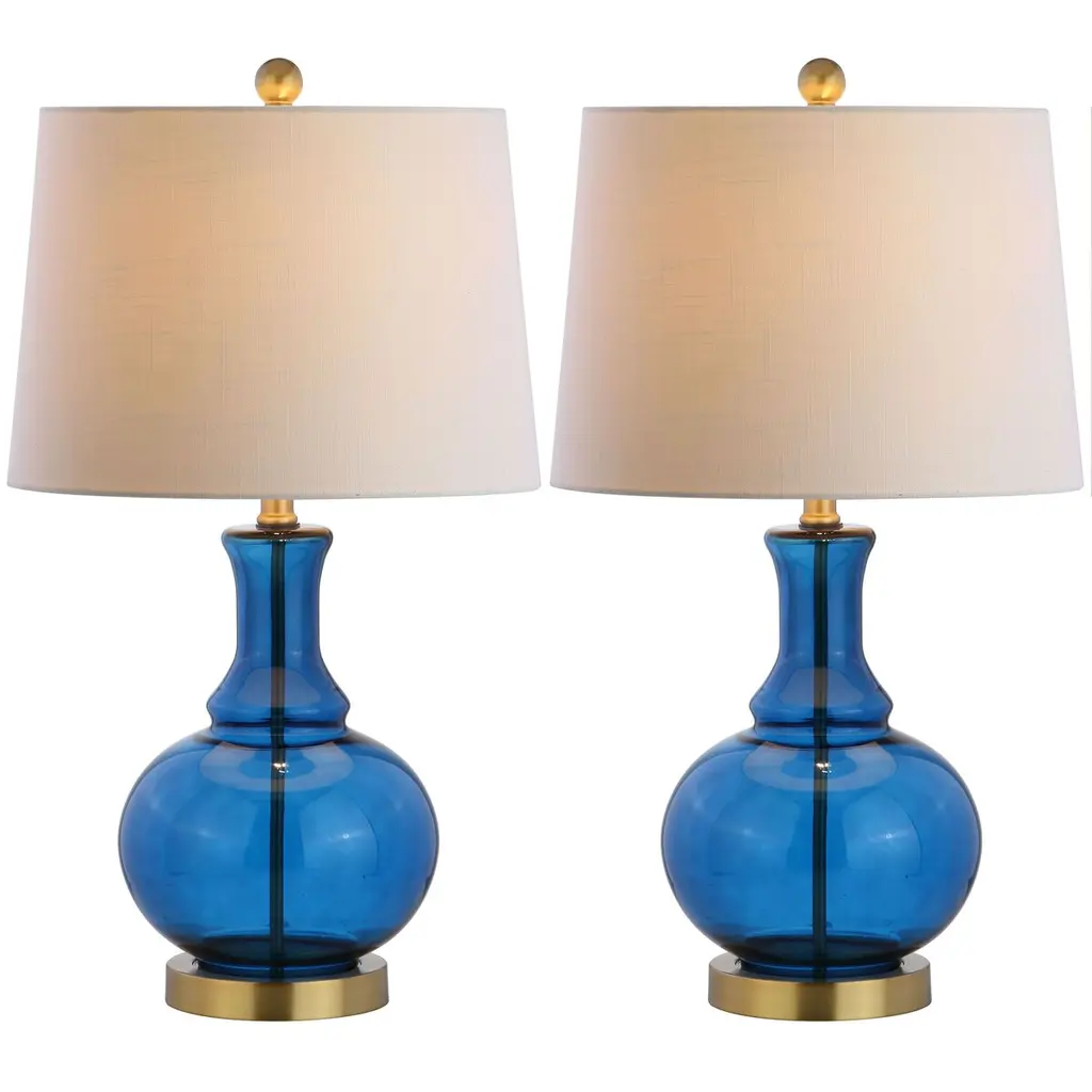 Hand-blown glass forms the shapely bodies of this pair of table lamps, each of which rests on an equally elegant brass base. The white linen shades and the silk-wrapped cords are suitably refined finishing touches.
