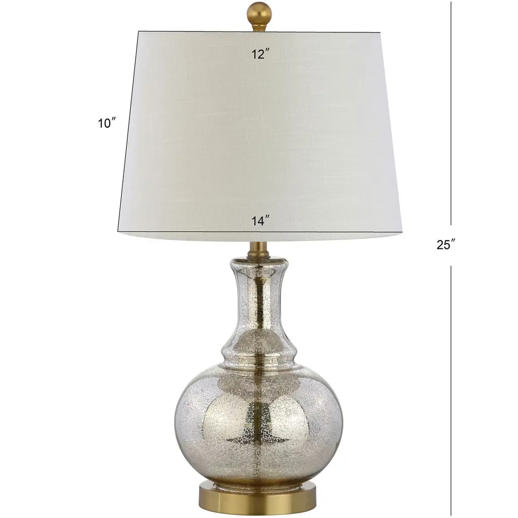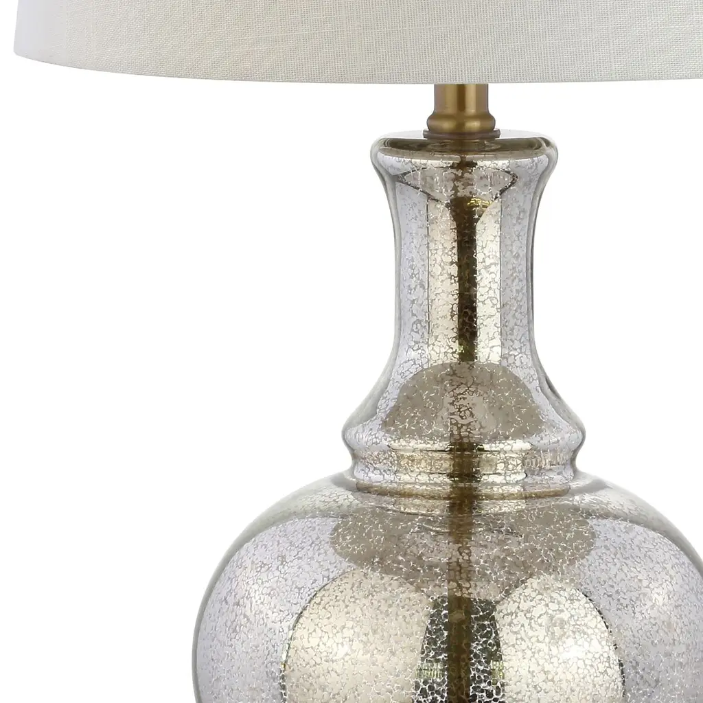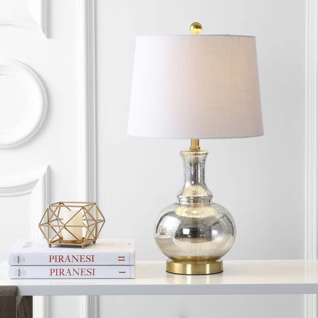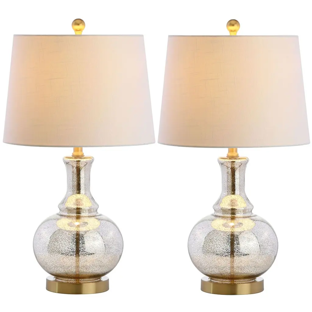 Hand-blown glass forms the shapely bodies of this pair of table lamps, each of which rests on an equally elegant brass base. The white linen shades and the silk-wrapped cords are suitably refined finishing touches.