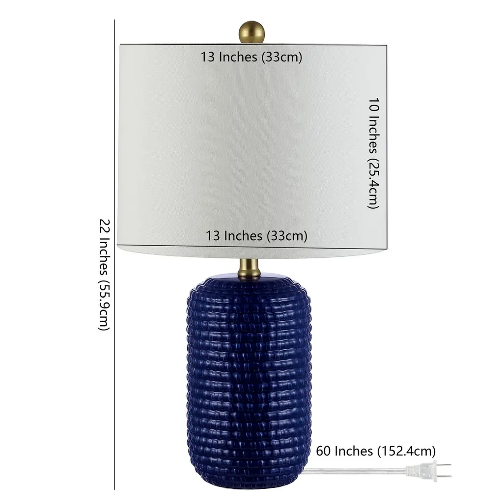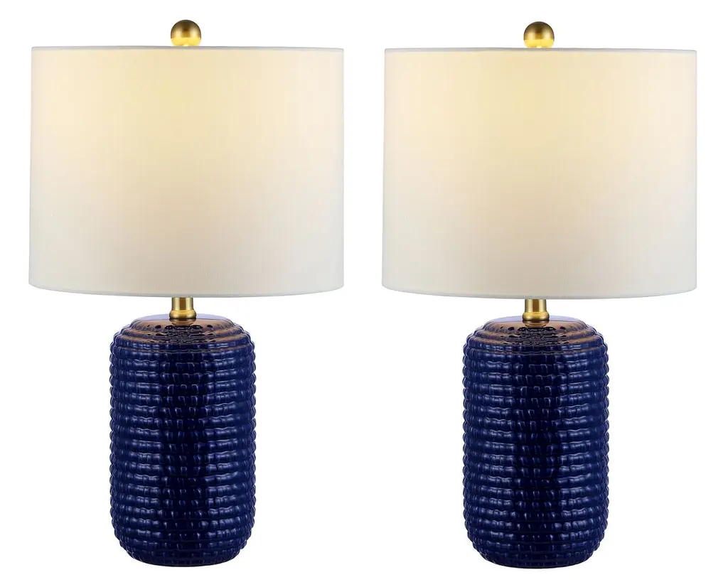 Sold as a pair, these table lamps will bring texture and bold color to a room. Each has a ribbed ceramic body given a deep blue finish, with a golden finial and a white cotton shade adding to the sophistication.