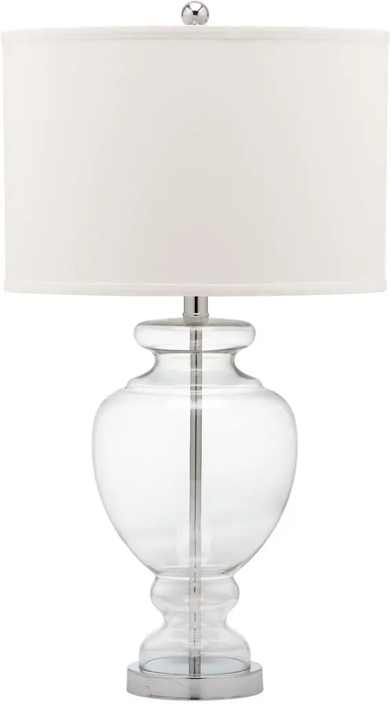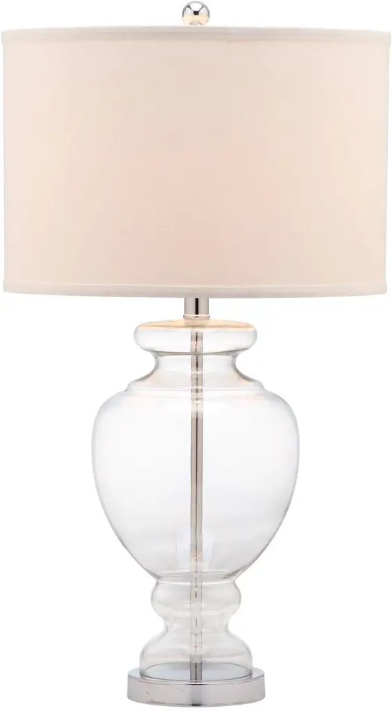 These glass lamps are outfitted with silver fittings and hardback drum shades. The design evokes a sense of elegance and tranquility, reminiscent of serene waters and gentle waves.