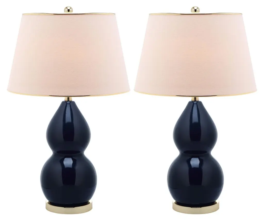Designed in a classic two-gourd shape, these table lamps are topped with gold-trimmed cotton shades. They are crafted to be a timeless addition to any space.