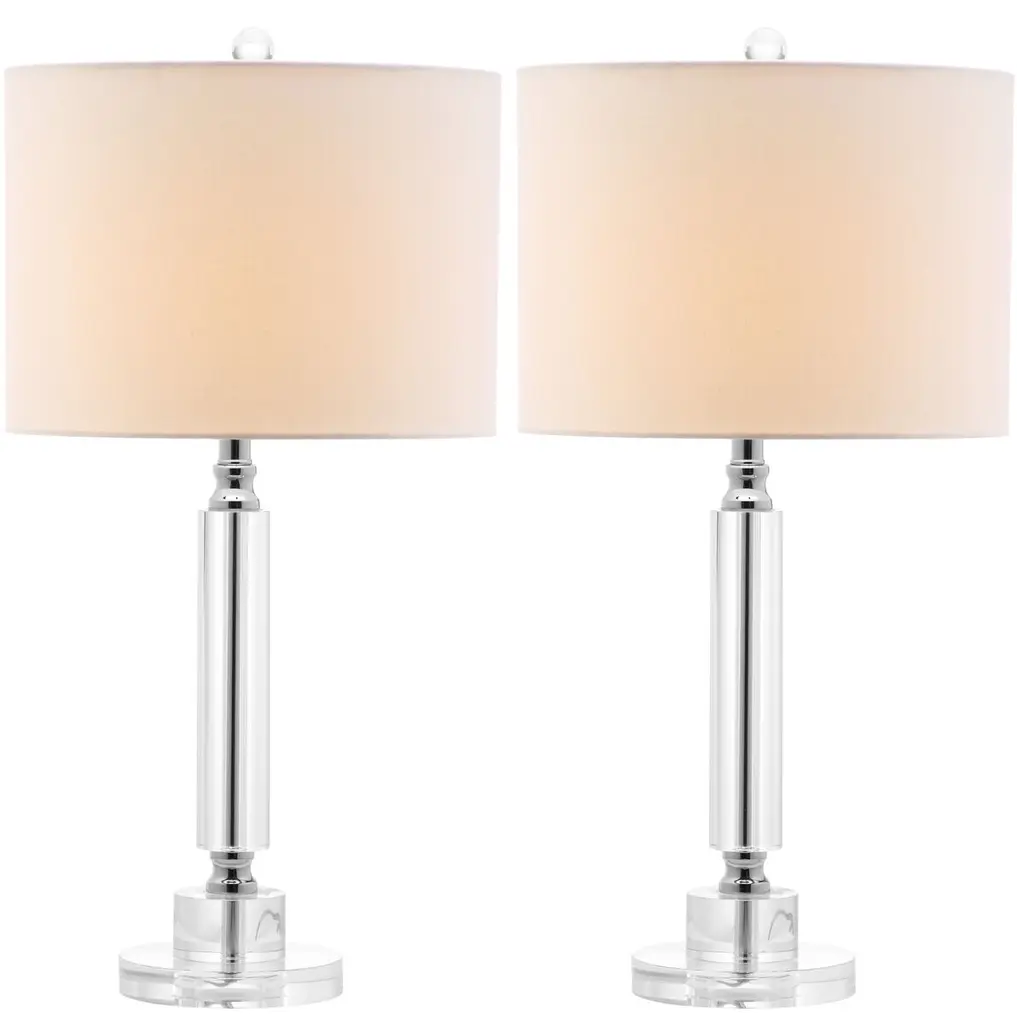 Column lamps are crafted from clear crystal, for a look that will work in both classic and contemporary spaces alike. Topped with white linen shades.
