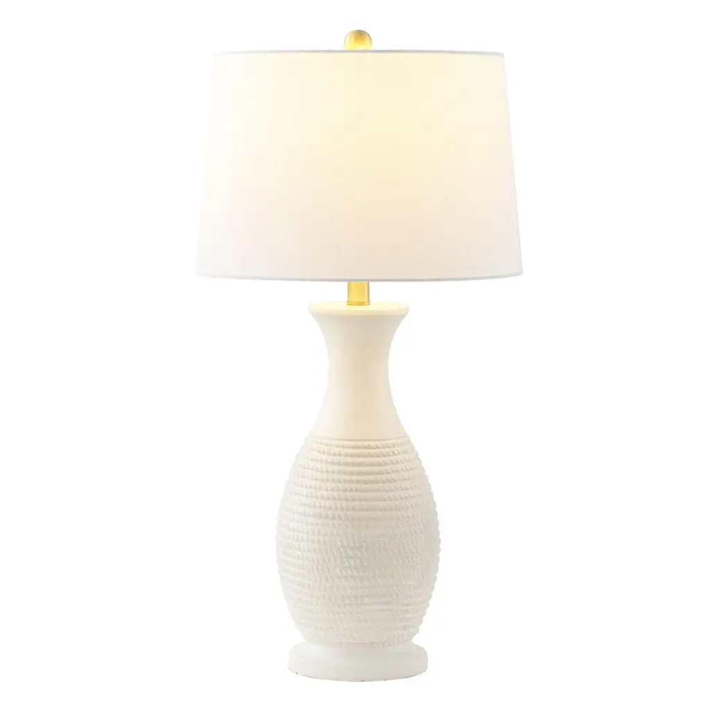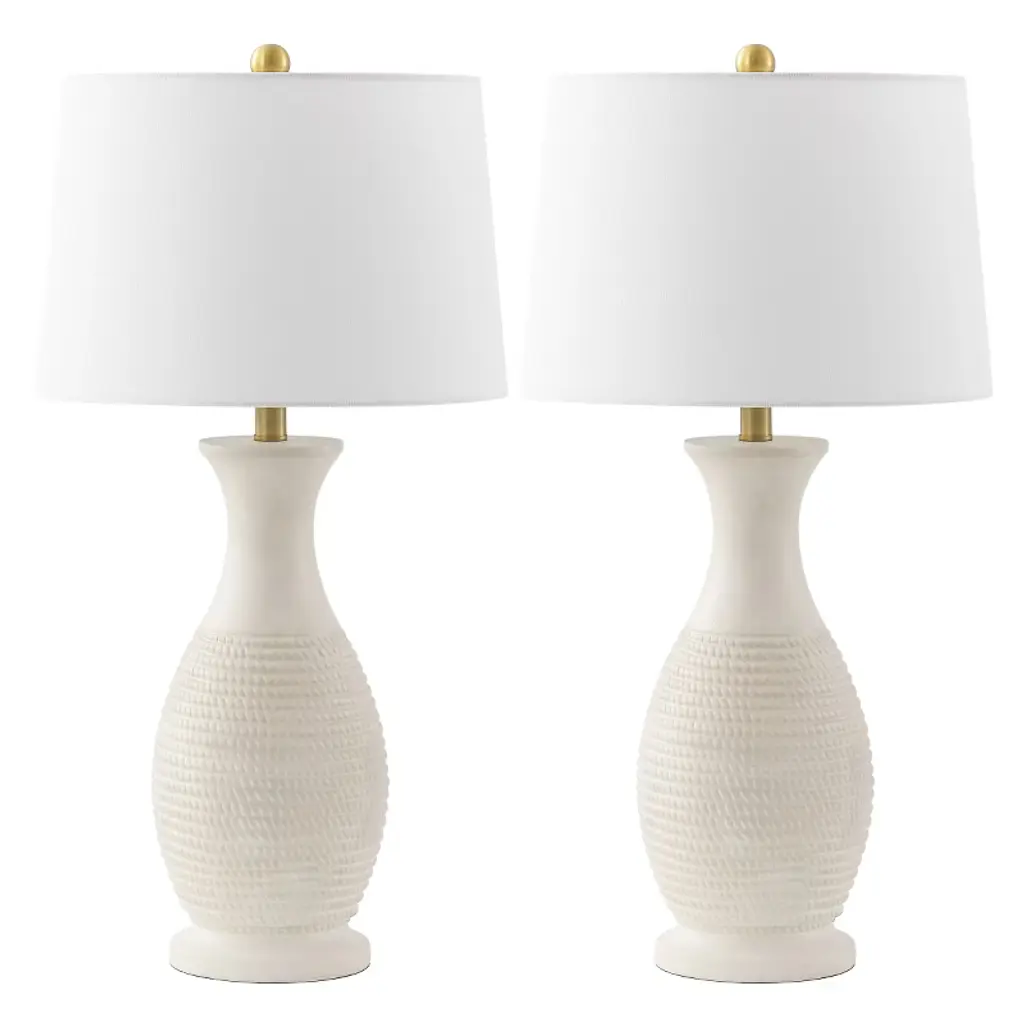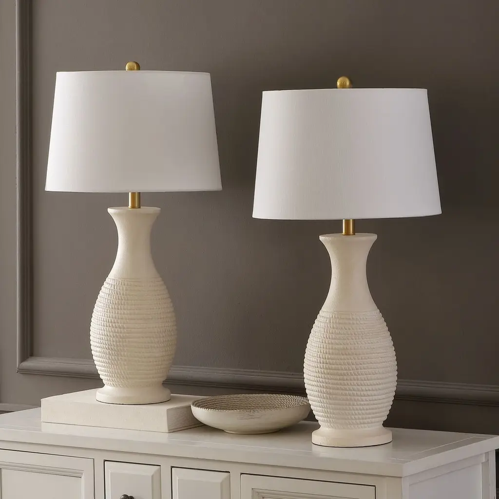 Brighten up your space with the Ulyssis 30 inch table lamp set of two. These lamps bring a touch of elegance to any room with their sophisticated design. Crafted with a polyresin body, the lamps present a subtle yet stylish texture that complements the decor of any interior. The fabric shade softly diffuses light, creating a warm and inviting ambiance perfect for living rooms, bedrooms, or office spaces. Each lamp stands gracefully at 30 inches, making them an ideal choice for bedside tables or console tables. Whether you are looking to enhance your reading nook or add a serene glow to your living area, the Ulyssis table lamp set beautifully fuses functionality with style, offering a timeless addition to your home.