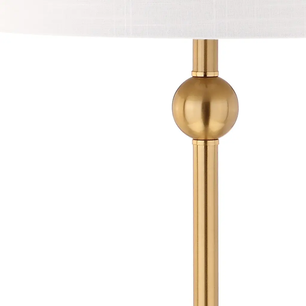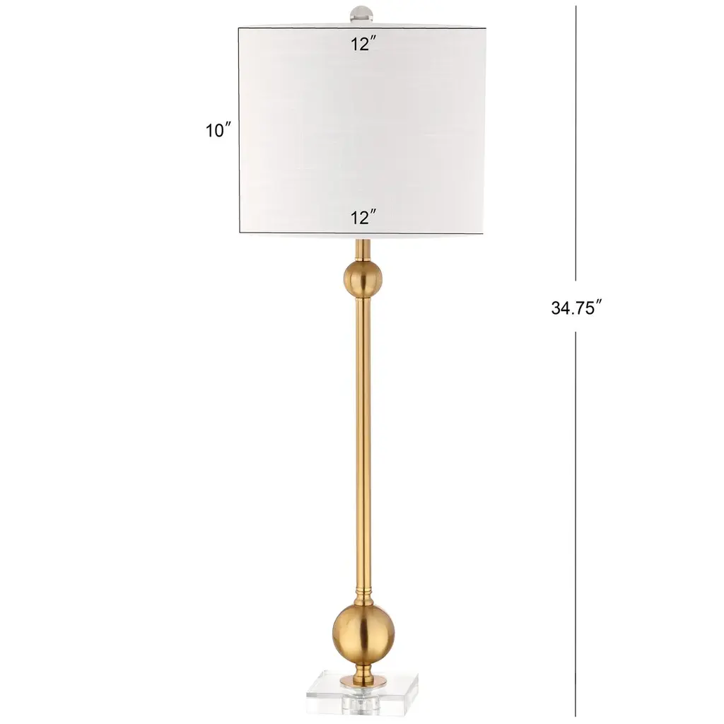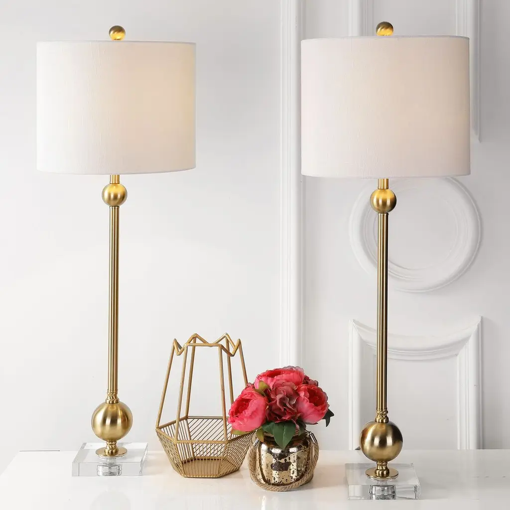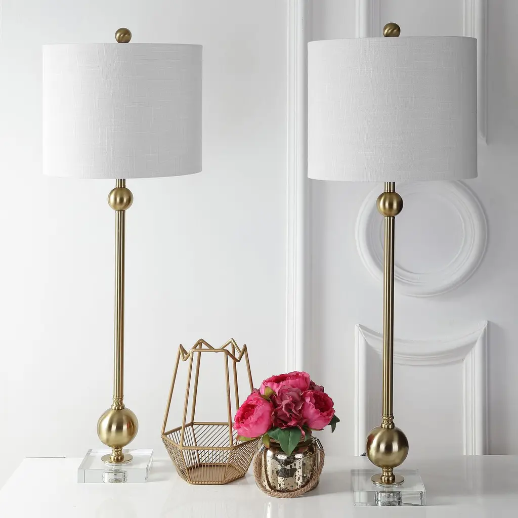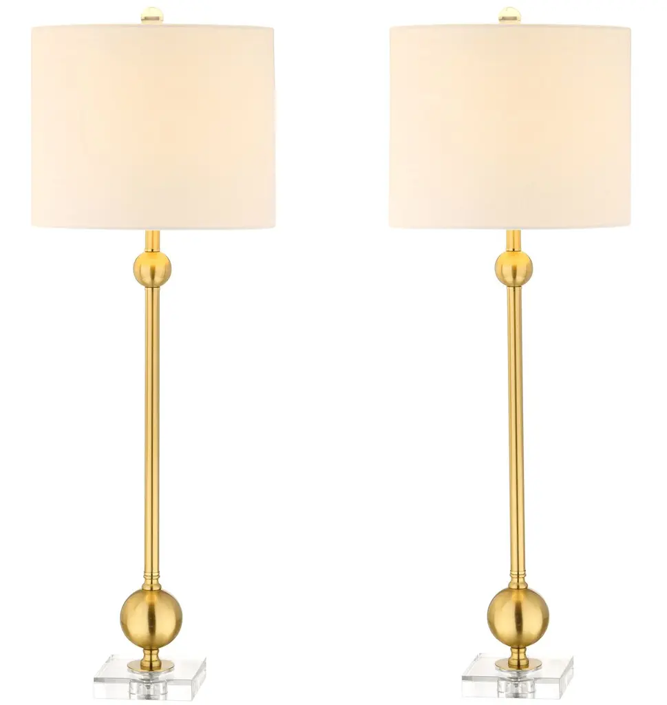 This pair of table lamps are style chameleons, able to complement traditional and contemporary rooms alike. That's thanks to the combination of a square crystal base and an elongated brass body enhanced with orbs and fluting. The white drum shade is an ideal finishing touch.