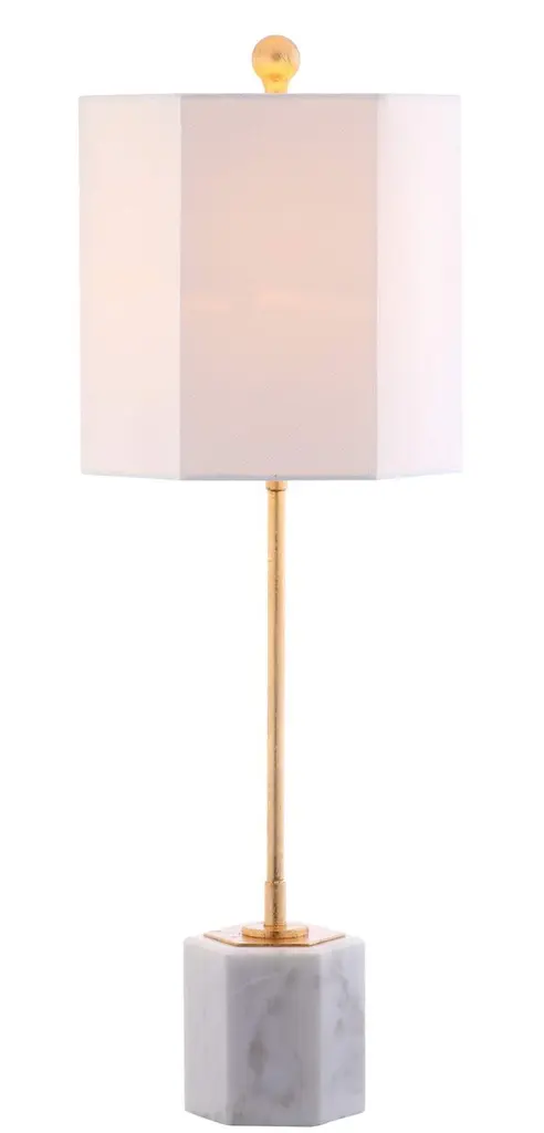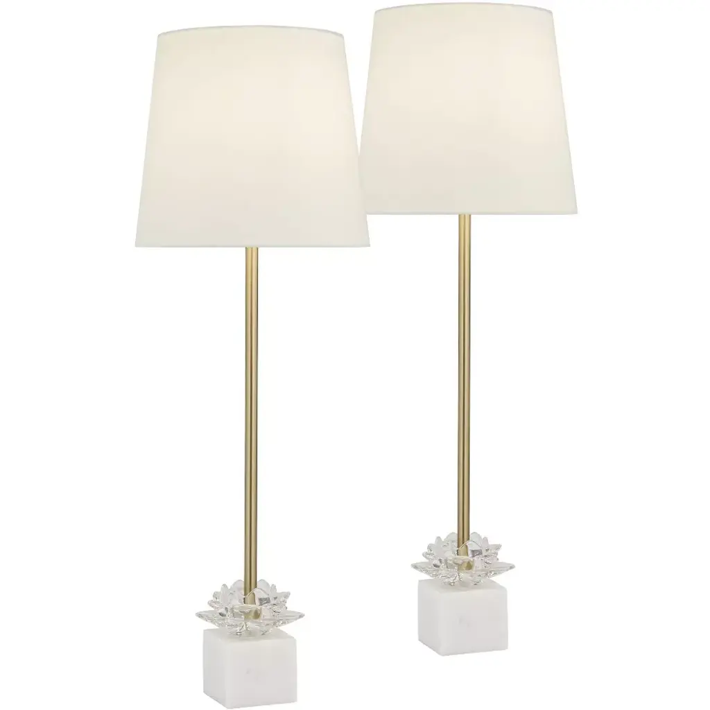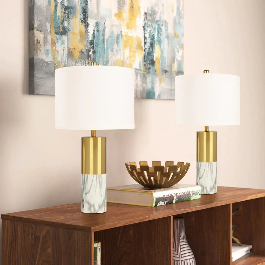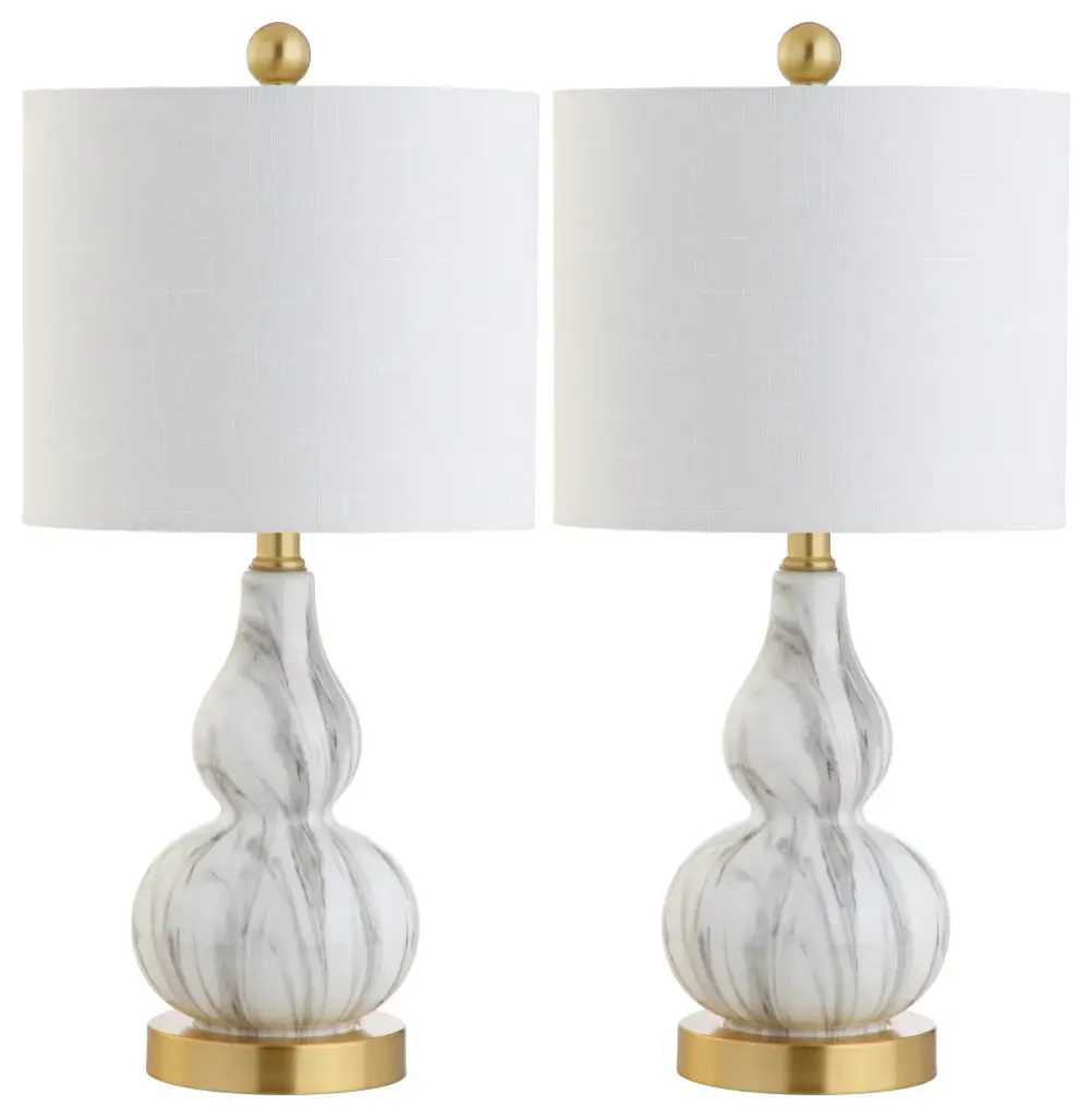 Brimming with drama and refinement, these table lamps are each crafted of iron with a dimensional fabric shade and naturally stunning marble base. A gold finish brings plenty of warmth and shine.
