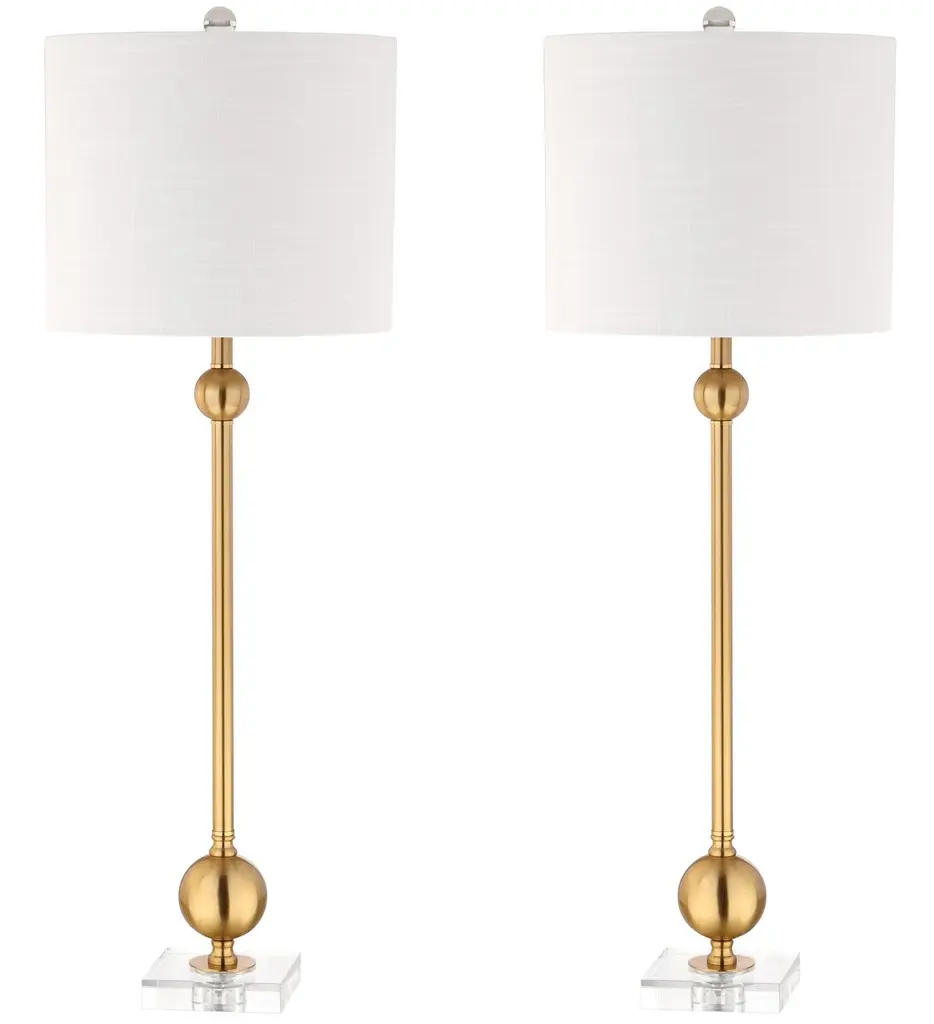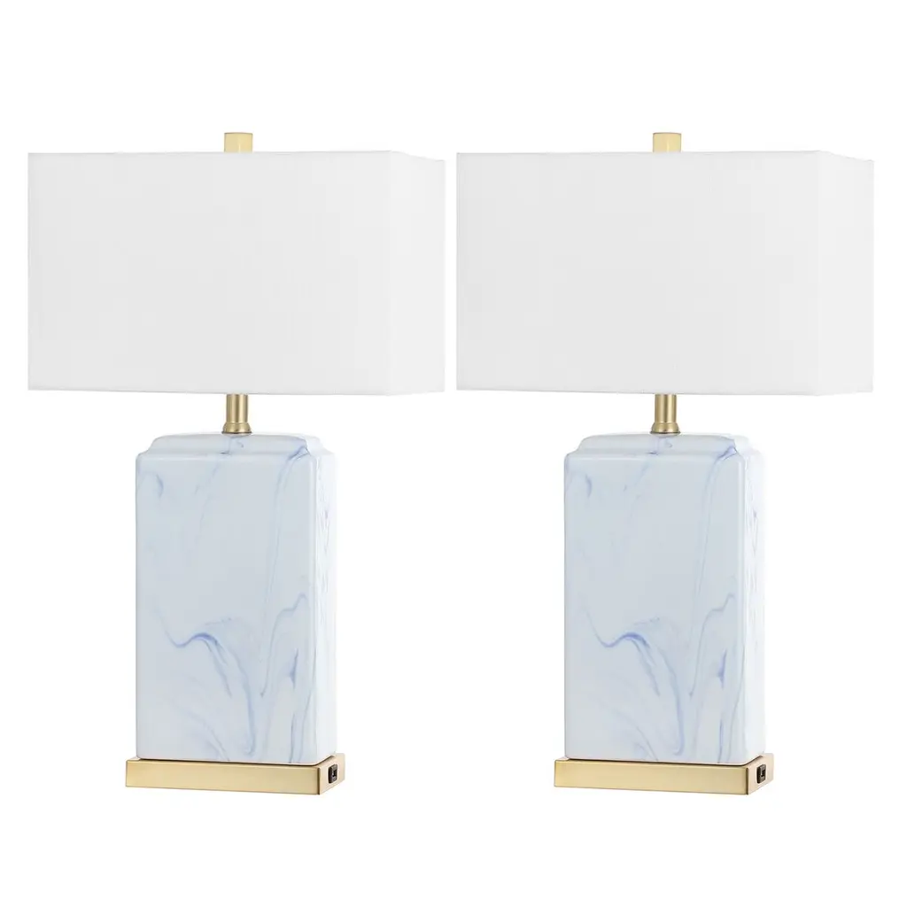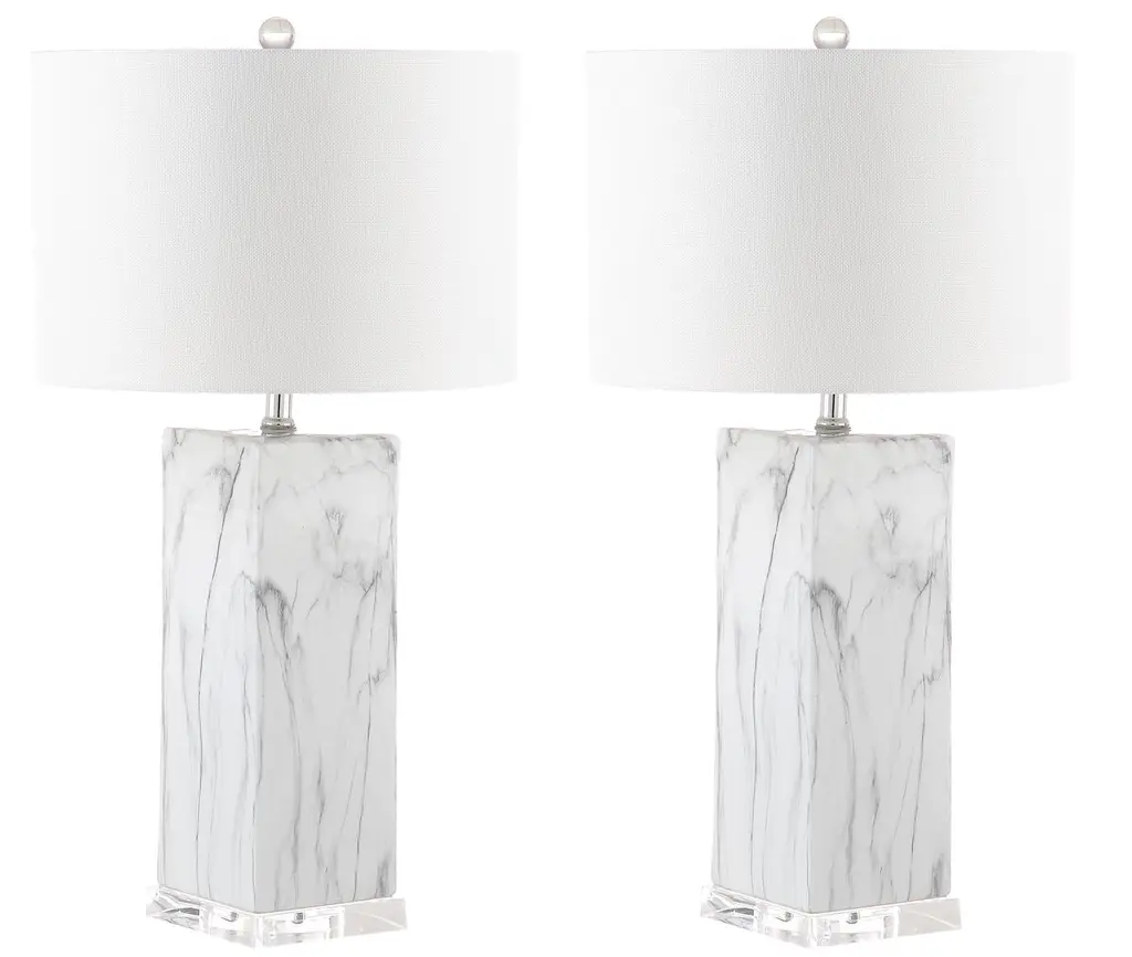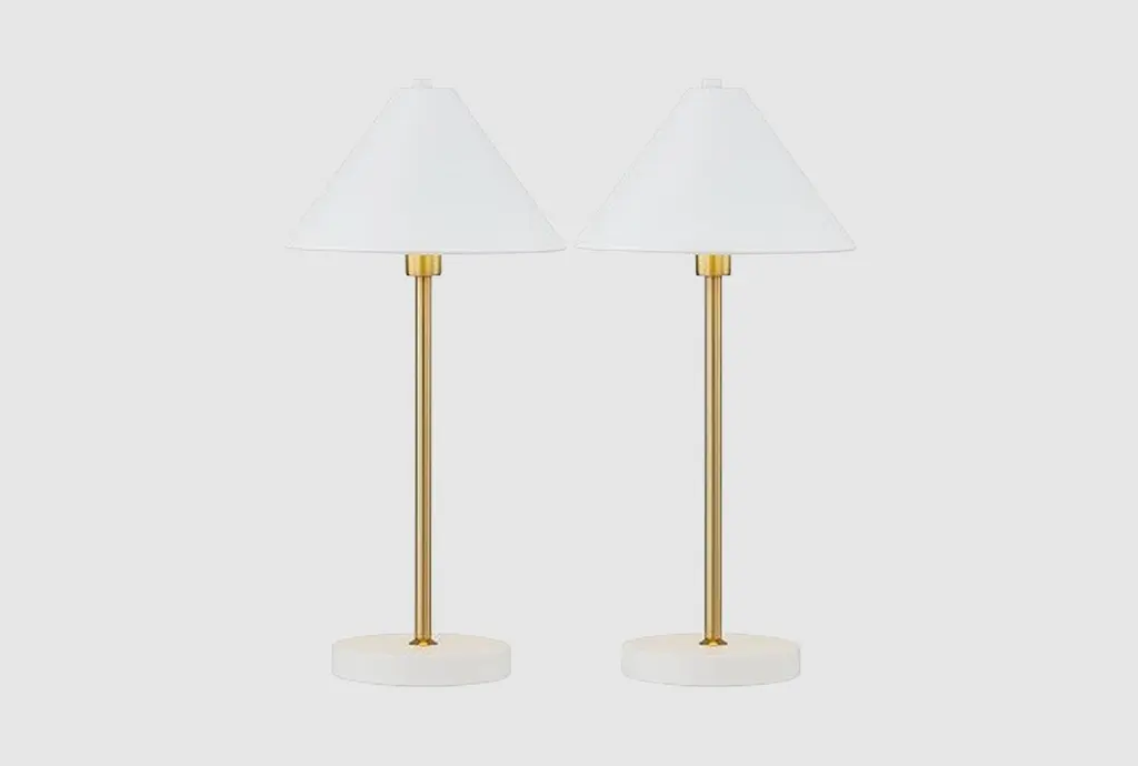 Brimming with drama and refinement, these table lamps are each crafted of iron with a dimensional fabric shade and naturally stunning marble base. A gold finish brings plenty of warmth and shine.