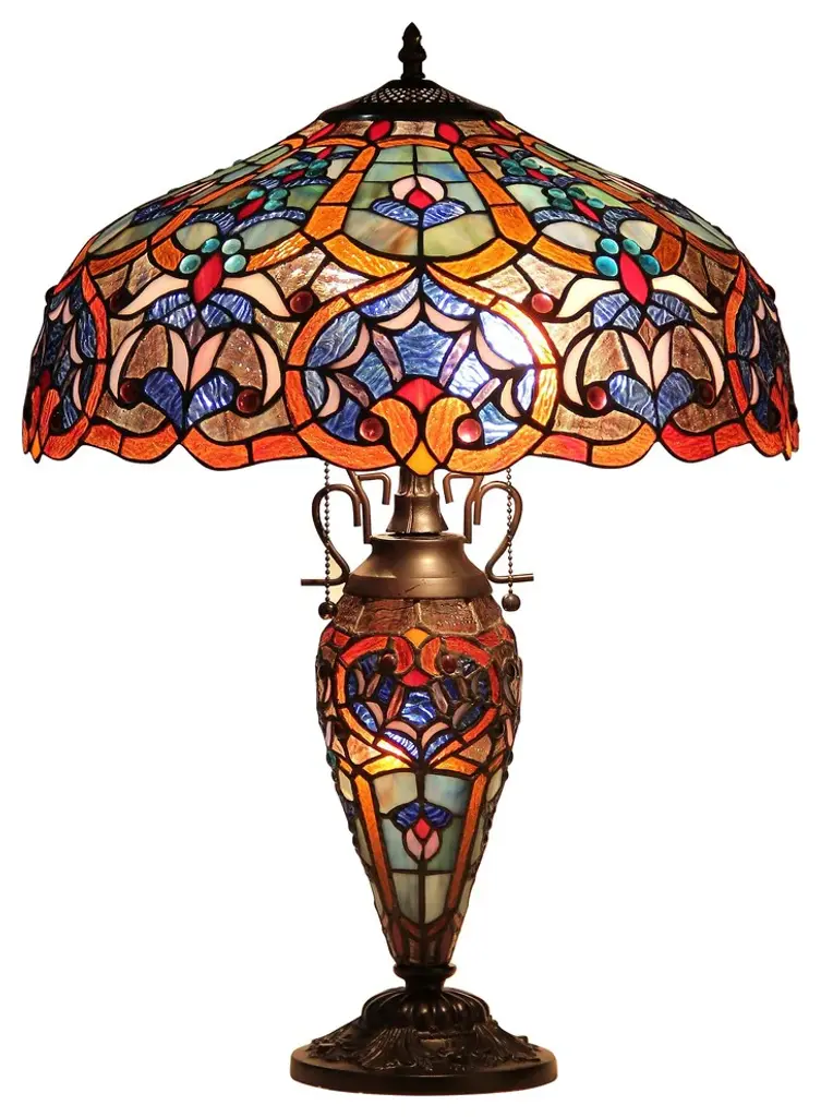 SADIE, a Victorian style lighted base table lamp, will provide the design focal point for your home. Expand the effect by adding one or more of the other lamps in this design style. Expertly handcrafted with top quality materials including real stained glass and gem-like cabochons. The lighted base can be used alone whenever low light levels are desired.(2) 100 Watt max E26 Type A Bulb + 1-Max 25 Watt E12 Type C Bulb (Type A bulb not included) Pull chain & on-cord rotary switch731 pcs glass cut, 118 cabochonsDownlightIndoor SettingHarmonized code: 940520Since these are hand crafted products, the exact color of glass pieces may vary. Colors of the glass will appear darker and less vibrant when not illuminated. Handmade glass will vary from one piece to the other; glass made at different times will also vary. Light bulbs used in lamps or ambient lighting may affect the appearance of the products. Stained glass product has been protected with mineral oil as part of the finishing process. Please use a soft dry cloth to remove any excess oil.