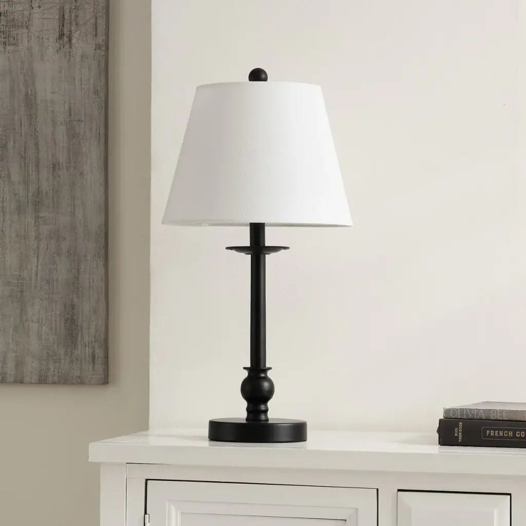 Give a sophisticated upgrade to your decor with our stunning Clysa table lamp. Blending timeless notes with a modern design, our table lamp exudes a dose of elegance. Its slender pedestal base mimics classic details to serve as a timeless and versatile addition to your home. The table lamp showcases a black metallic finish and a white empire shade to add sophisticated charm to your home. It delivers a soft and pleasant glow to elevate the style and ambiance of your entryway, bedroom, or lounge.