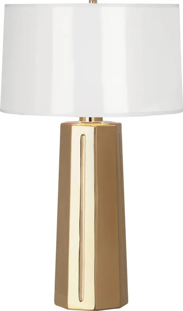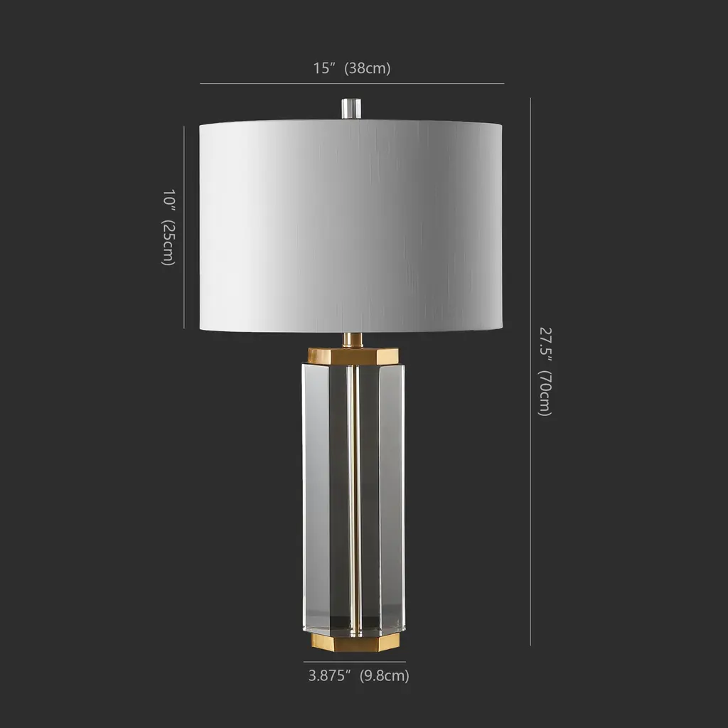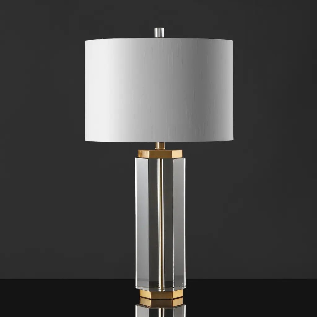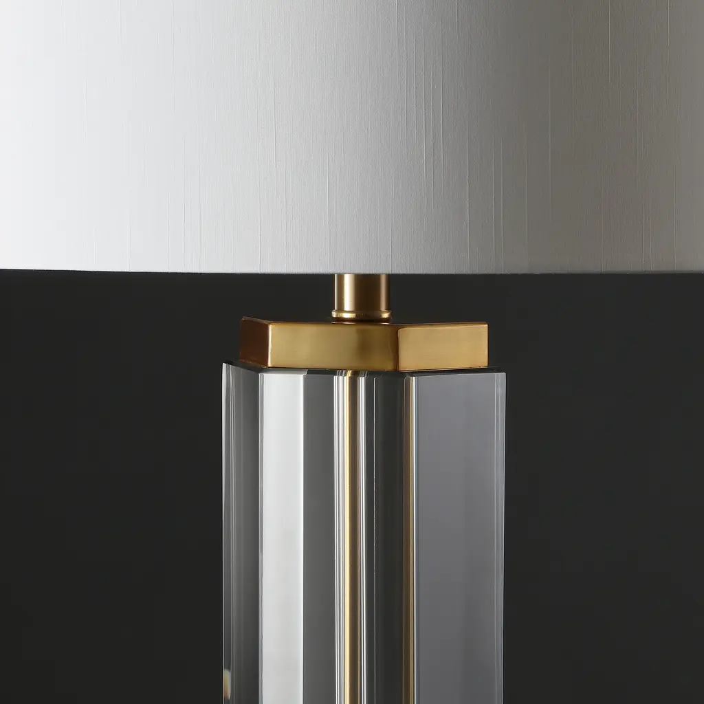 Refresh any room with this ravishing Roshan Table Lamp. Expertly handmade of finely sculpted crystal in an eye-catching hexagon pillar, Roshan's clean straight lines are beautifully balanced by the curve of its crisp white drum shade. Shimmering gold hardware adds a touch of star quality.