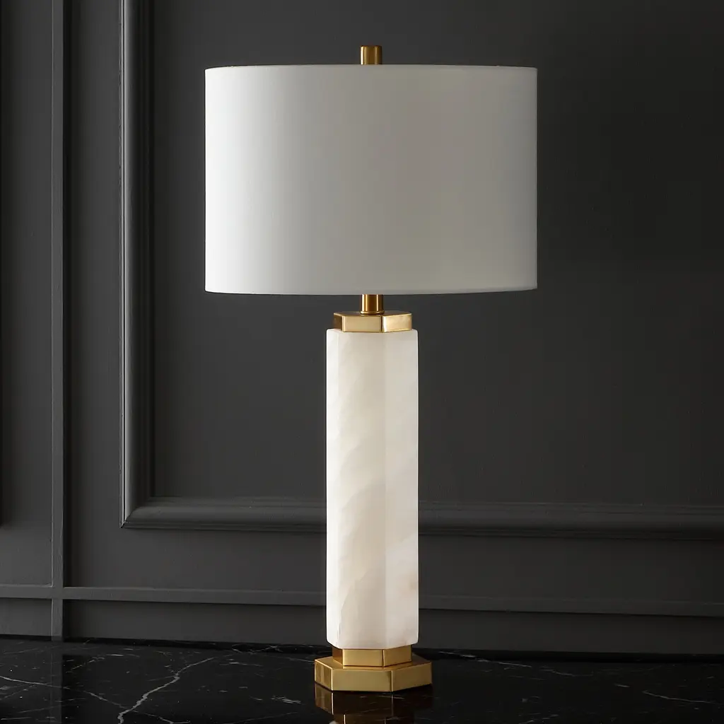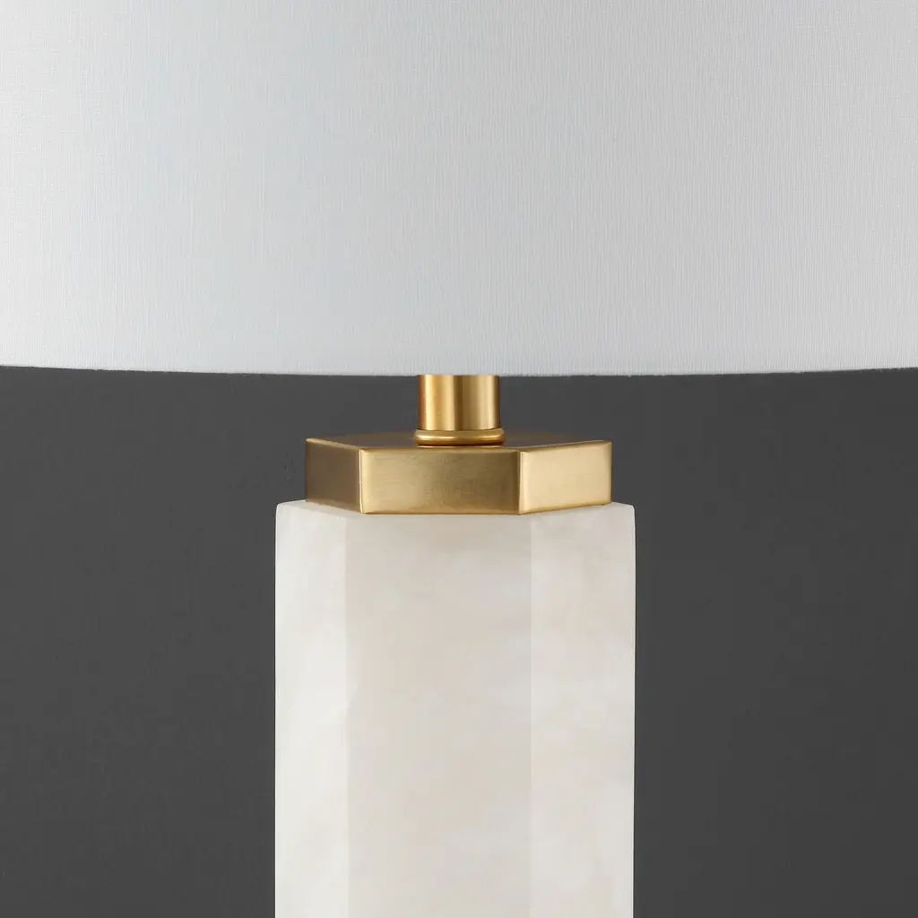 An exercise in exquisite taste, this Lynsey Table Lamp is the perfect finishing touch to any chic décor. Lynsey's handmade white alabaster body abounds with modern glamour, and its gold metal details further enhance its alluring appeal.