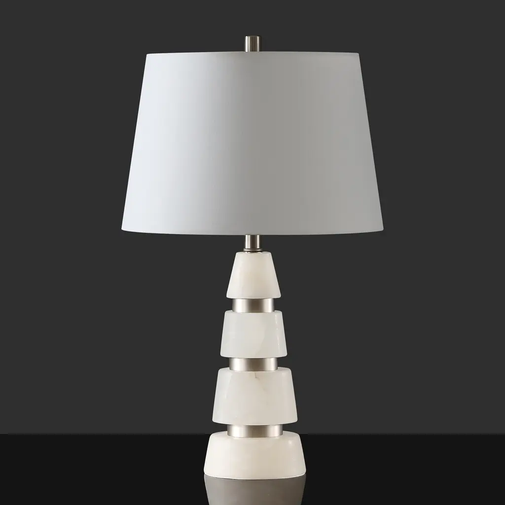 Abounding with contemporary charisma, this Zhang Table Lamp is a stellar standout in any room. Zhang's four elongated cylindrical tiers of hand-sculpted white alabaster and stepped gold accents exude a decadently dramatic sense of motion, while its tapered drum shade further highlights the decorative depth of its conic silhouette.
