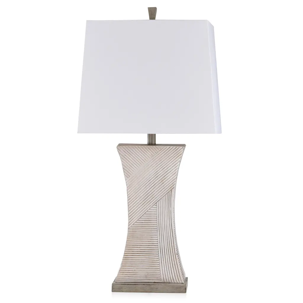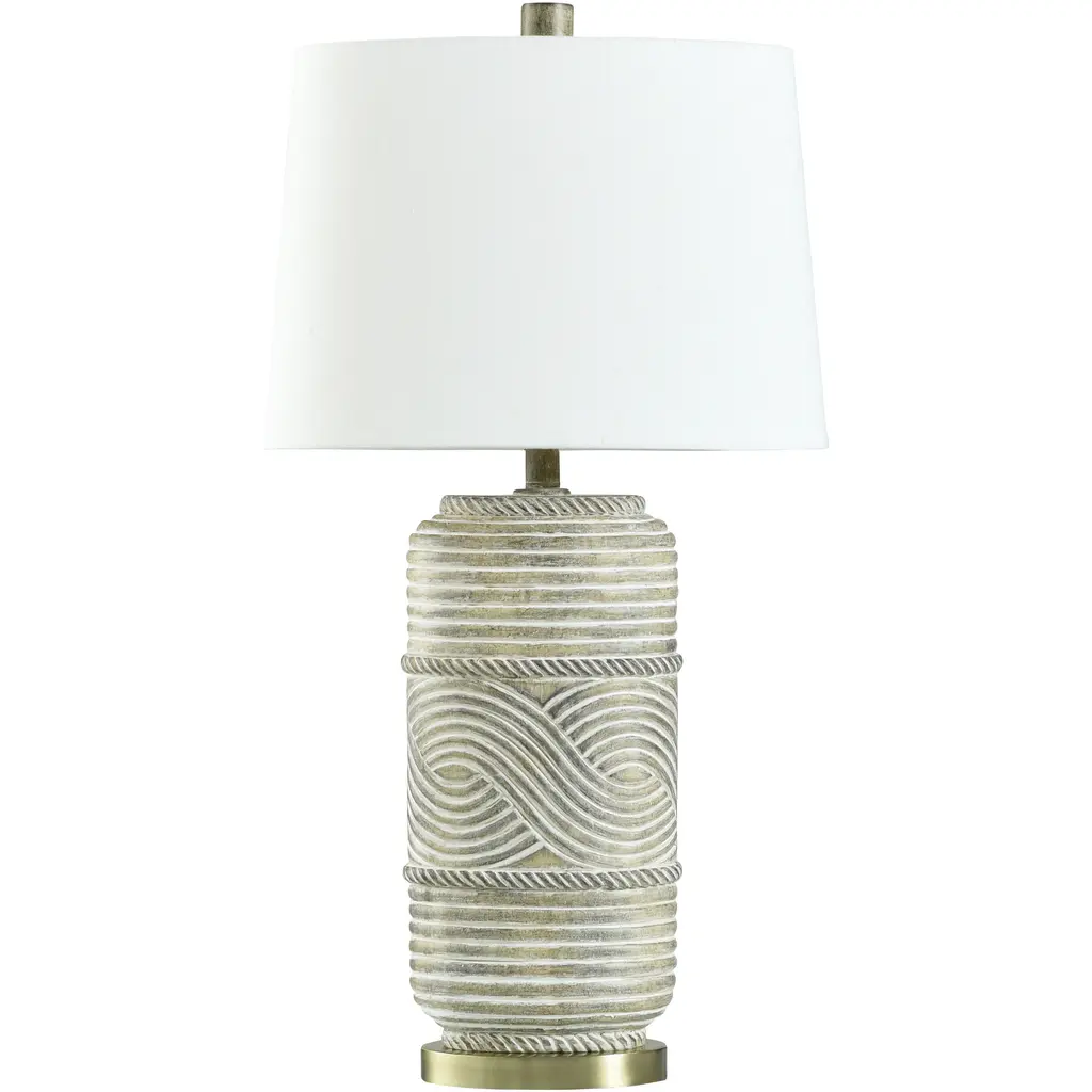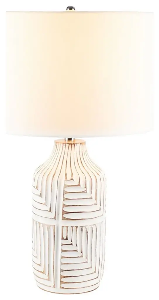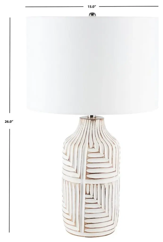 Ancient craftsmanship is recreated in this distinguished Dione Table Lamp. Celebrating the legacy of hand-carved vessels, Dione''s etched angled details beautifully offset the subtle curves of its ivory painted wood base.Lamp Certified: ULType of bulb included: INCANDESCENTNumber of bulb(s) included: 1Max Wattage :150Light Bulb Base Type: E26 Screw Terminal