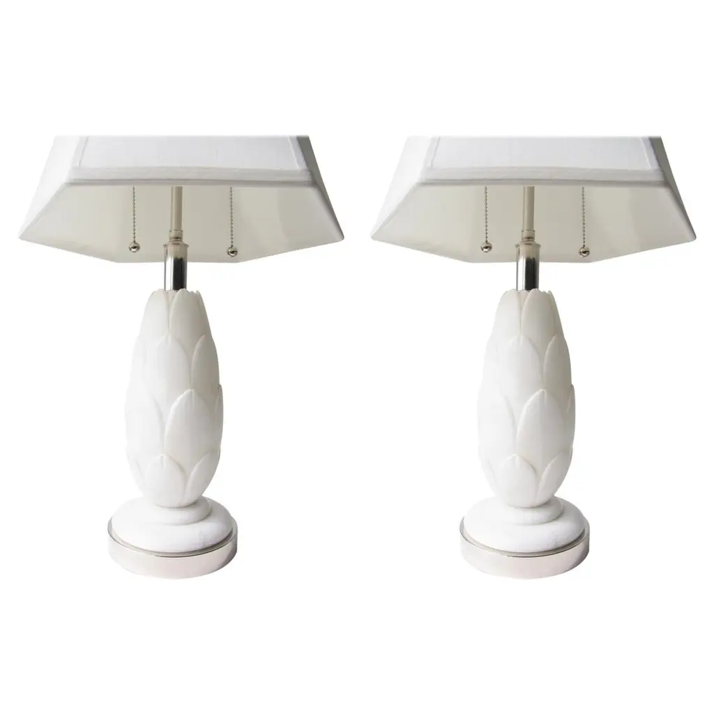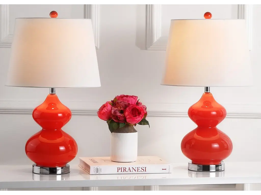 Illuminate your living room, bedroom or family room in a contemporary way with this double gourd table lamp. Shapely glass base is topped with a clean and simple white fabric shade for a fresh complement. Sold as a set of two.