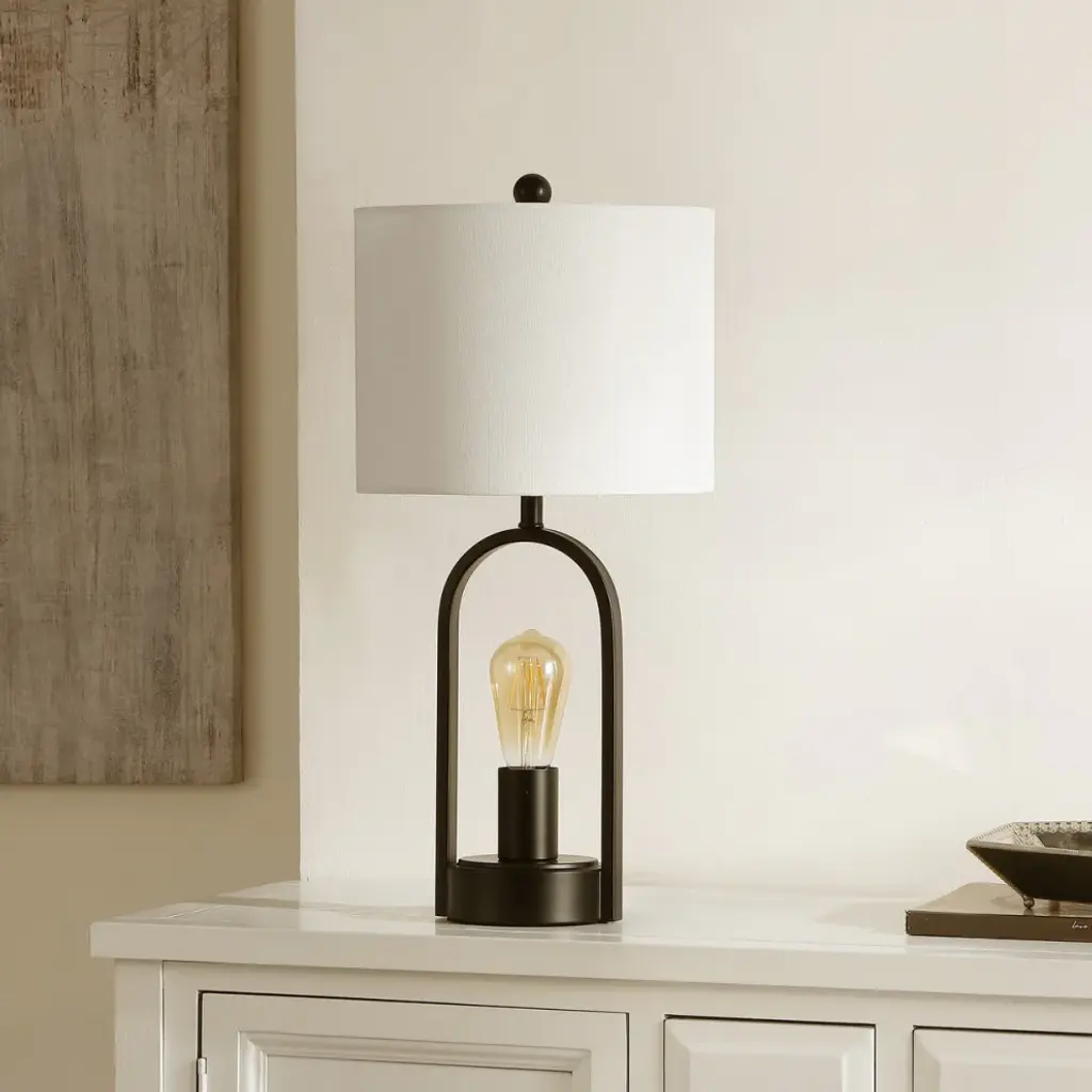 Add the perfect touch of light to your home with our sleek and elegant Faust table lamp. Effortlessly integrating two bulbs within a minimalistic profile, our table lamp lends elevated style and functionality to any room. The lamp utilizes a sleek arch to beautifully frame an upright bulb. Its refined and elegant appeal is accentuated with a black metallic finish. Completed with a white drum shade, the table lamp provides ample light to brighten up your nightstand, end table, or console.