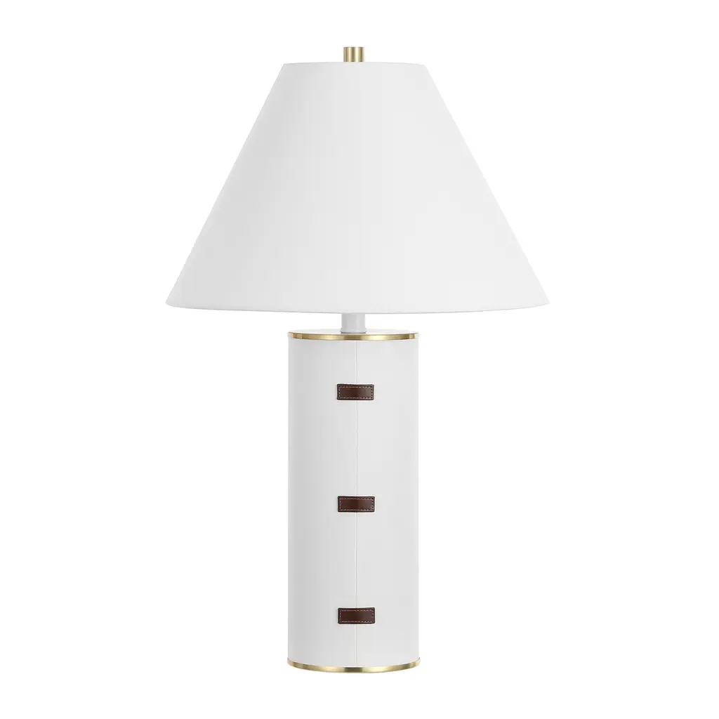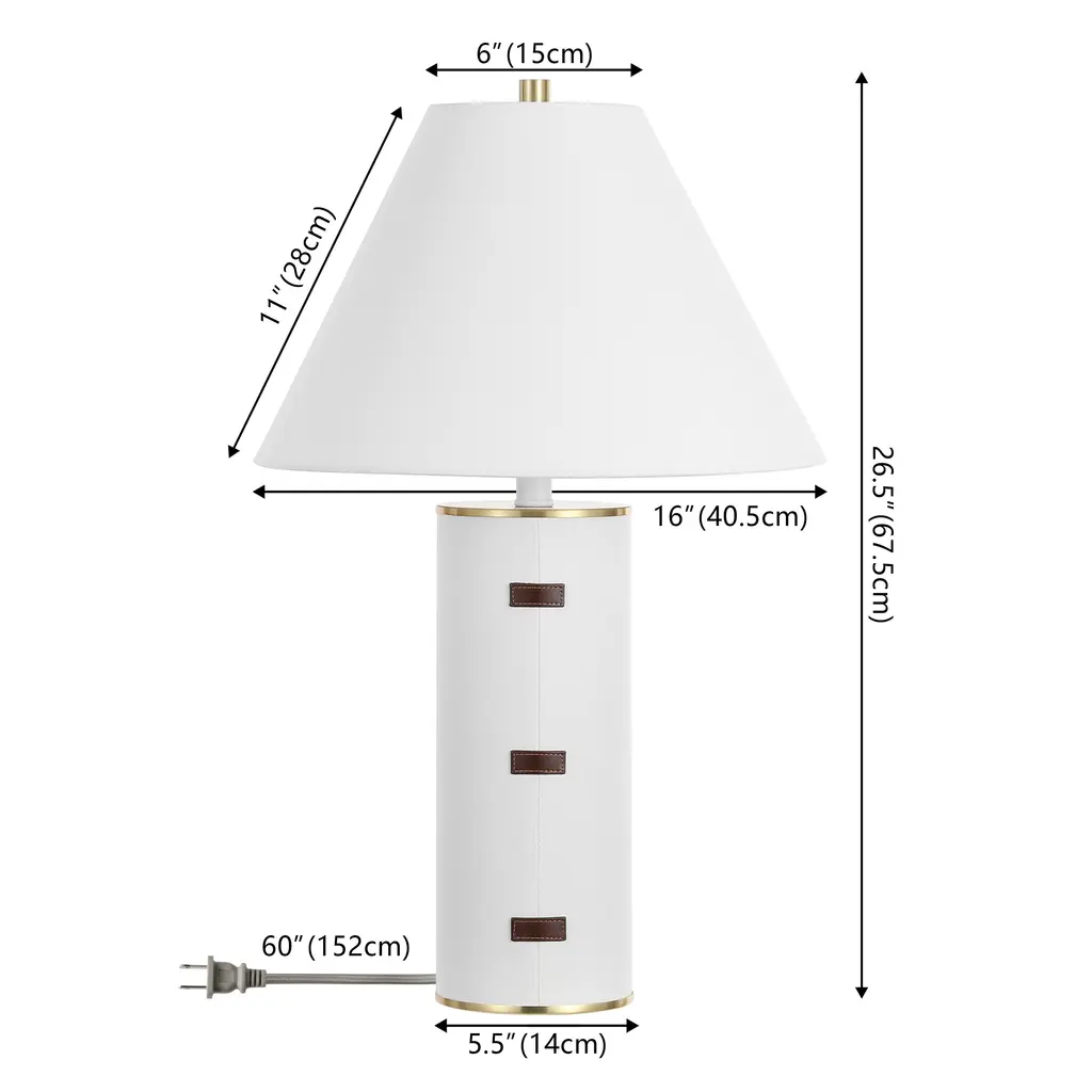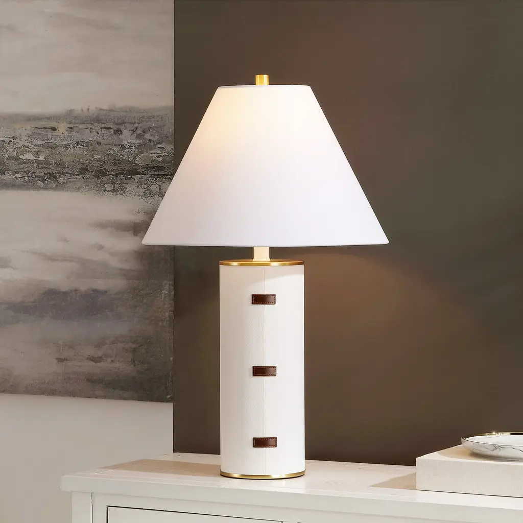 Perfect for reading, creating ambient light, or simply as a decorative piece, the Flavie Table Lamp is a sleek and modern addition to any interior decor. Boasting a chic color palette, this lamp is designed to complement a variety of room styles with a touch of sophistication. Crafted from a harmonious blend of metal and faux leather on the body, paired with a smooth fabric shade, the Flavie Table Lamp brings both functionality and elegance to your space.
